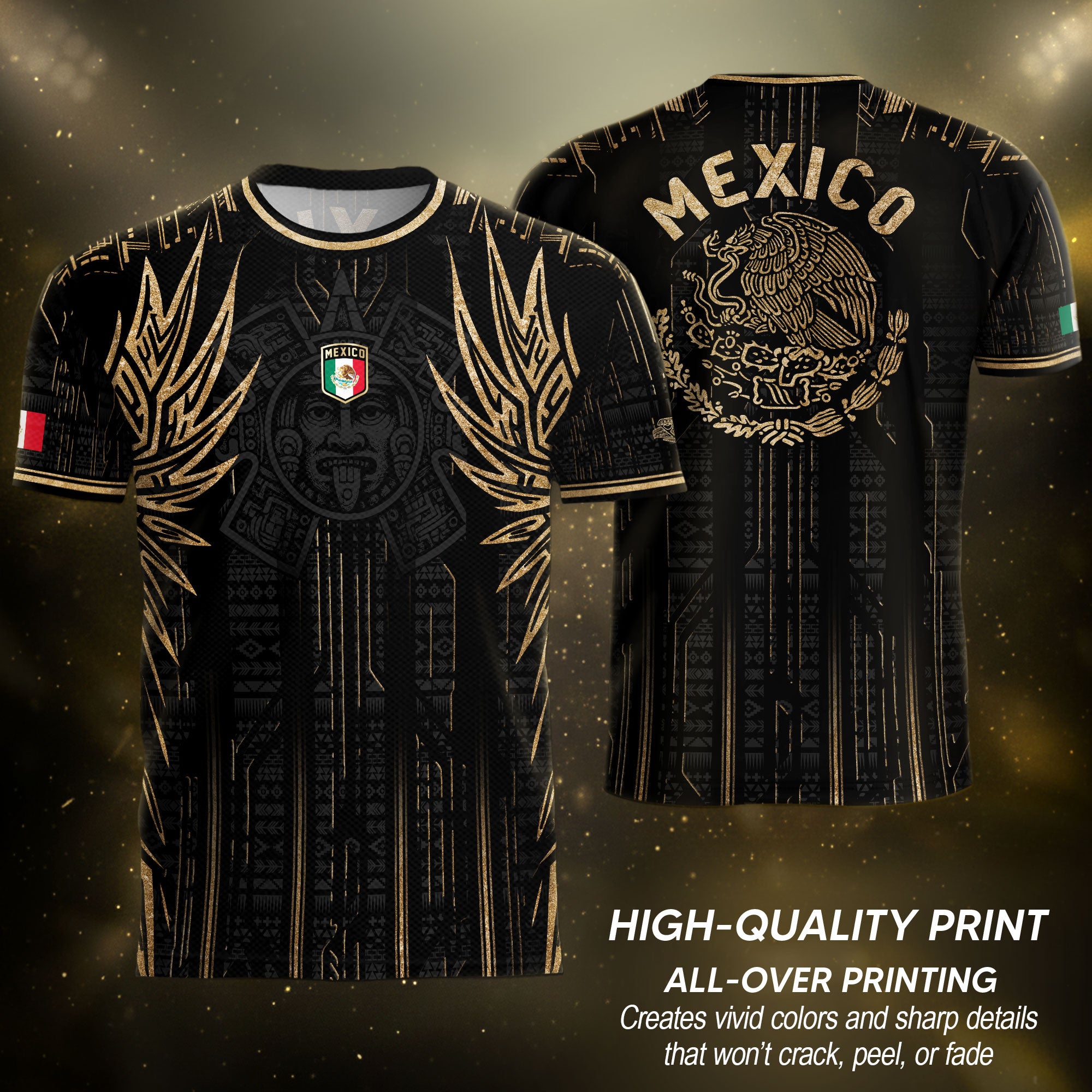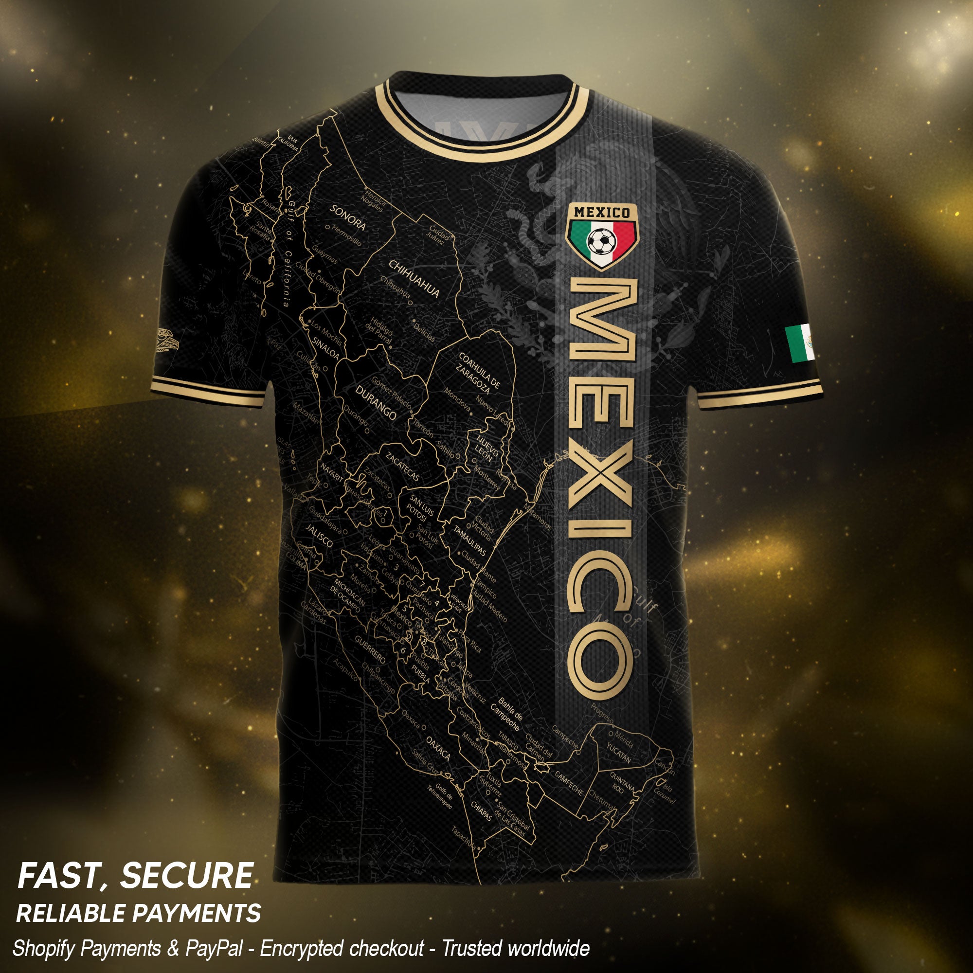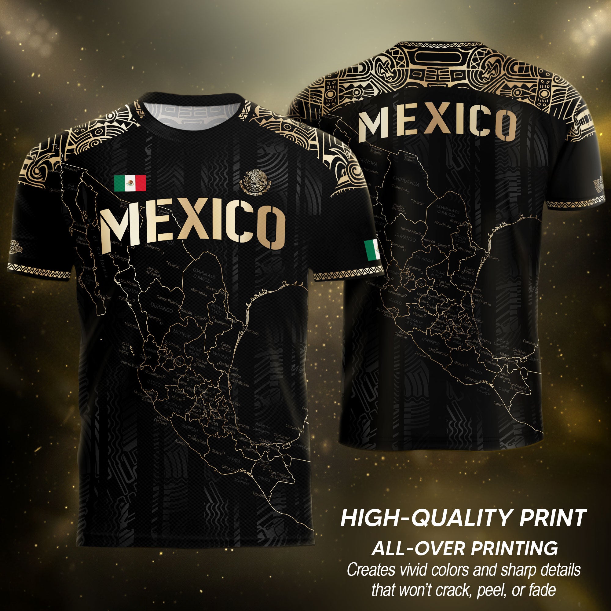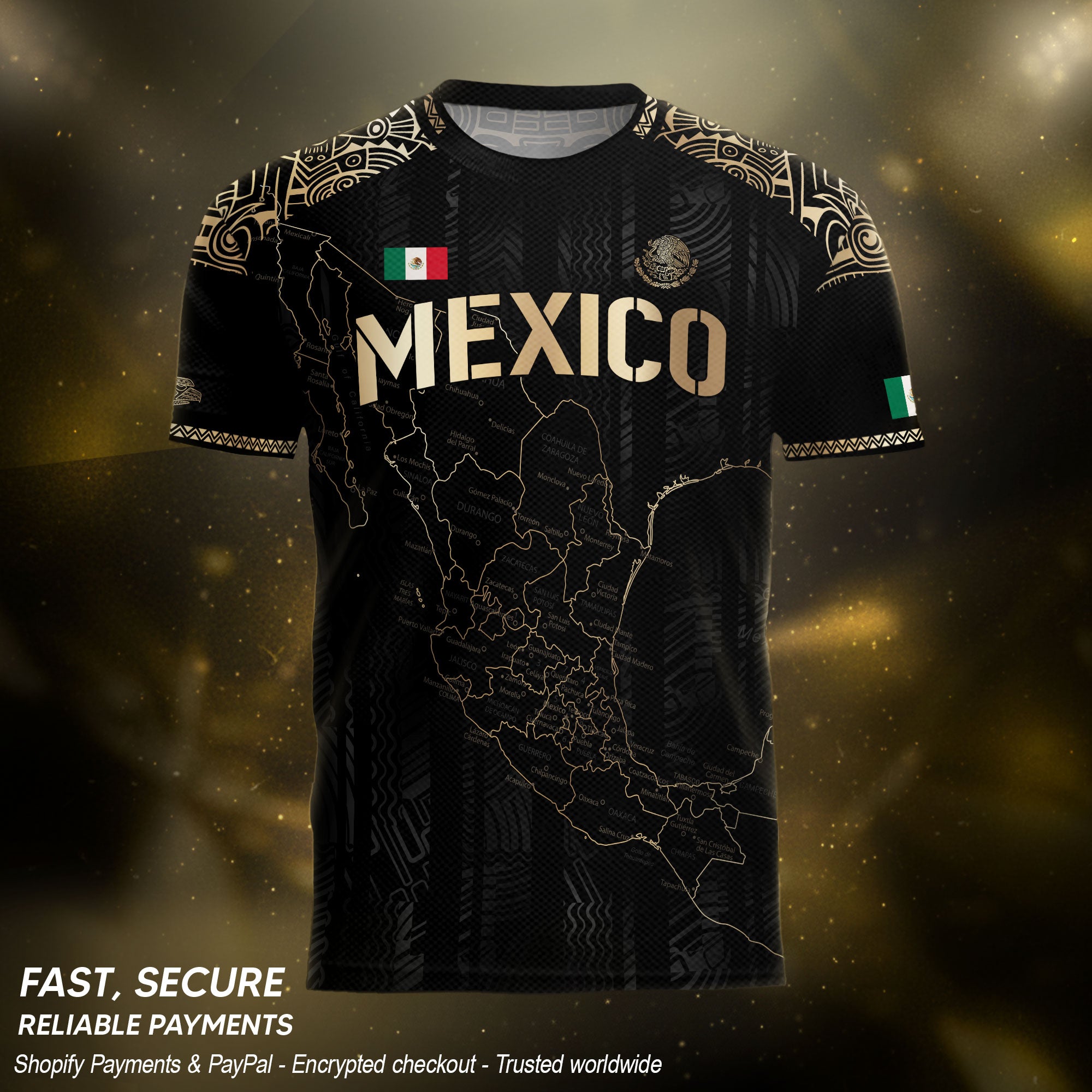 Mexico Black Heritage Map Soccer Jersey with Golden Aztec Accents$25.99 USD$30.99 USD