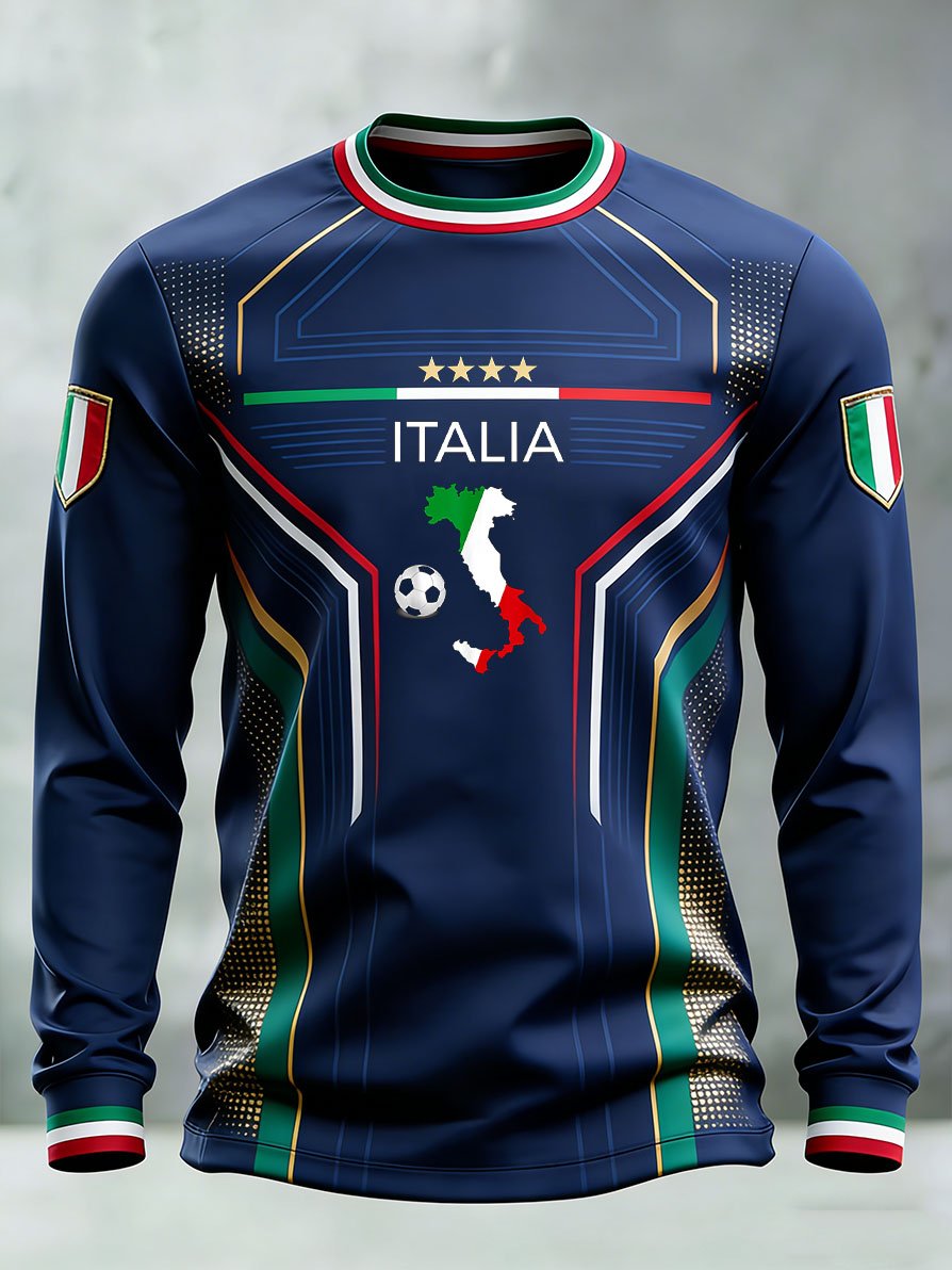 Men's Fashion Italian Football Team Fan Print Crew Neck Long-Sleeve T-Shirt