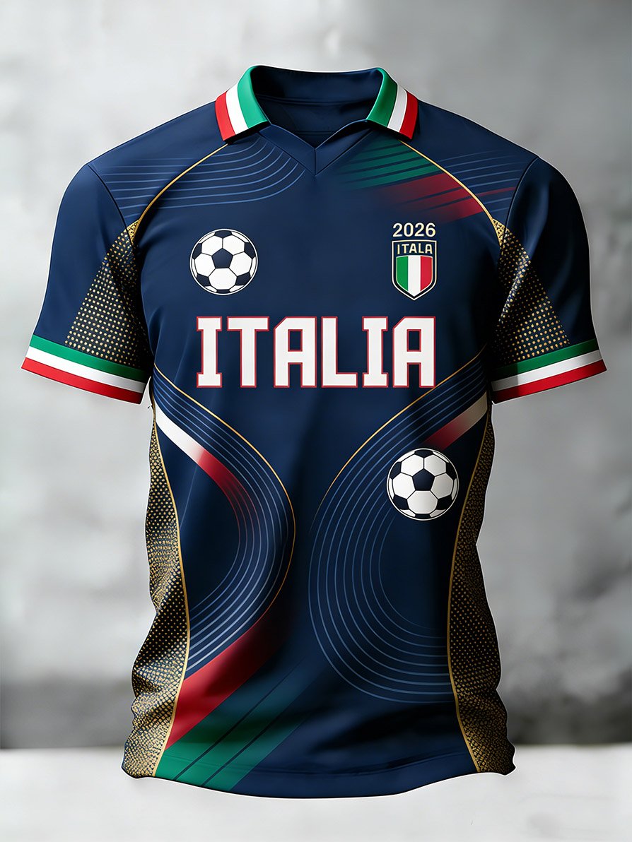 Men's Fashion Italian National Football Team Fan Print Lapel V-Neck Short-Sleeve T-Shirt
