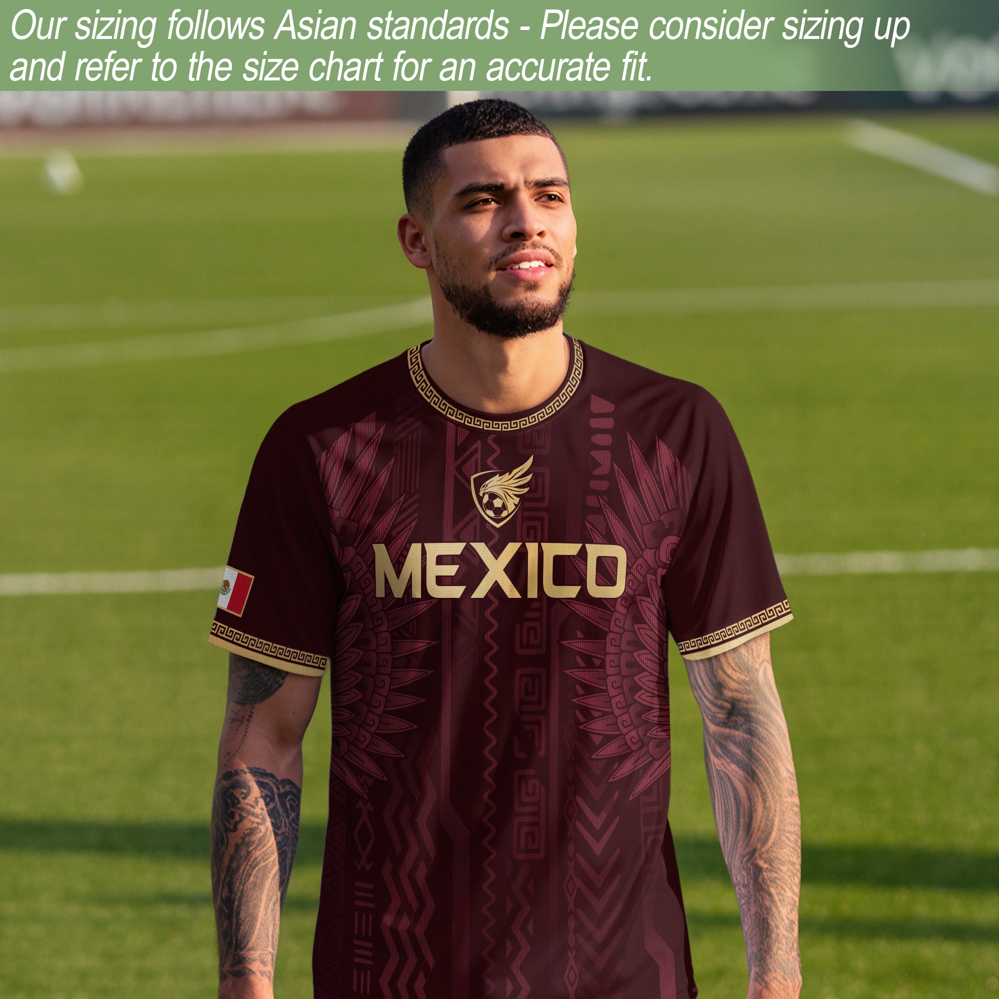 Represent Mexican heritage with this Maroon Gold Aztec Soccer Jersey inspired by ancient civilization and national pride. Made from high-quality polyester that is soft, lightweight, breathable, and quick-drying, it offers comfort and durability for sports, fan wear, and everyday activities.