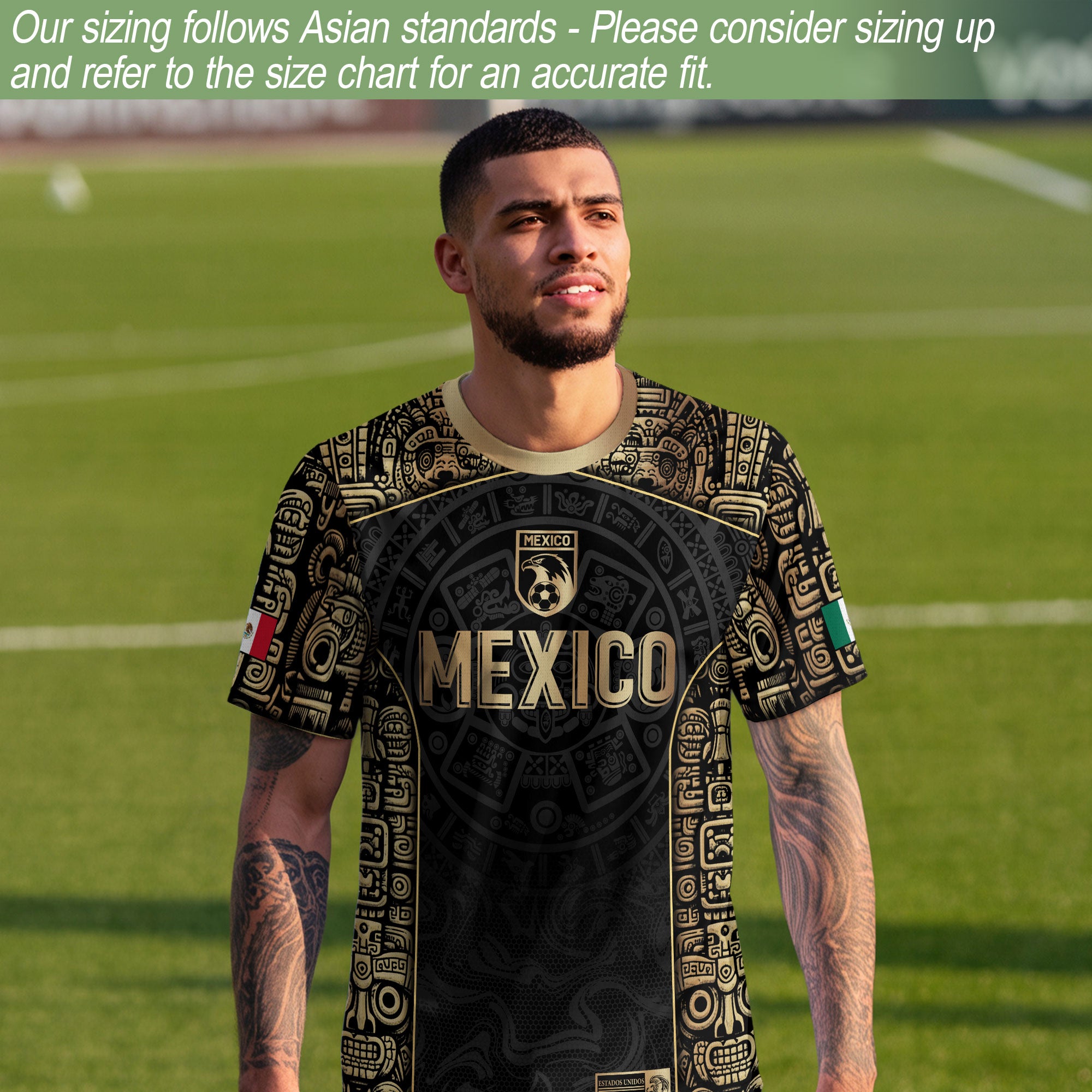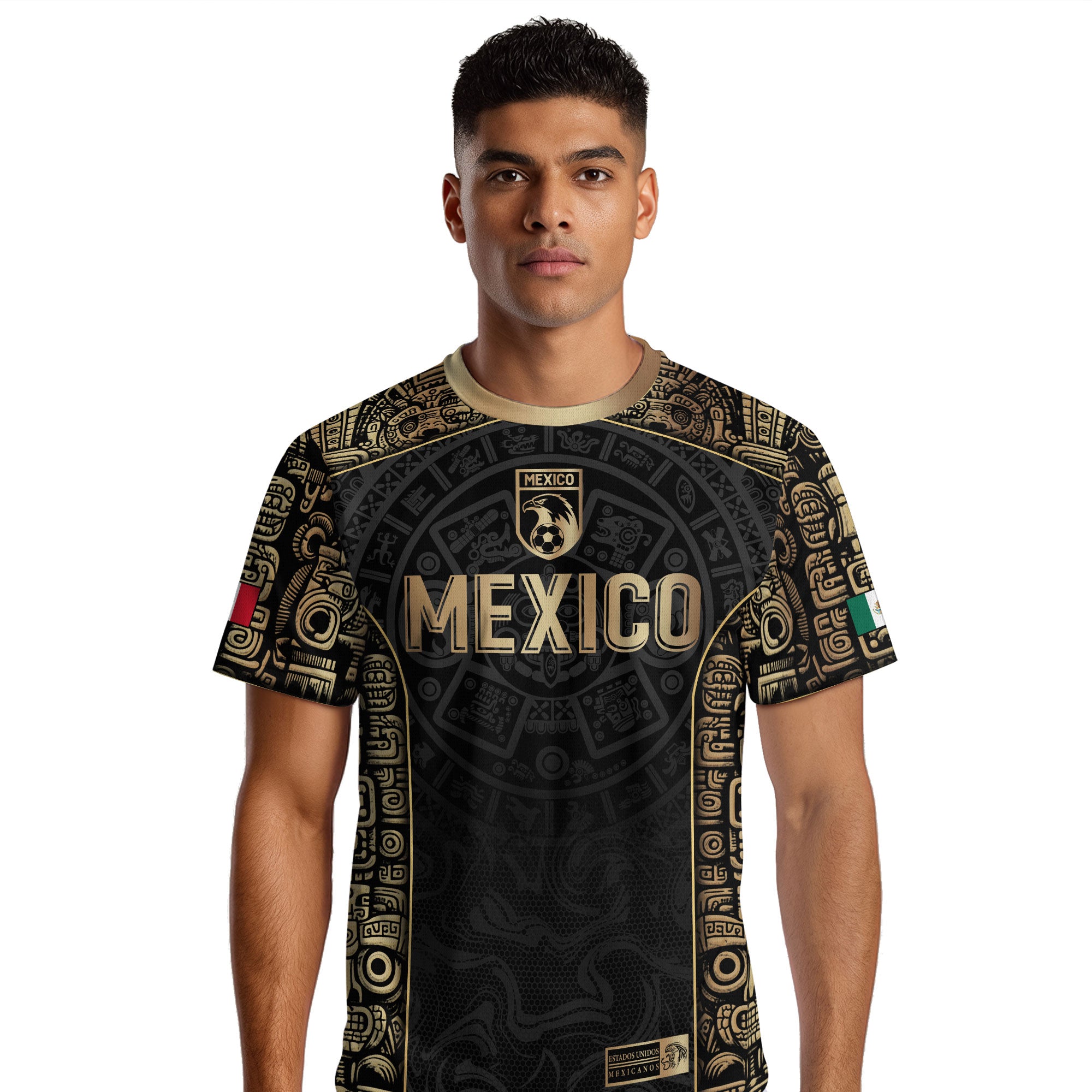 Honor Mexico’s heritage with this Black Gold Limited Edition Aztec Jersey featuring a bold Eagle pattern and premium metallic details. Made from high-quality polyester that is soft, lightweight, breathable, and quick-drying, this jersey delivers comfort and performance for games, training, and everyday wear while showcasing true Mexican pride.