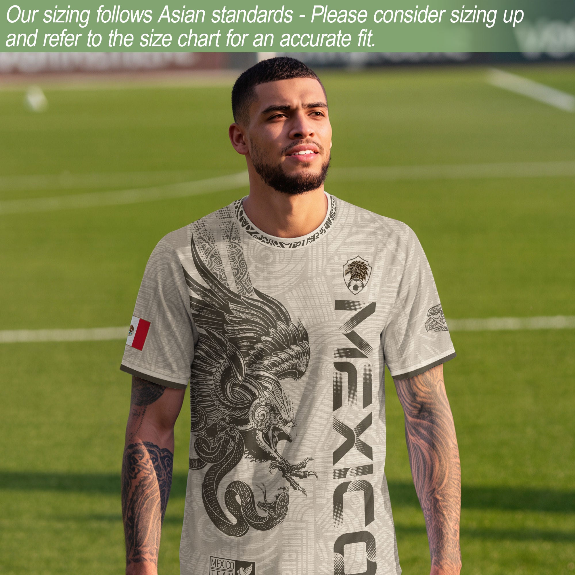 Honor Mexican culture with this beige Aztec eagle design — sleek vertical “Mexico” print, ancient motifs, and lightweight comfort for every fan.