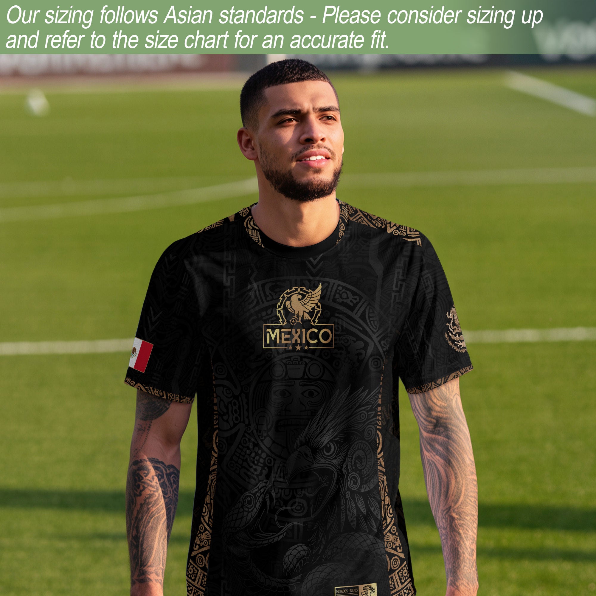 Show your heritage pride with this black Aztec Sunstone eagle jersey — golden details and bold Mexico spirit in every line.