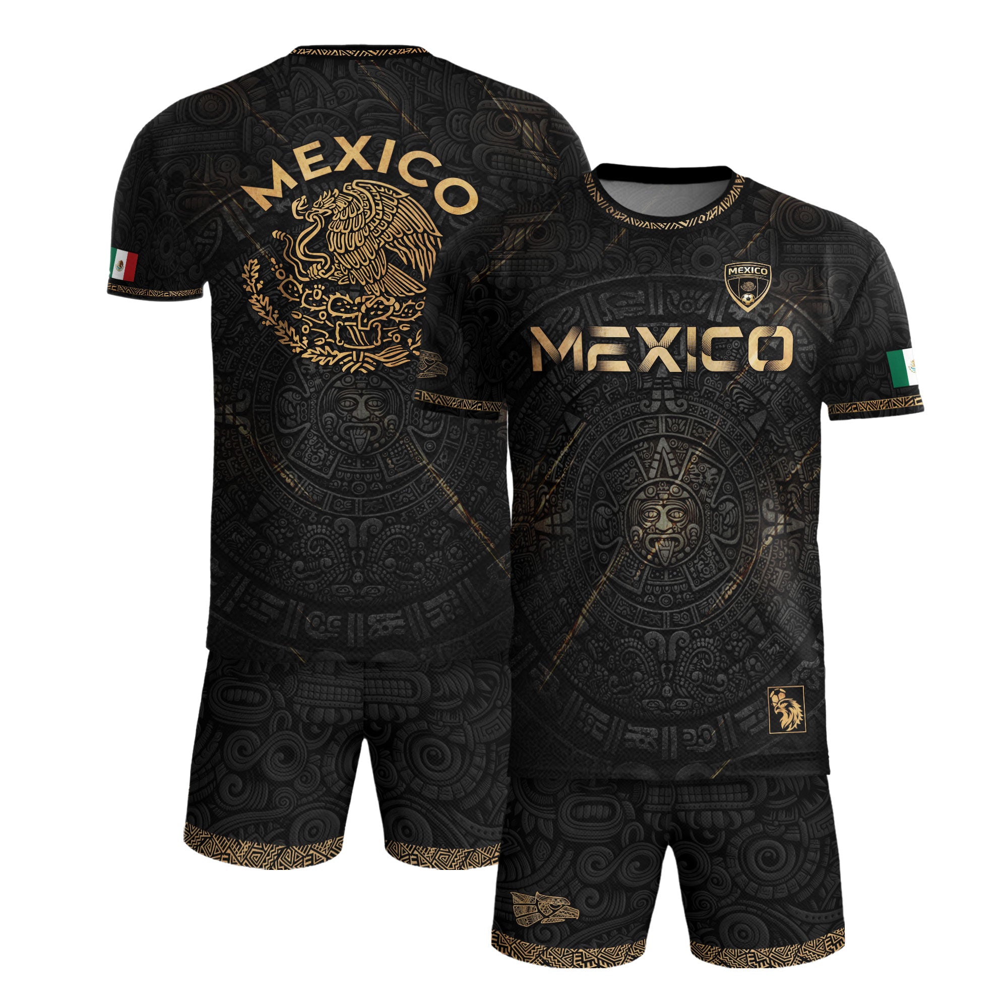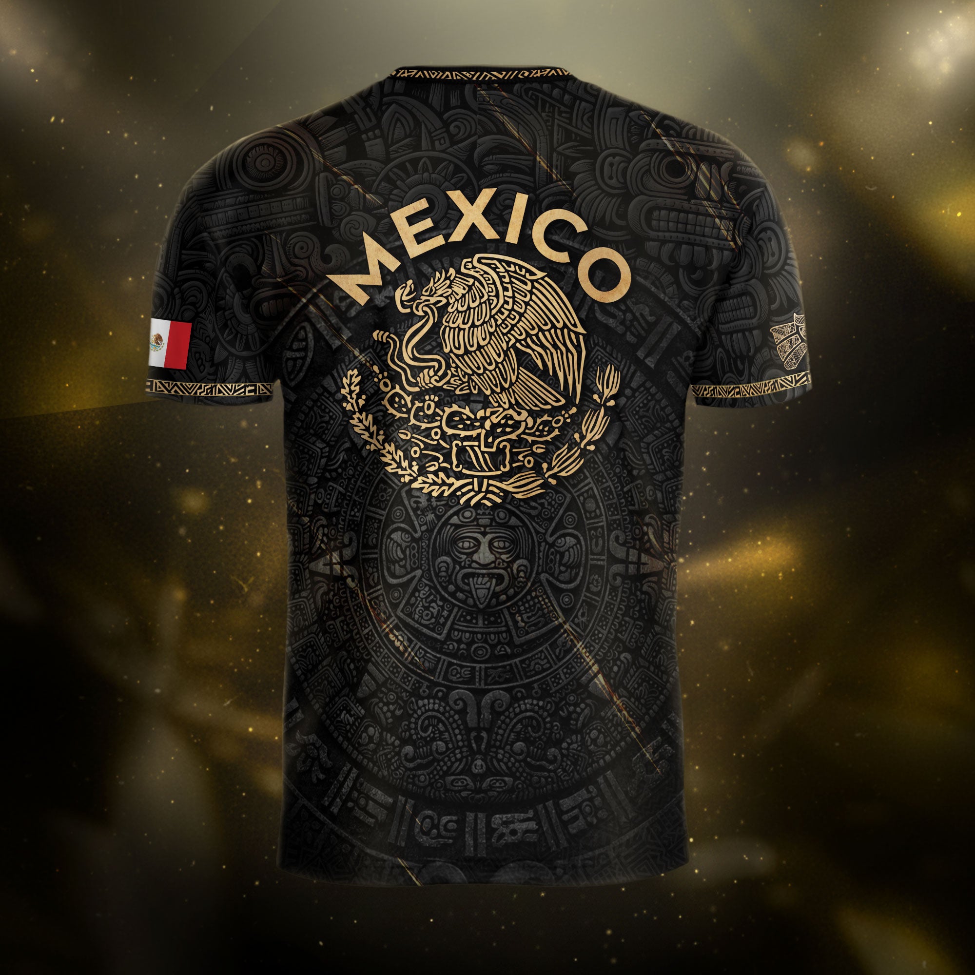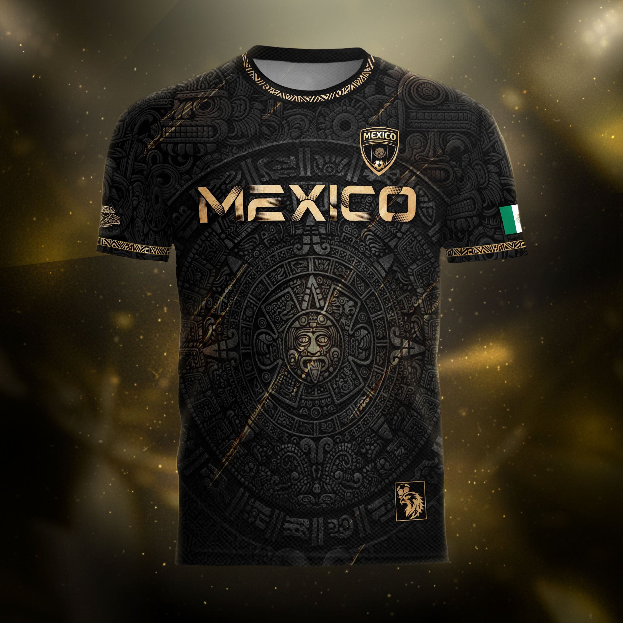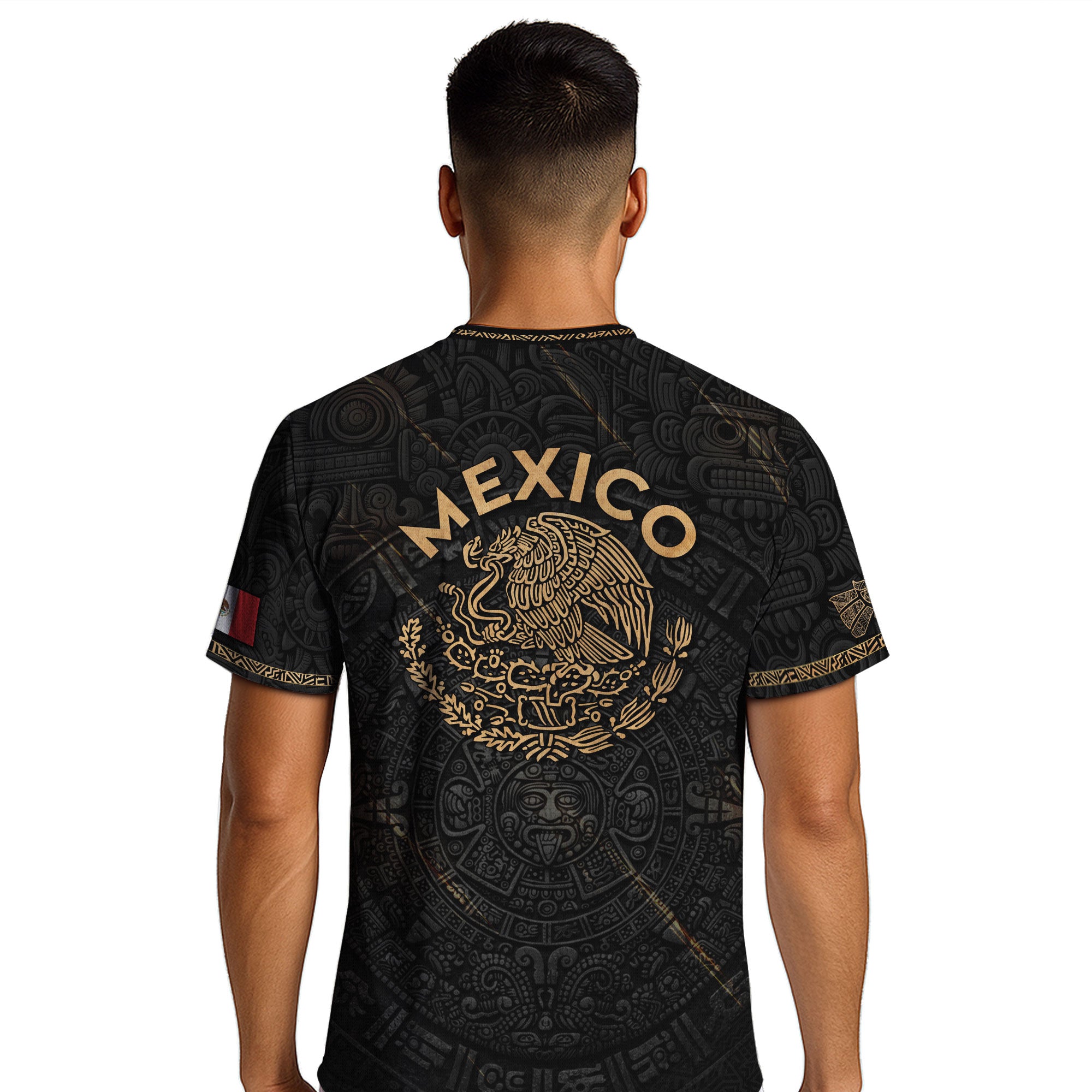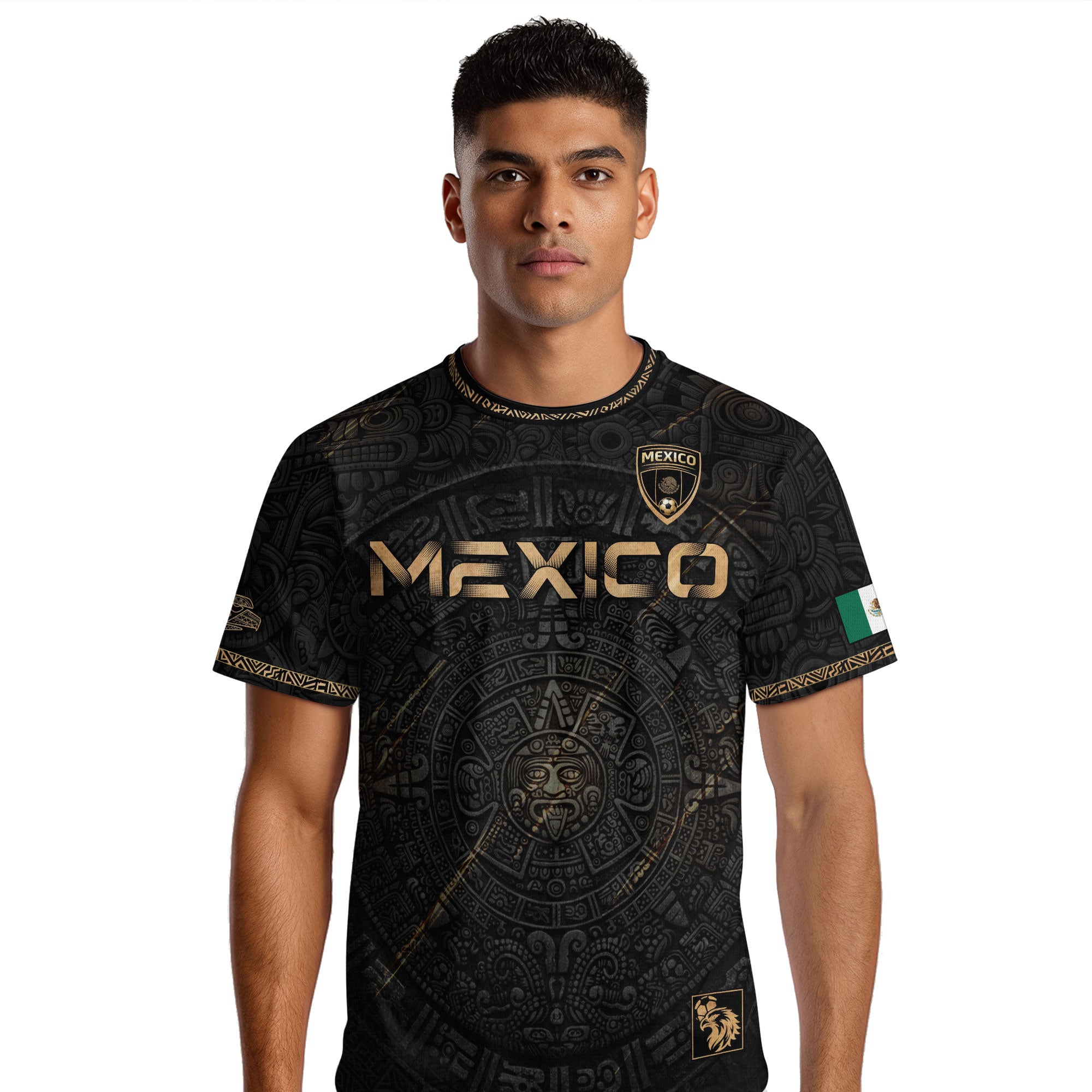 Honor Mexico’s ancient culture with this Black Gold Aztec Calendar Eagle Soccer Jersey featuring iconic heritage symbols and national team spirit. Made from high-quality polyester that is soft, lightweight, breathable, and quick-drying, it provides all-day comfort for training, game days, and casual wear.