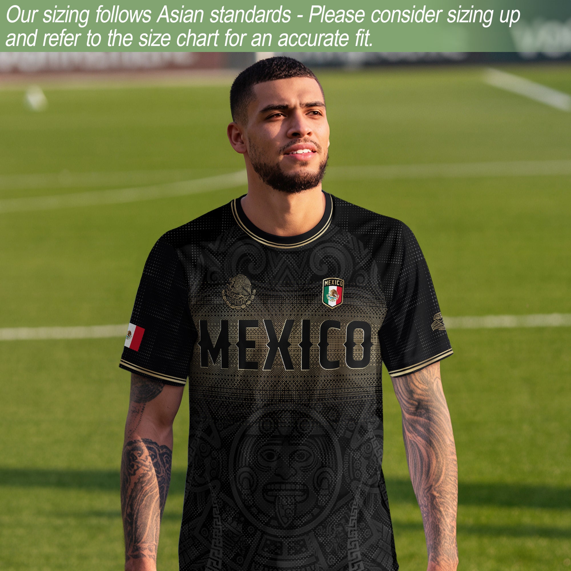 Celebrate ancestral traditions with this Black Gold Aztec Calendar Sun God Soccer Jersey highlighting iconic cultural imagery. Made from high-quality polyester that is soft, lightweight, breathable, and quick-drying, it ensures freedom of movement and lasting comfort.