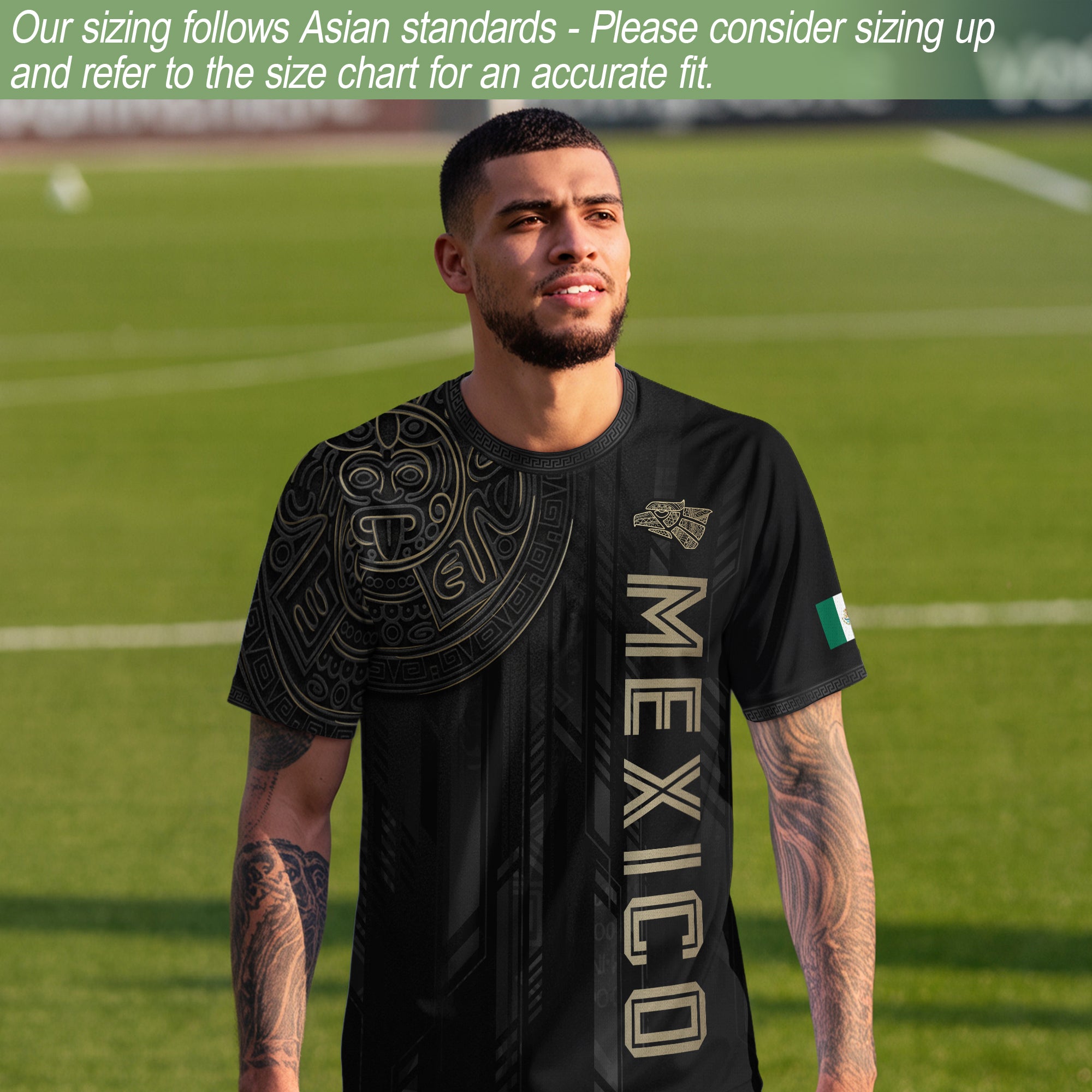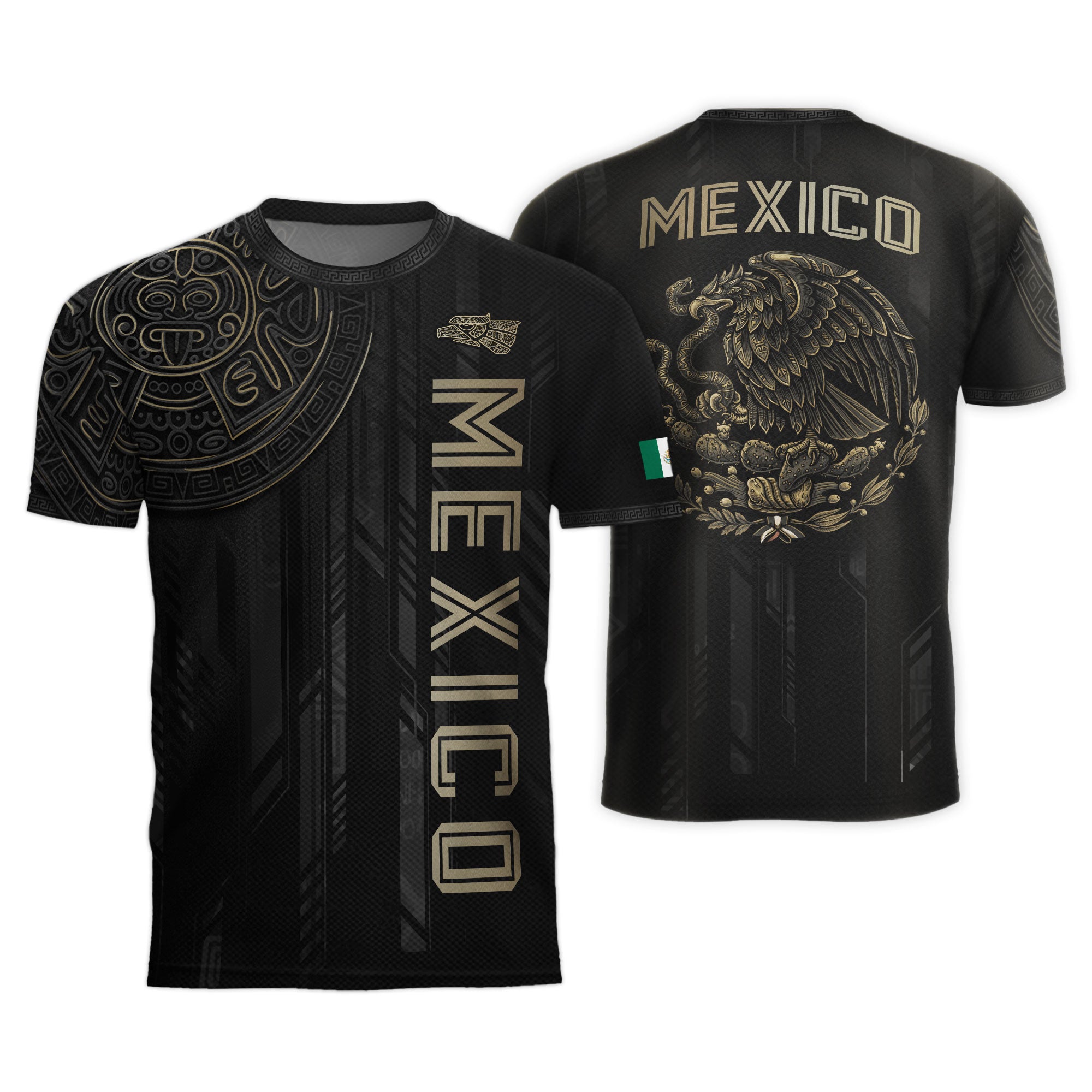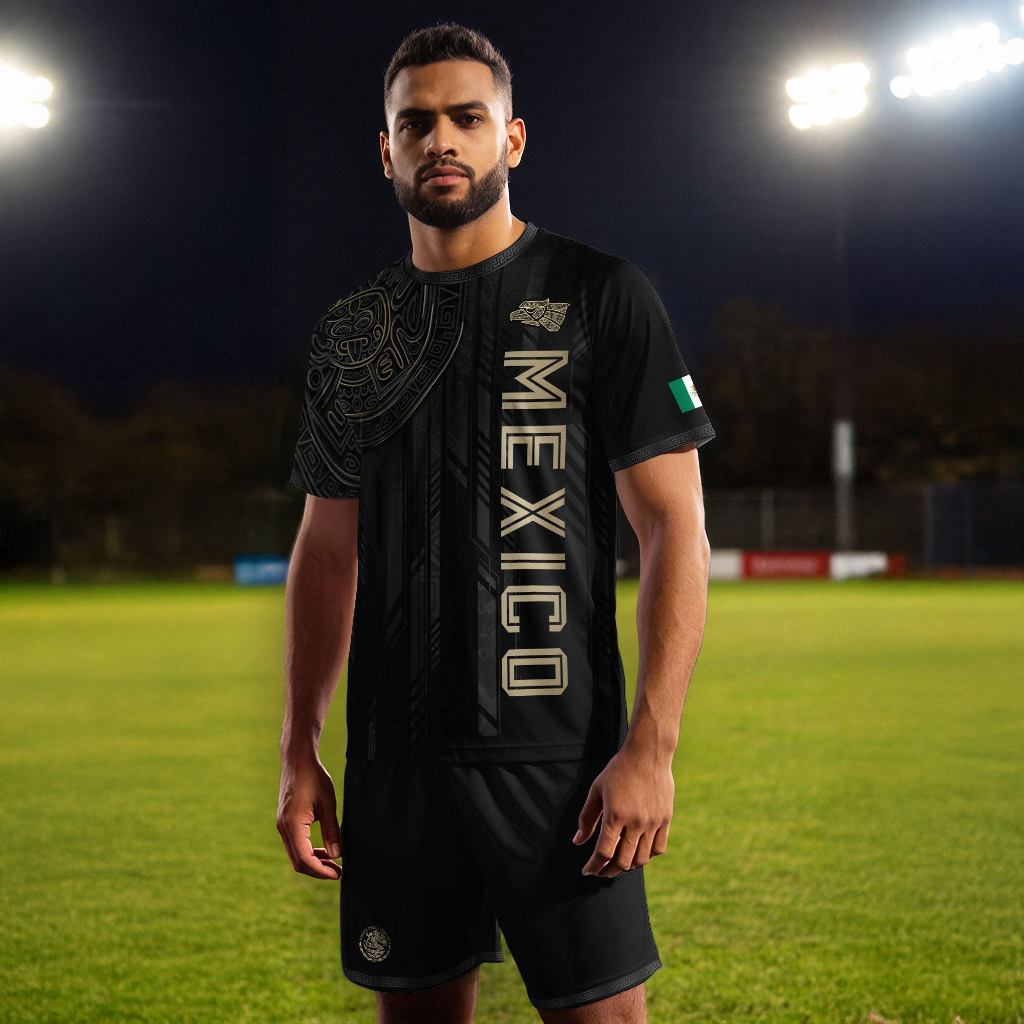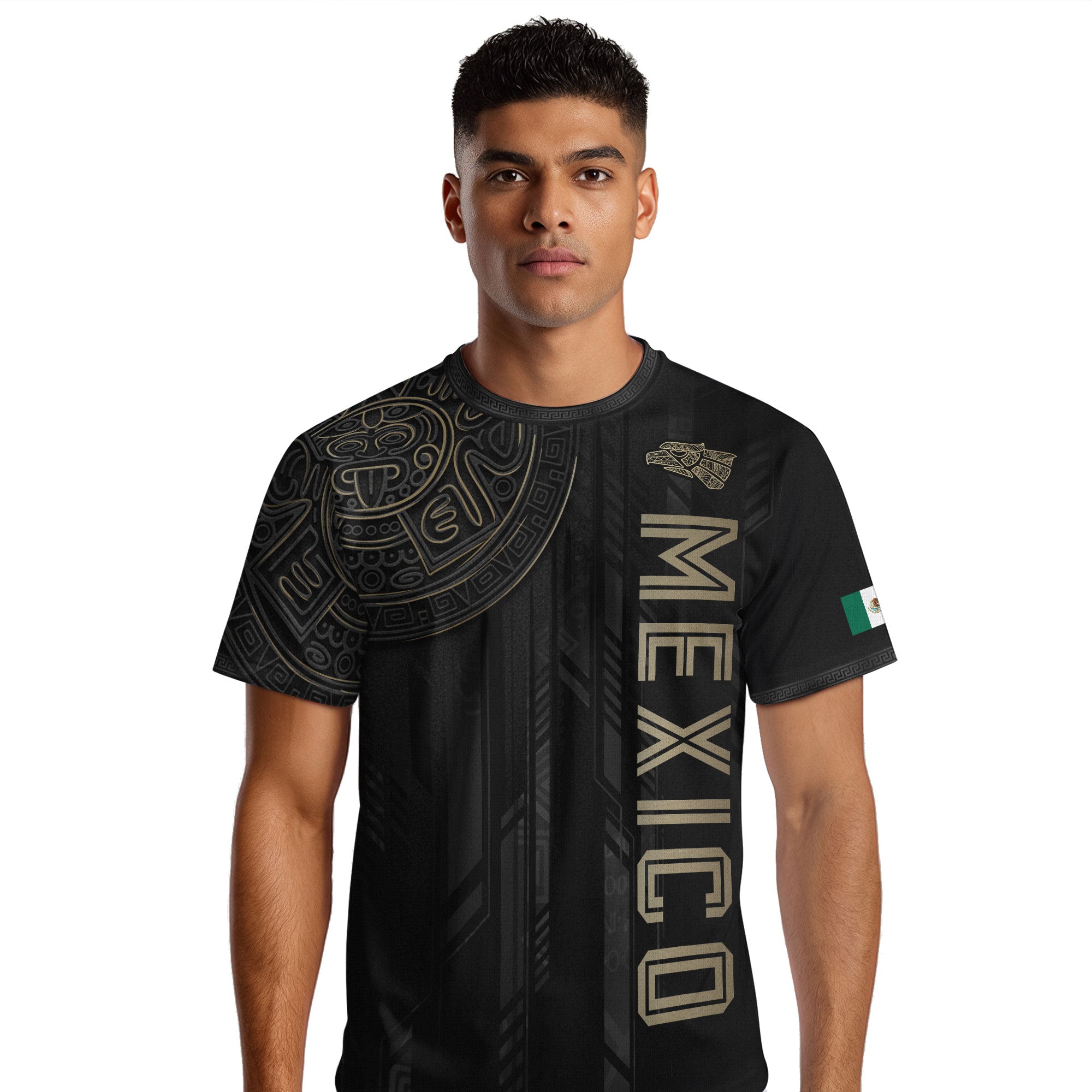Honor Mexico’s ancient culture with this Black Gold Aztec Mayan Calendar Eagle Soccer Jersey featuring powerful heritage symbols. Made from high-quality polyester that is soft, lightweight, breathable, and quick-drying, it offers all-day comfort for training, matches, and casual wear.