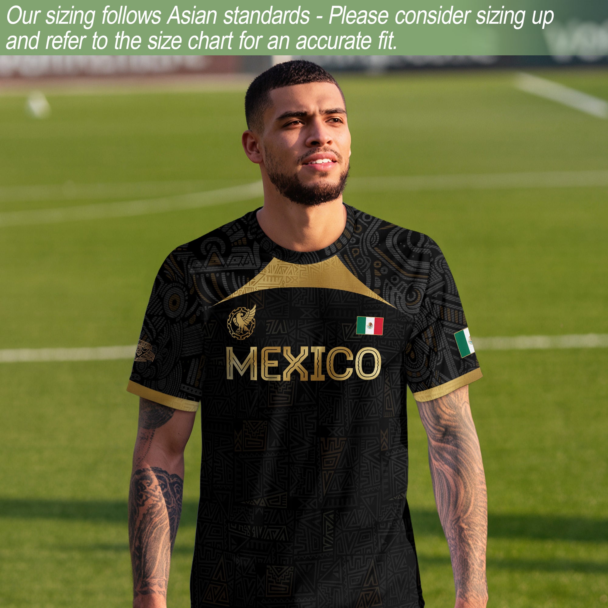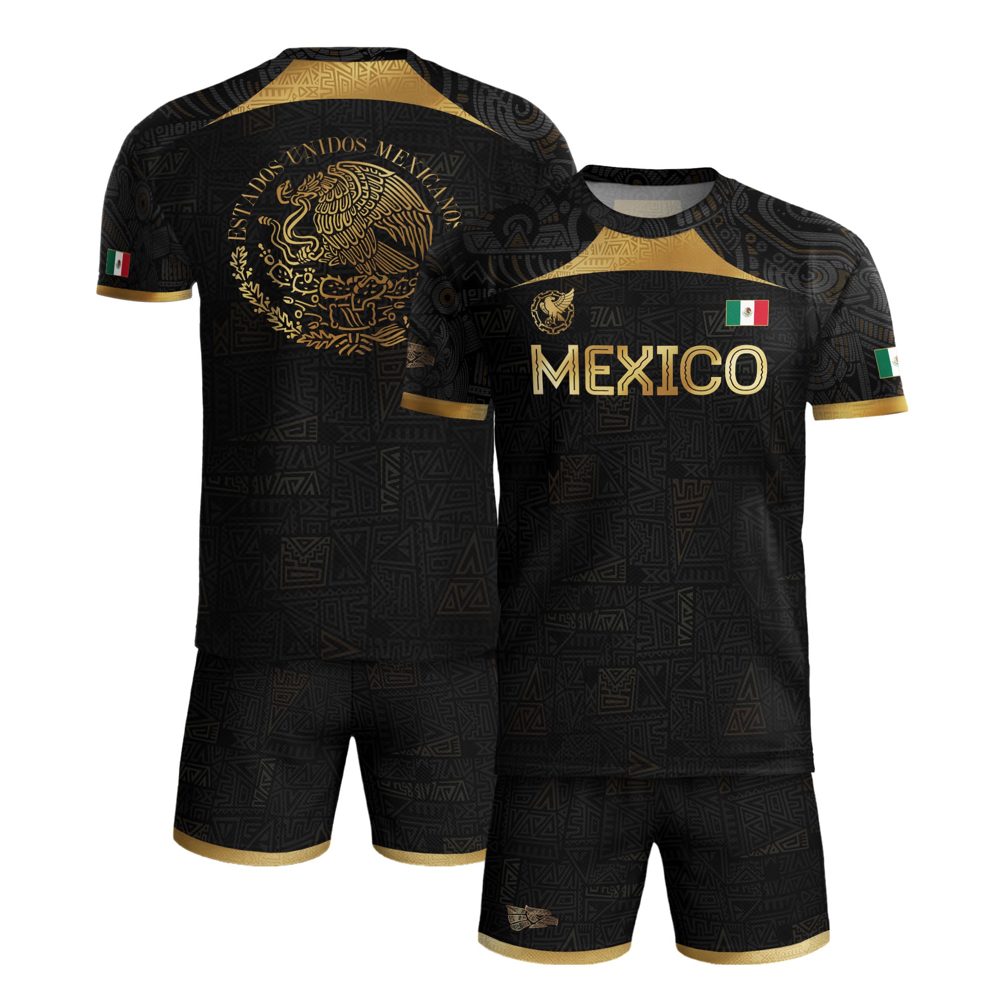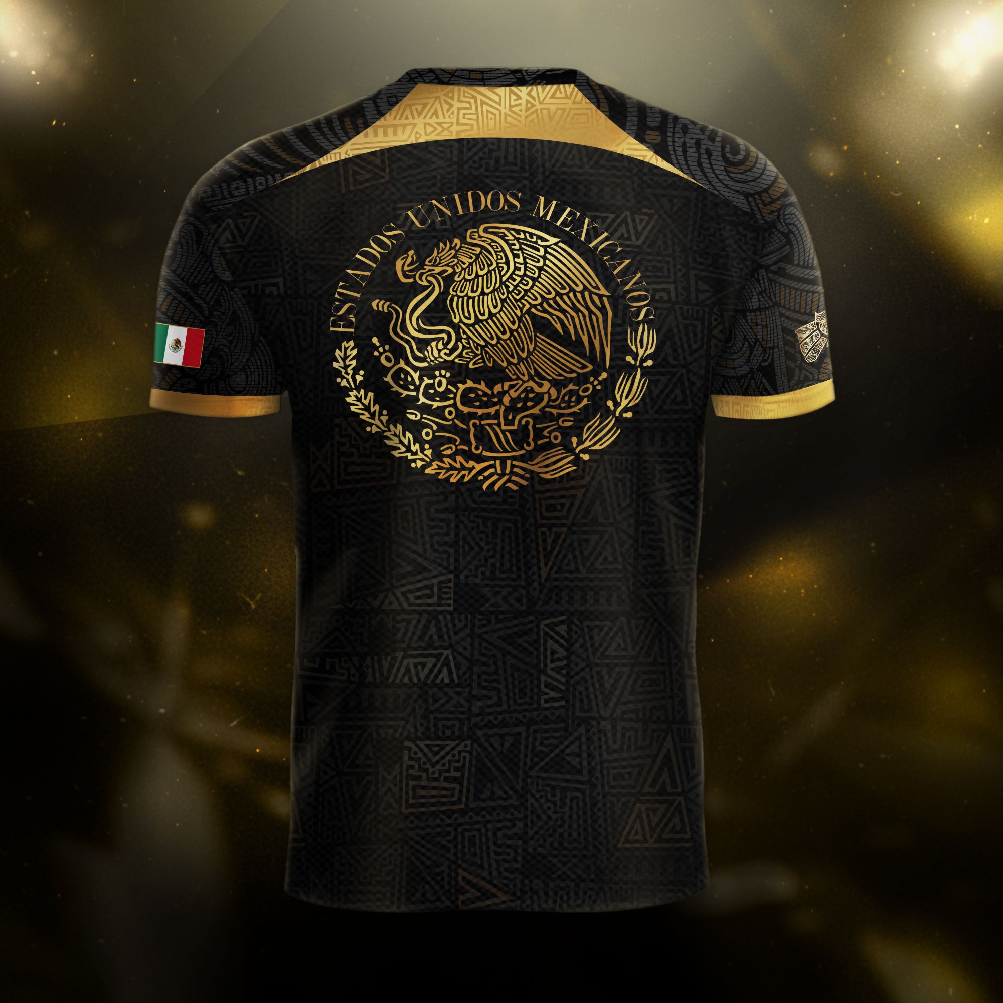A symbol of power and pride — this black and gold soccer jersey showcases Mexico’s Aztec heritage in bold style.