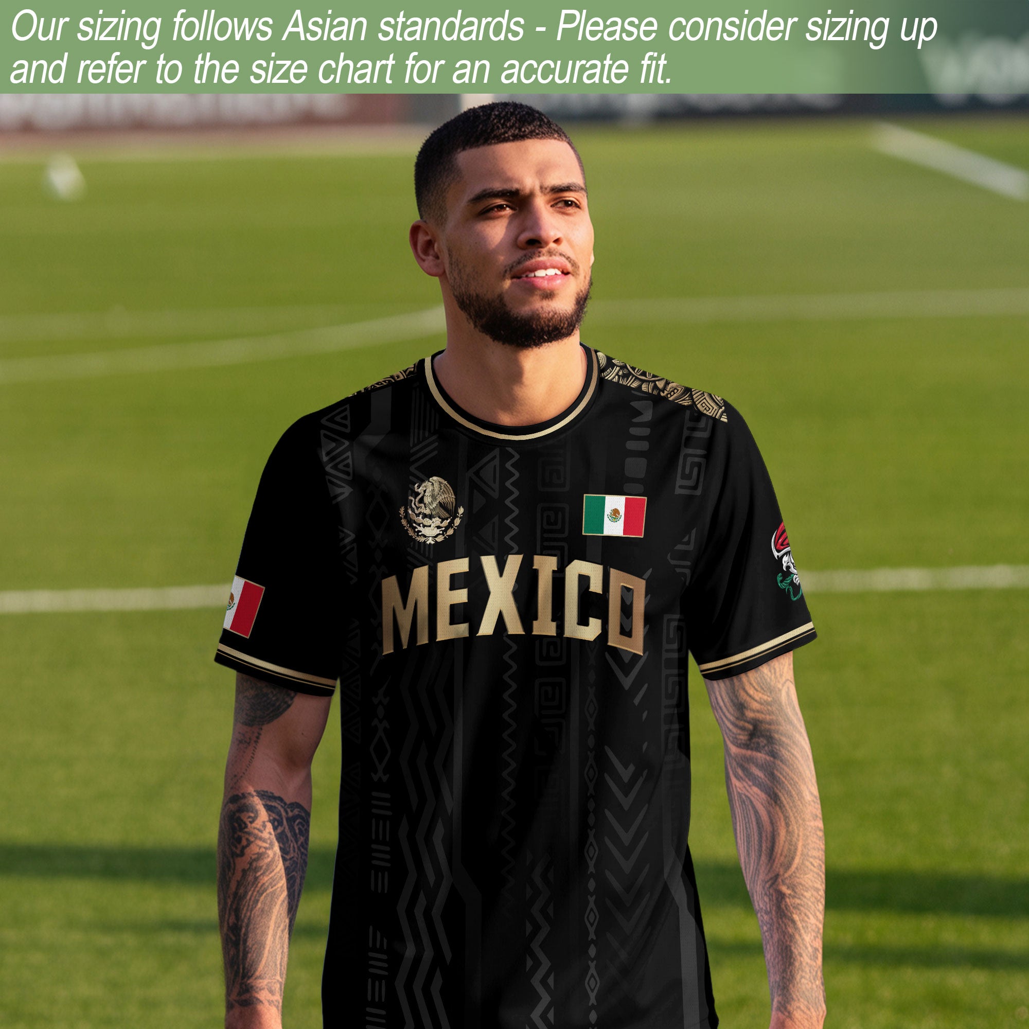 Make a bold statement with this elegant black and gold Mexico soccer jersey. It features prominent 'MEXICO' text on the chest and a stunning gold national emblem on the back. A premium design for the ultimate fan.