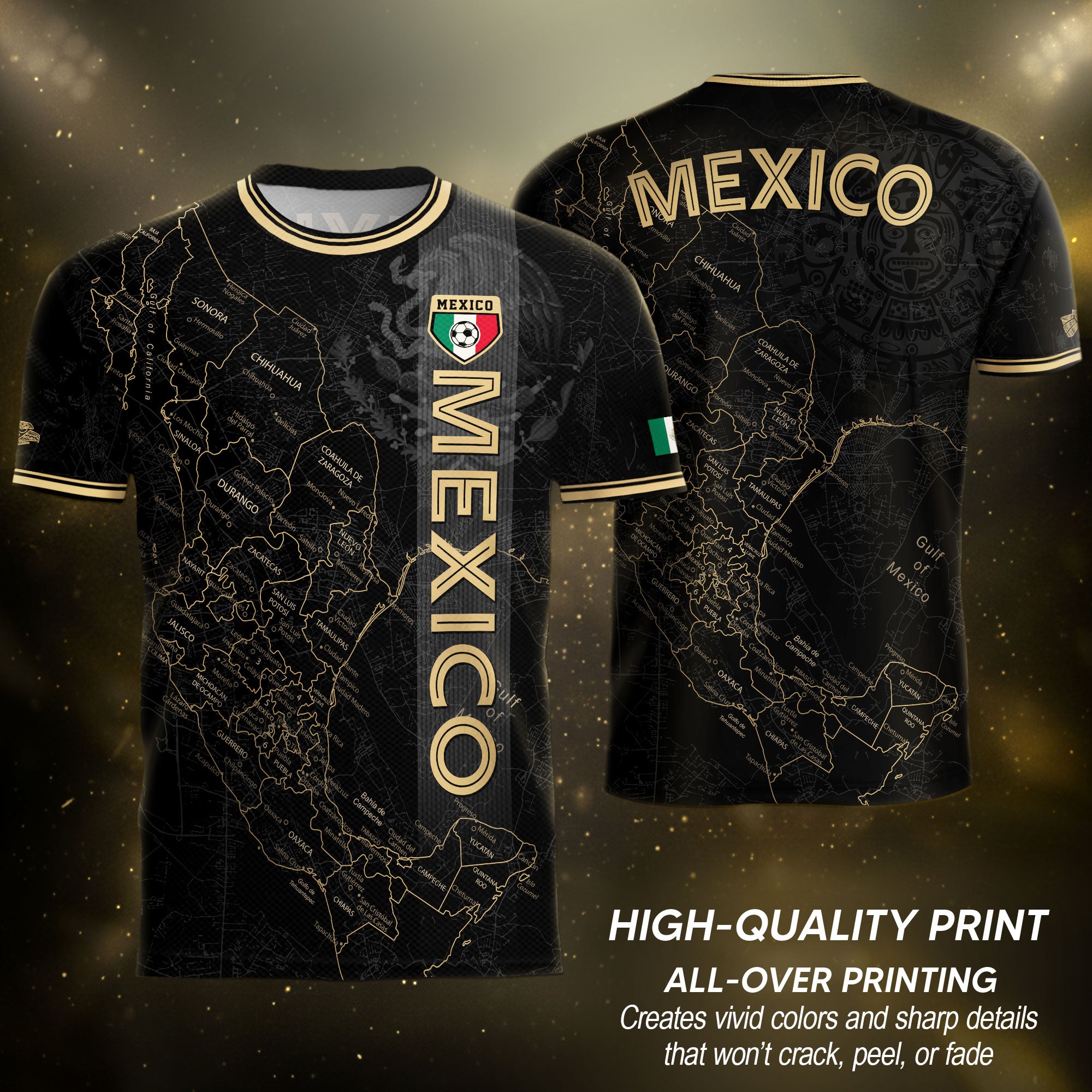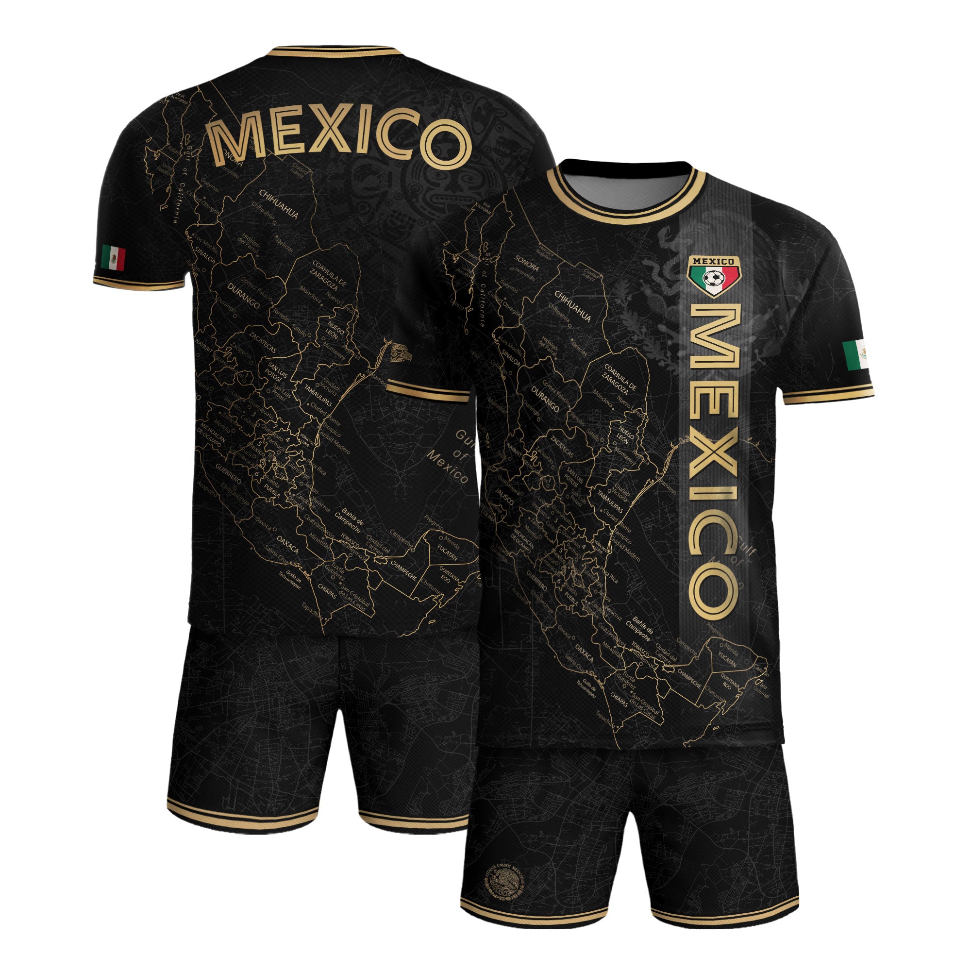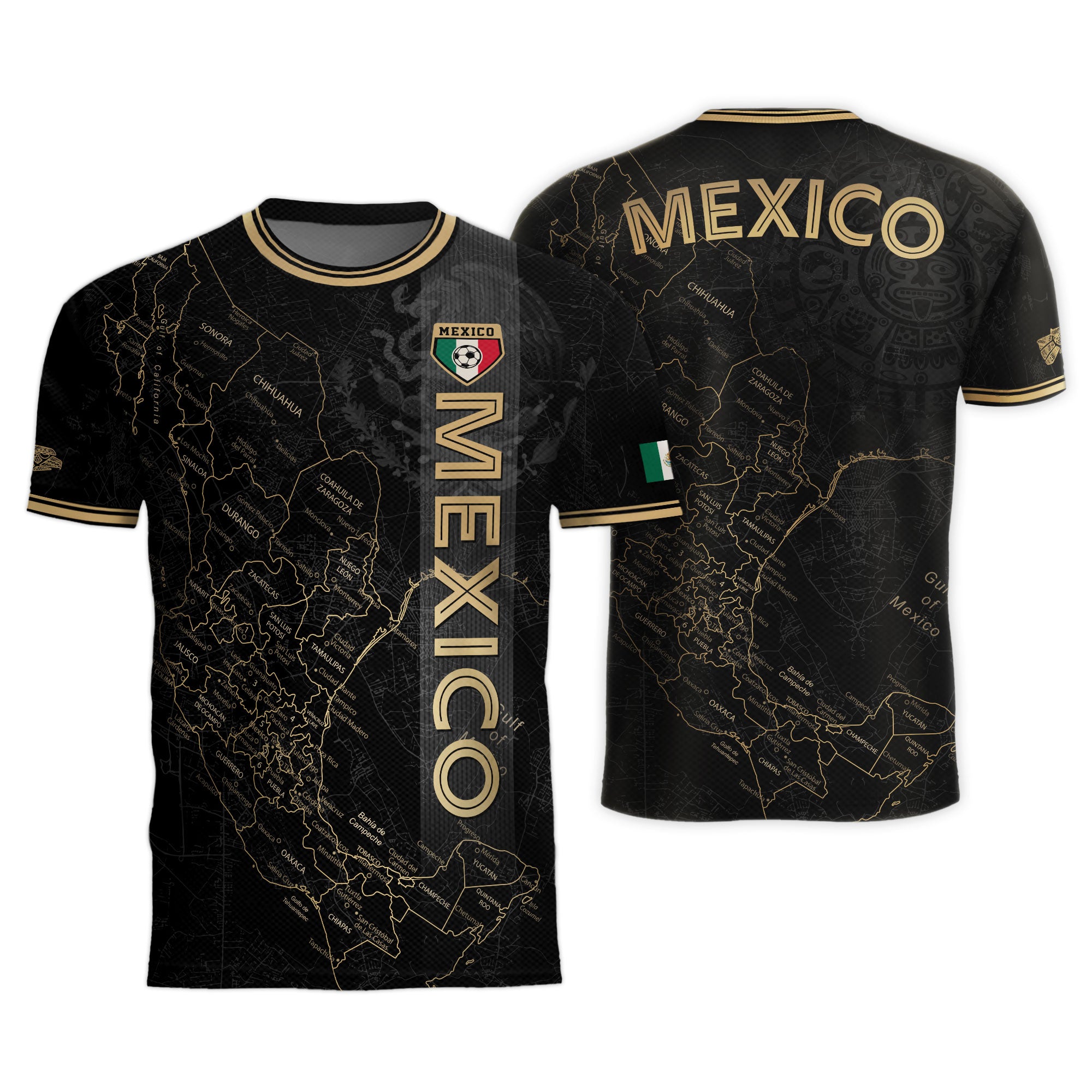 Stand out with this Mexico black heritage map soccer jersey. The golden Aztec accents and detailed map design symbolize unity, pride, and strength — made for true fans of México.