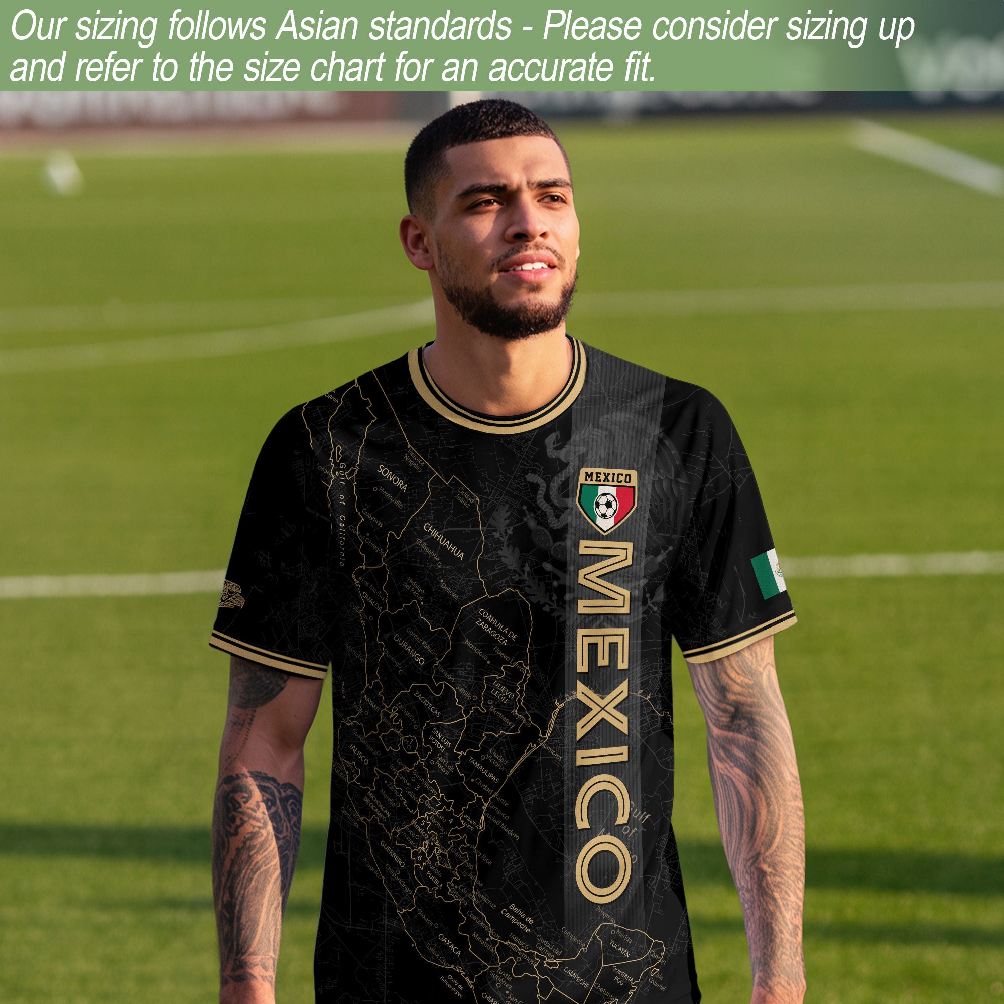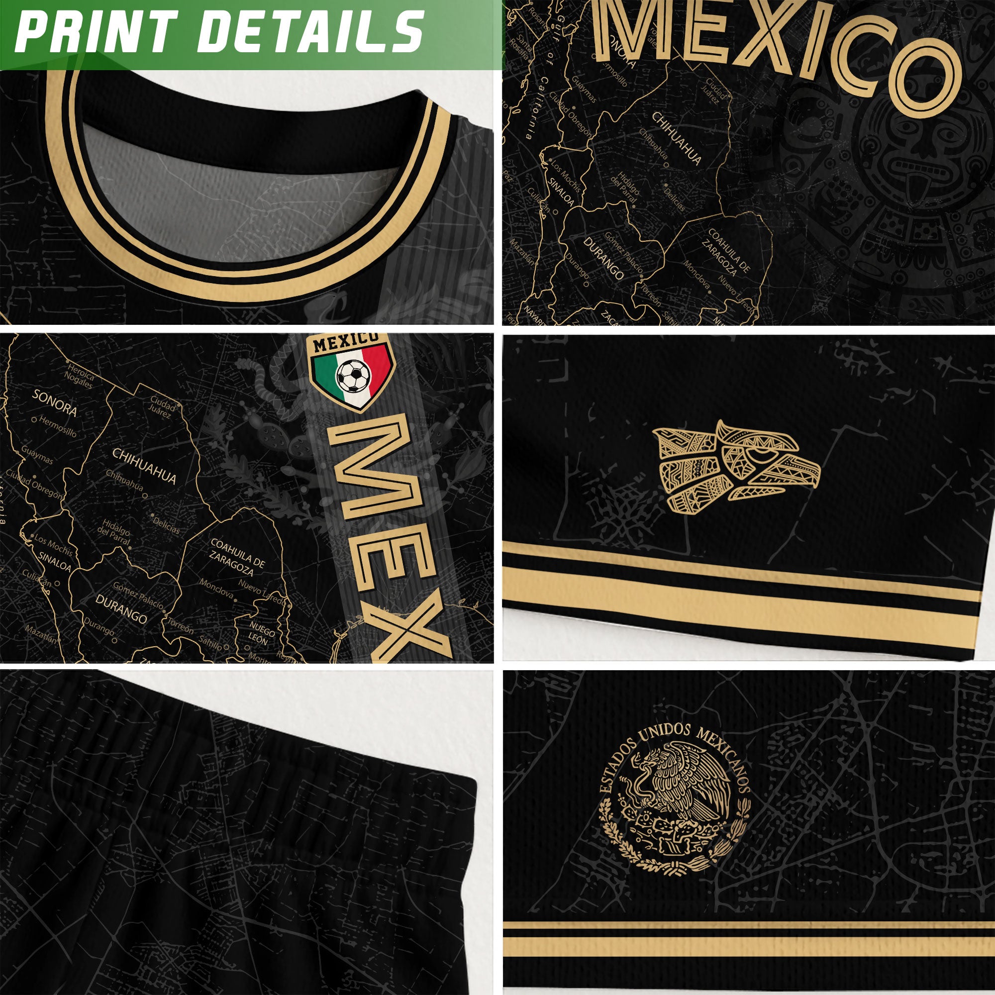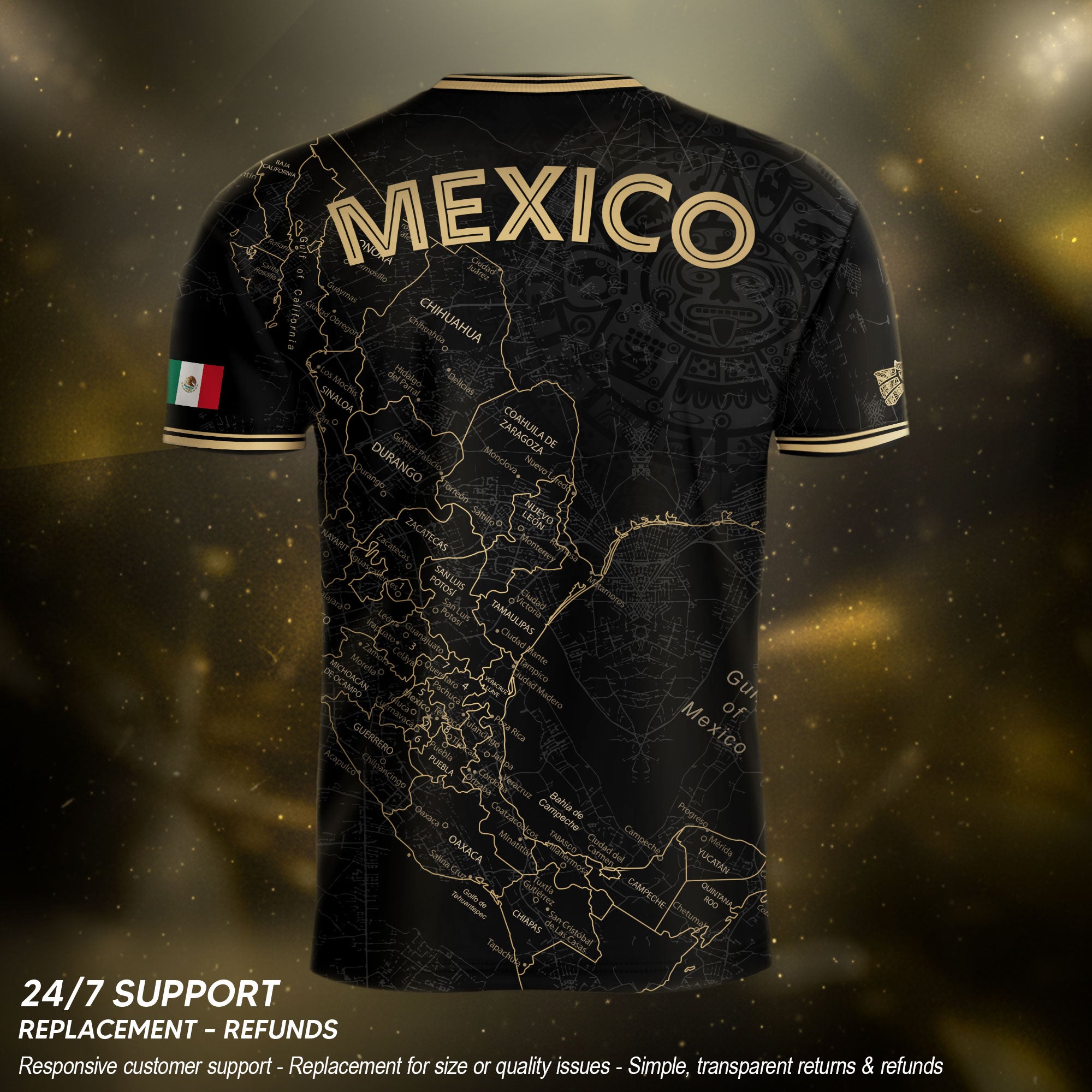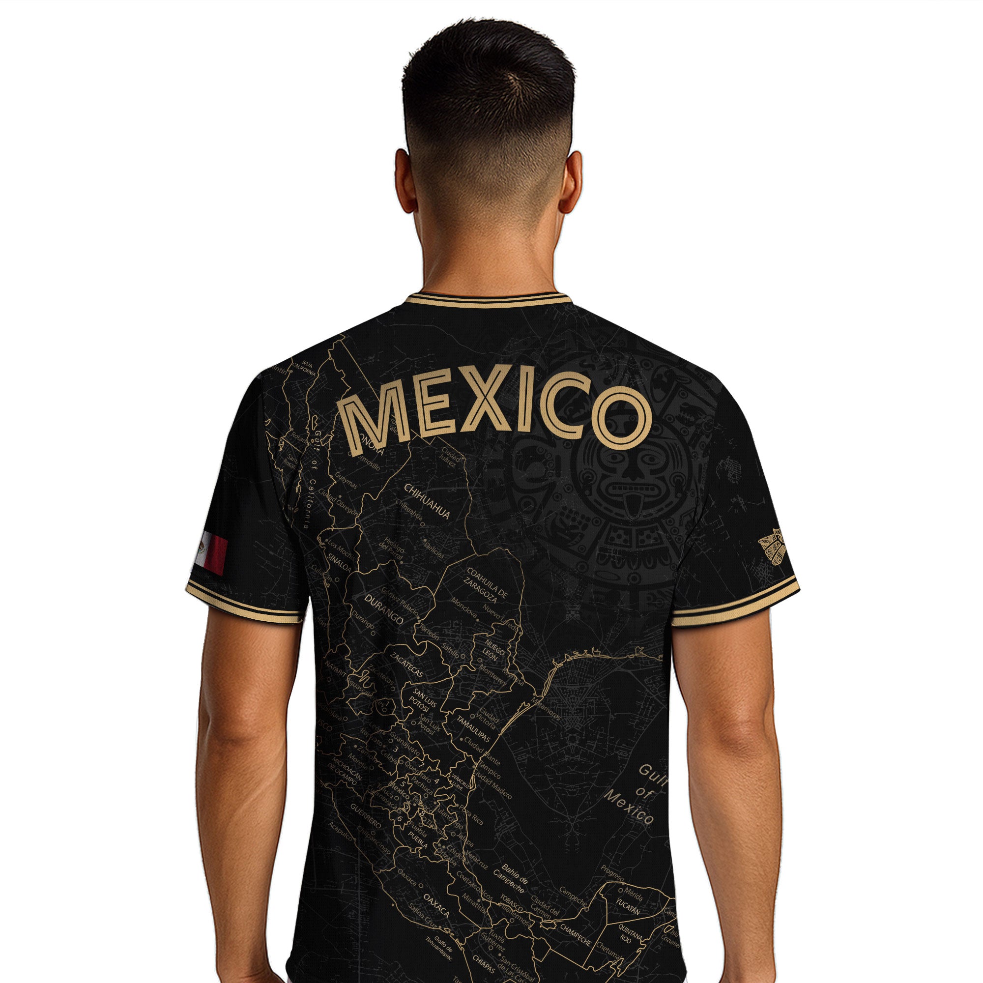 Stand out with this Mexico black heritage map soccer jersey. The golden Aztec accents and detailed map design symbolize unity, pride, and strength — made for true fans of México.