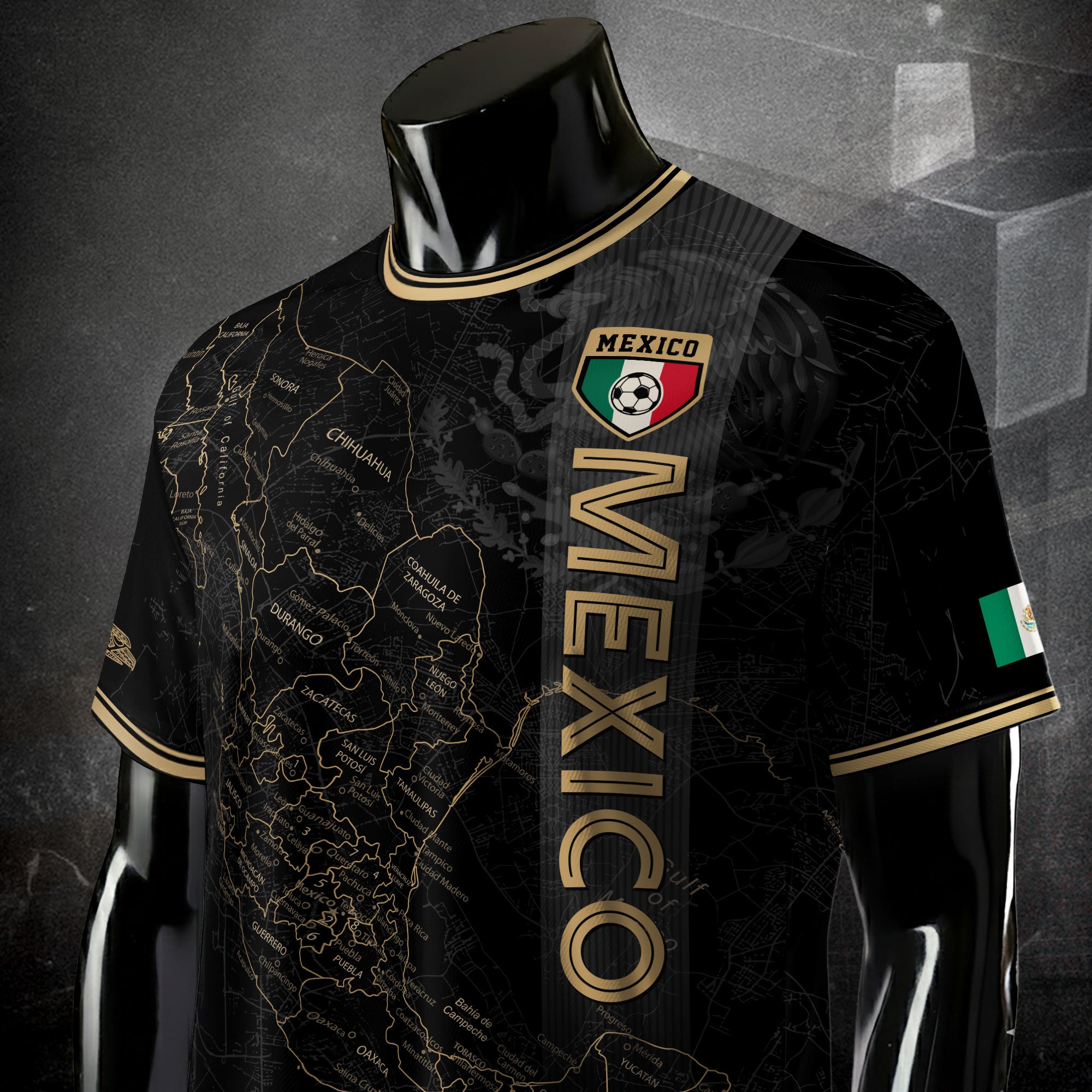 Mexico Black Heritage Map Soccer Jersey with Golden Aztec Accents