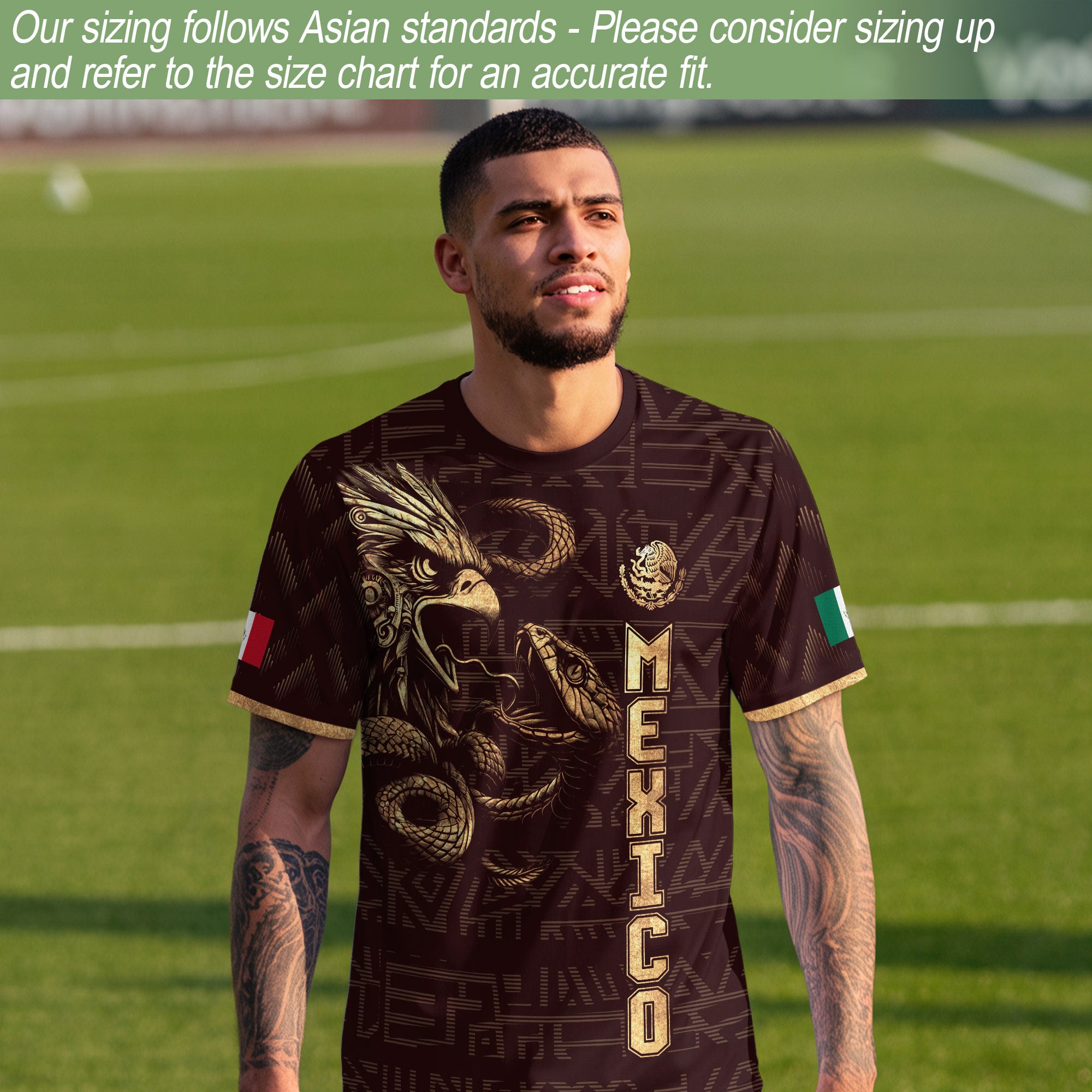 Embrace the legacy of Aztec warriors with this premium Mexico soccer jersey. The rich burgundy and gold design features the iconic eagle and serpent, symbolizing power and heritage. A masterpiece for every devoted El Tri supporter.
