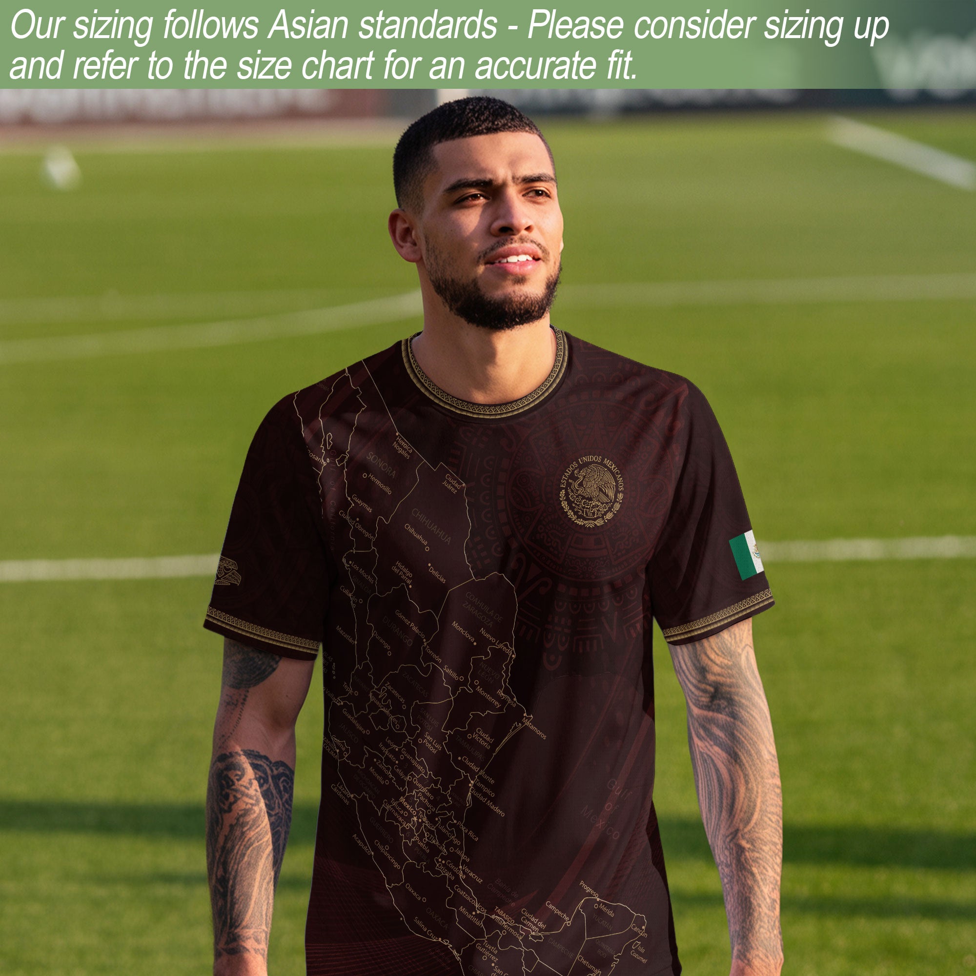 Celebrate Mexico’s unity and legacy with this burgundy map jersey — elegant Aztec art meets national pride.