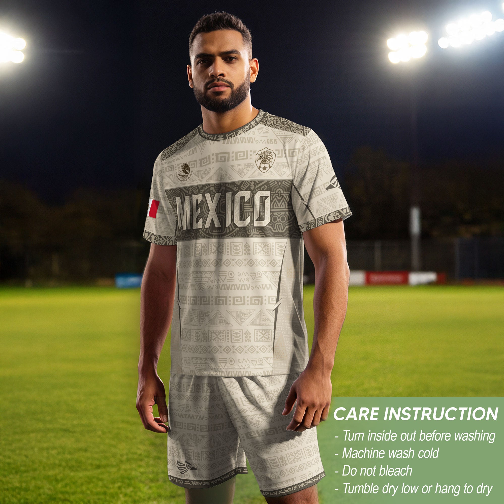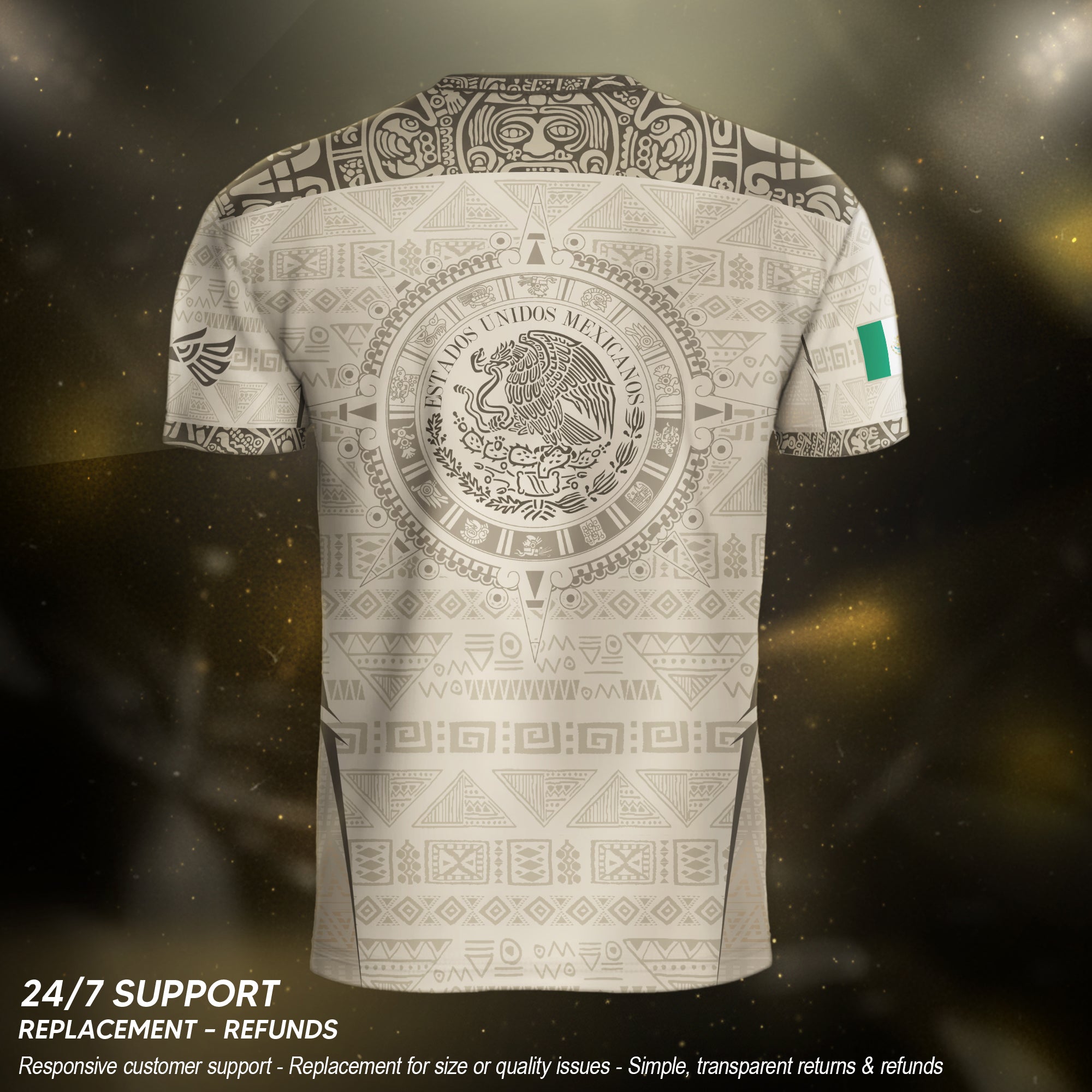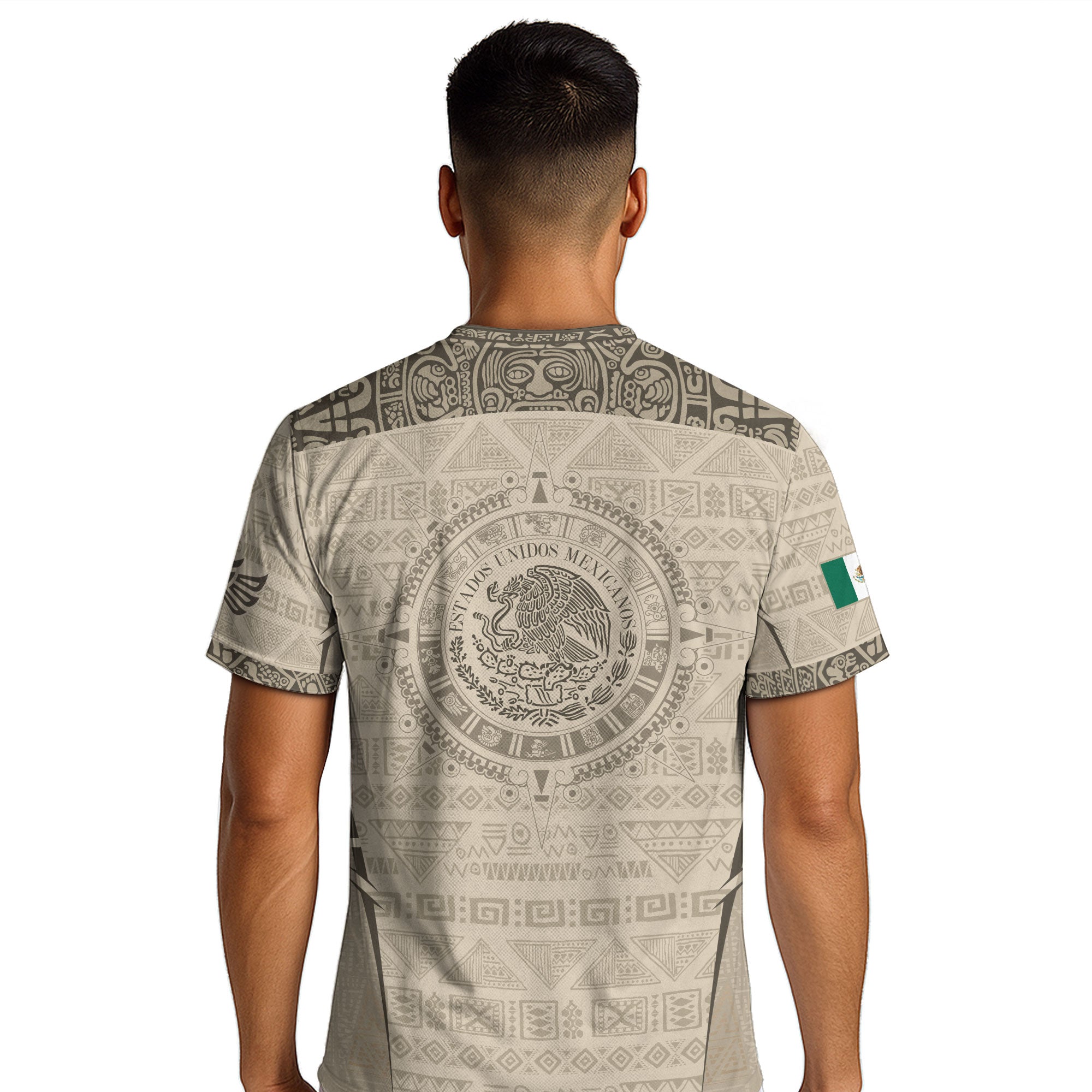 Showcasing the Mexico Coat of Arms with Aztec and Mayan-inspired geometric patterns, this beige jersey reflects deep cultural roots. Created to celebrate tradition and identity, it stands as a refined expression of national heritage.