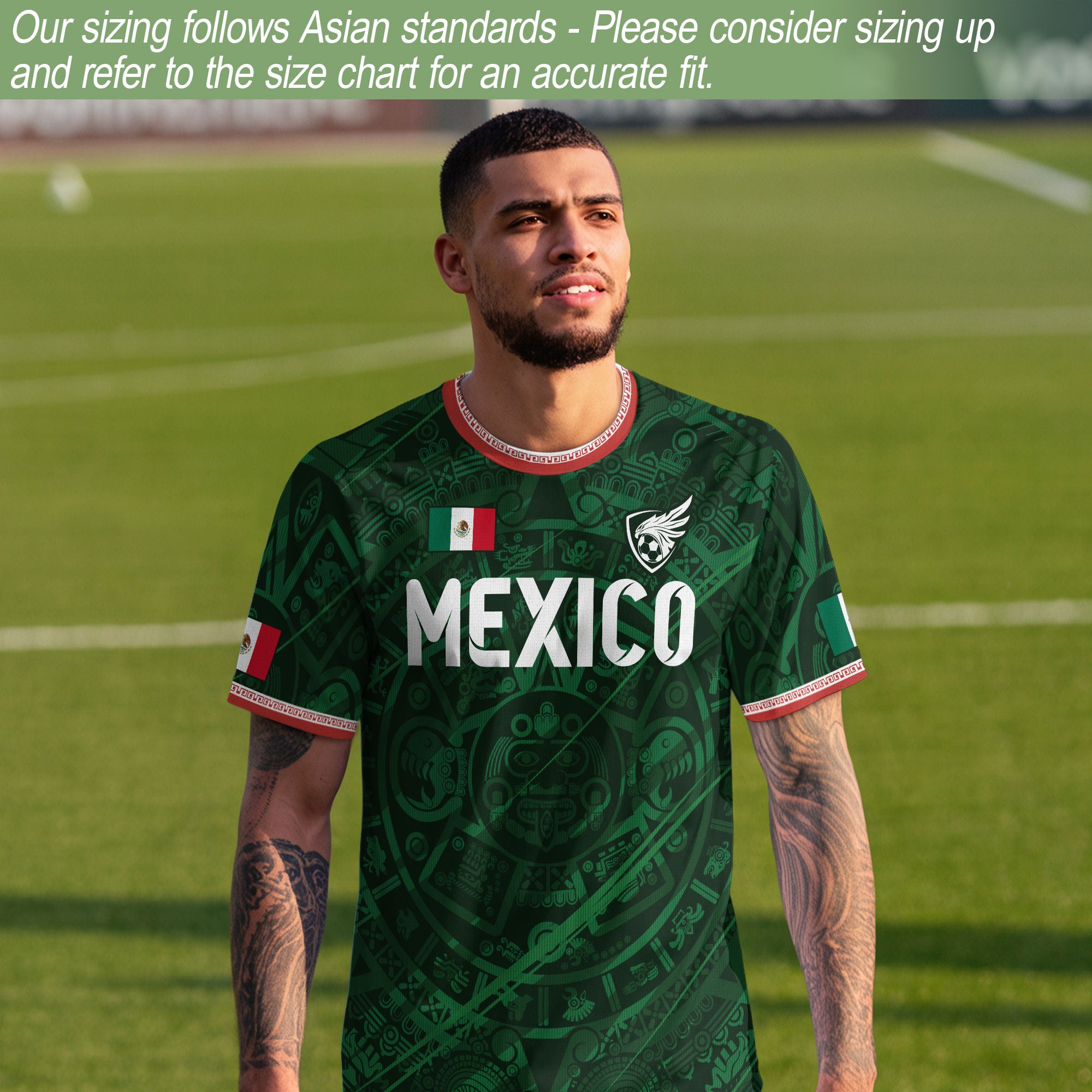 Show your Mexican pride with this Aztec calendar jersey — rich green tones, national emblem, and warrior spirit in every stitch.