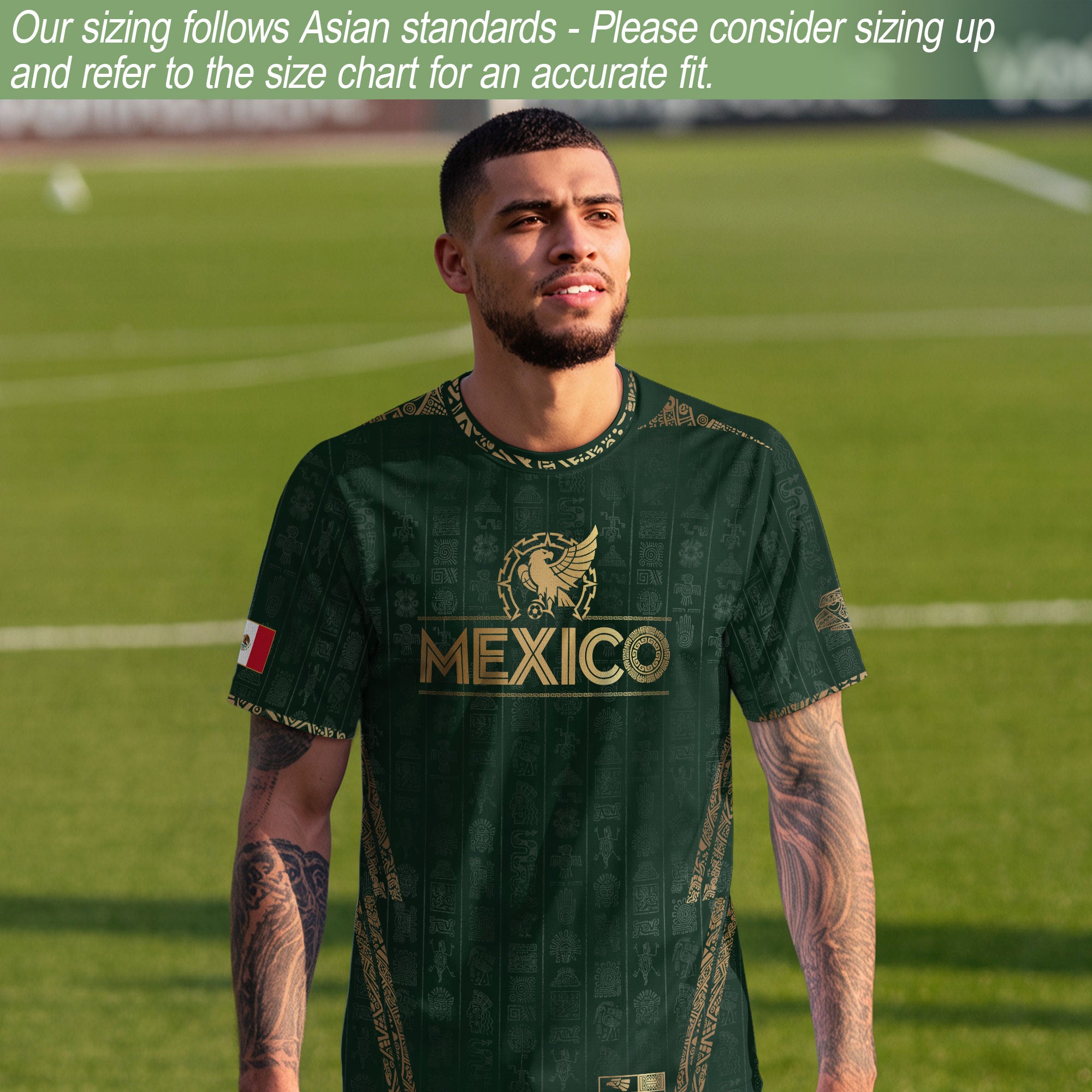 Celebrate Mexico’s pride with this green Aztec eagle jersey — gold accents and cultural artistry meet modern soccer style.