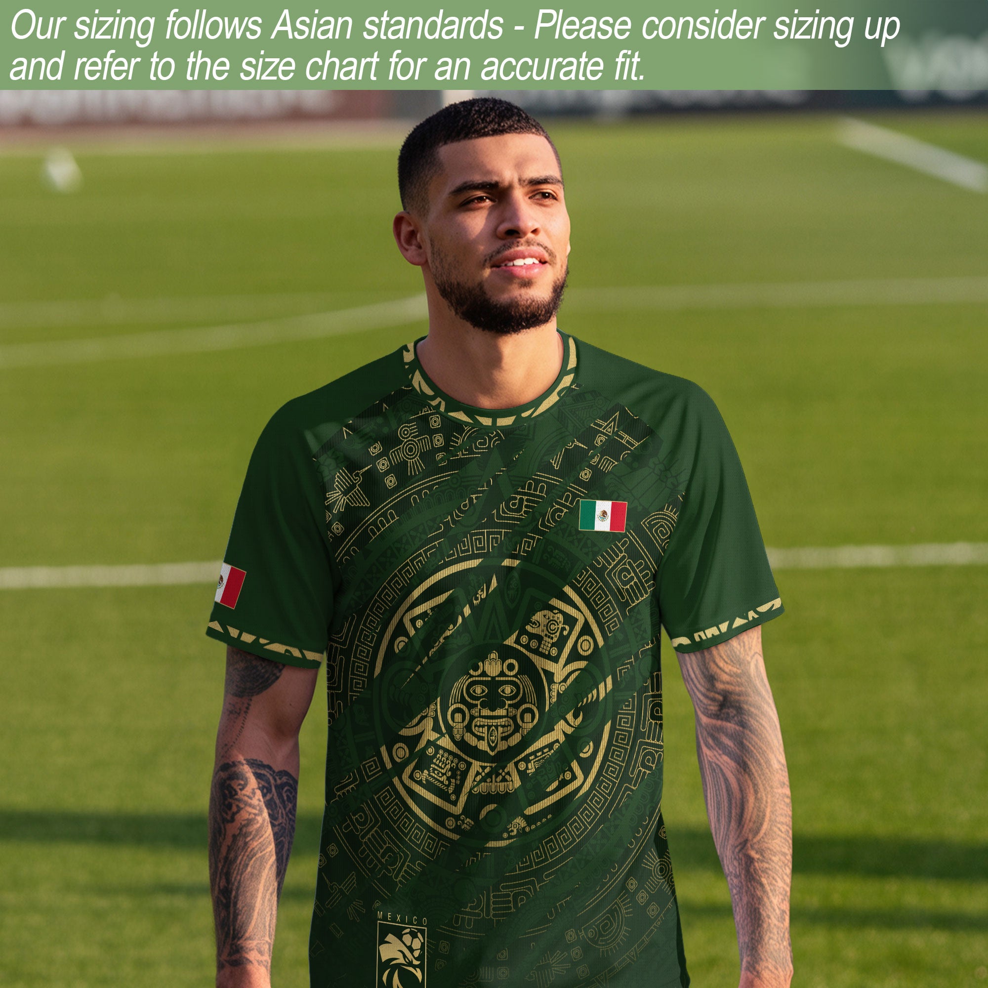 Show Mexico pride with this Green Gold Aztec Calendar Soccer Jersey highlighting one of the nation’s most iconic symbols. Made from high-quality polyester that is soft, lightweight, breathable, and quick-drying, this jersey ensures comfort, flexibility, and standout style.
