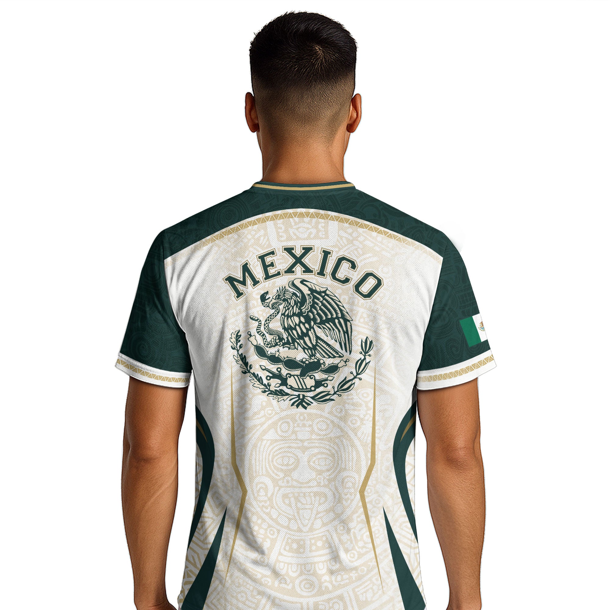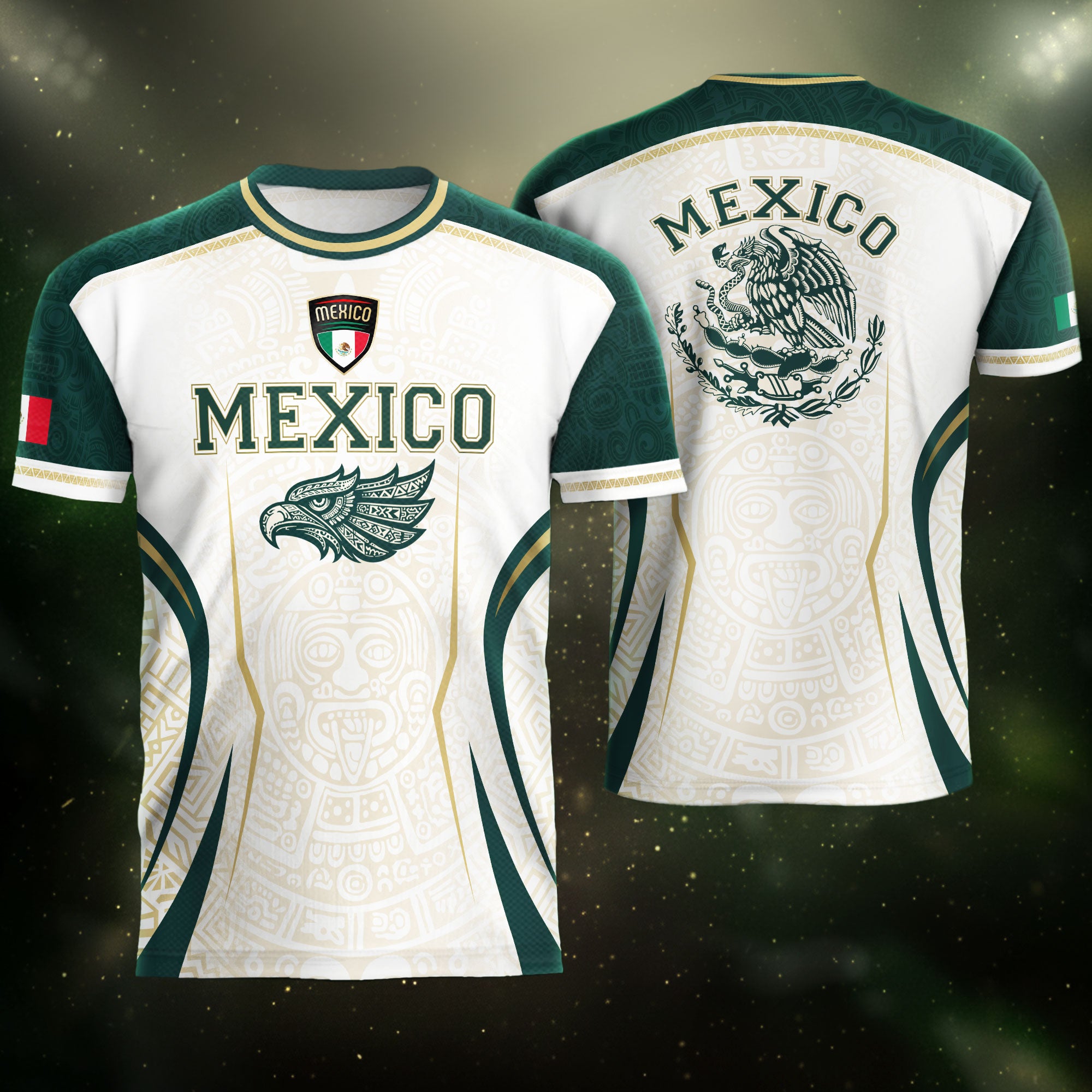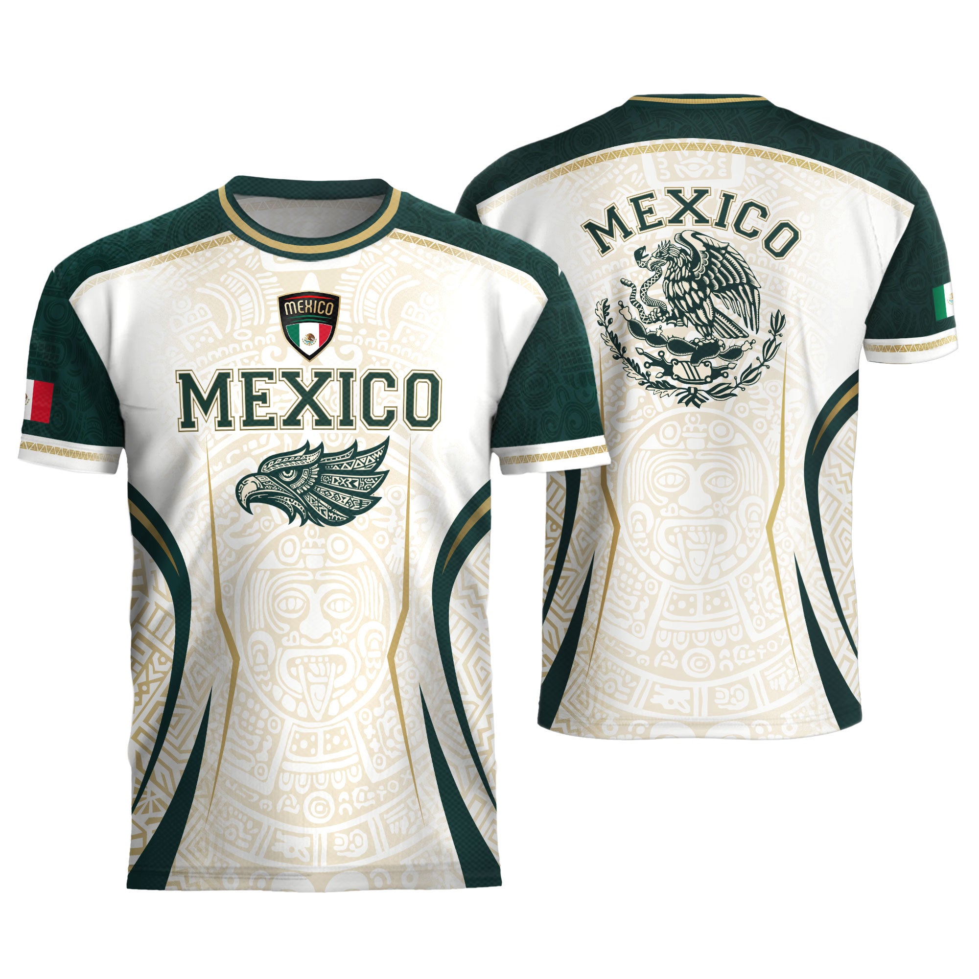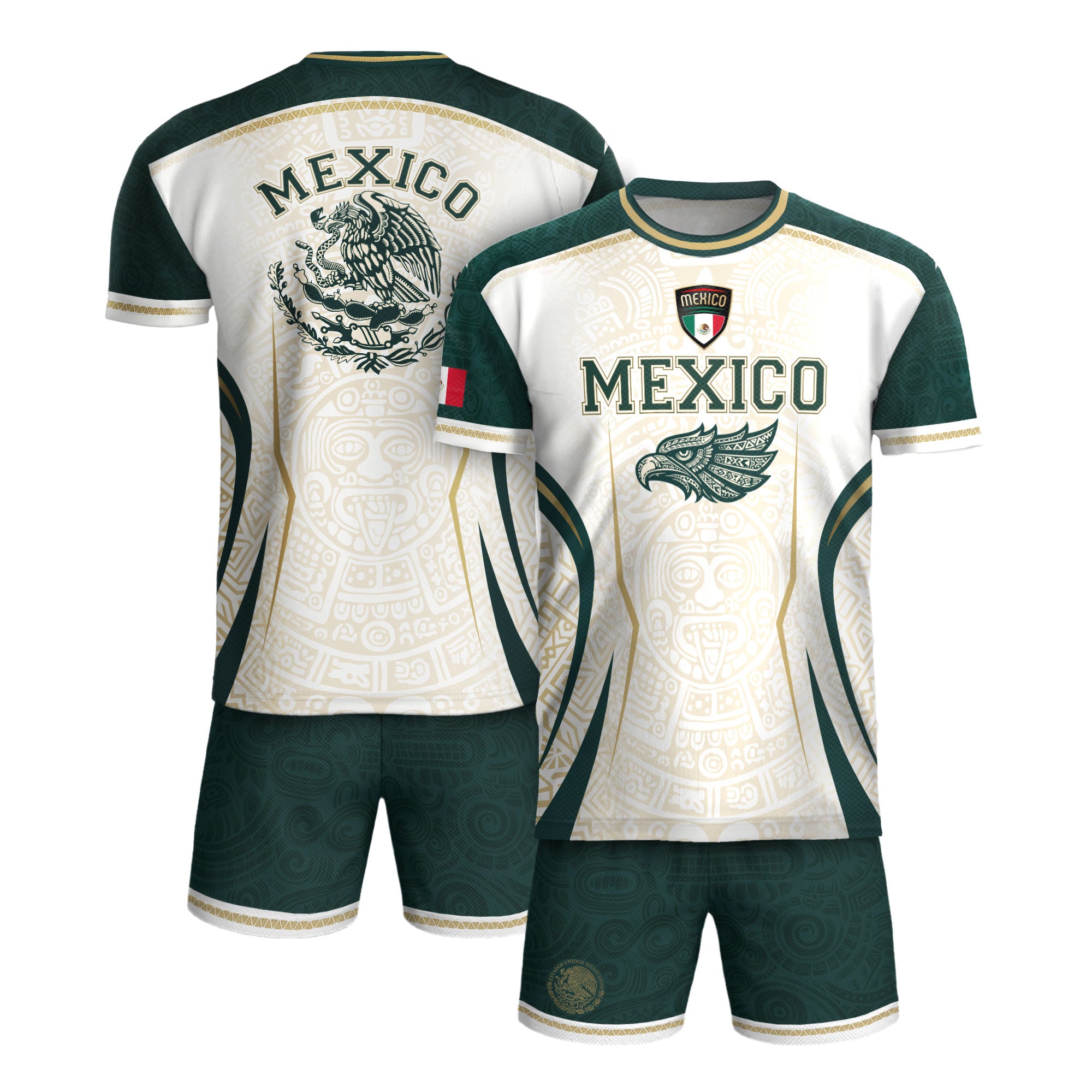 Honor Mexico’s culture and soccer spirit with the Mexico Green White Aztec Eagle Heritage Estados Unidos Mexicanos Soccer Jersey. The design features classic green-white stripes, an Aztec-inspired eagle graphic, and the iconic Estados Unidos Mexicanos emblem, reflecting strength, heritage, and national pride.