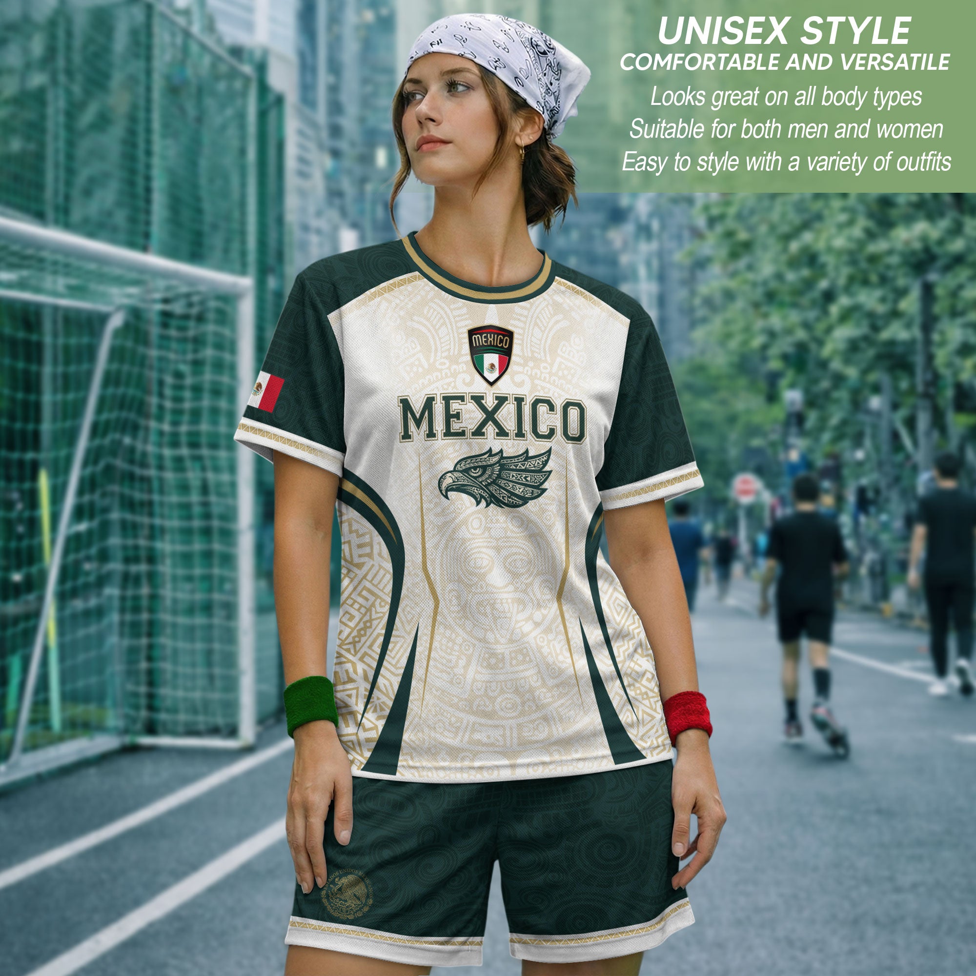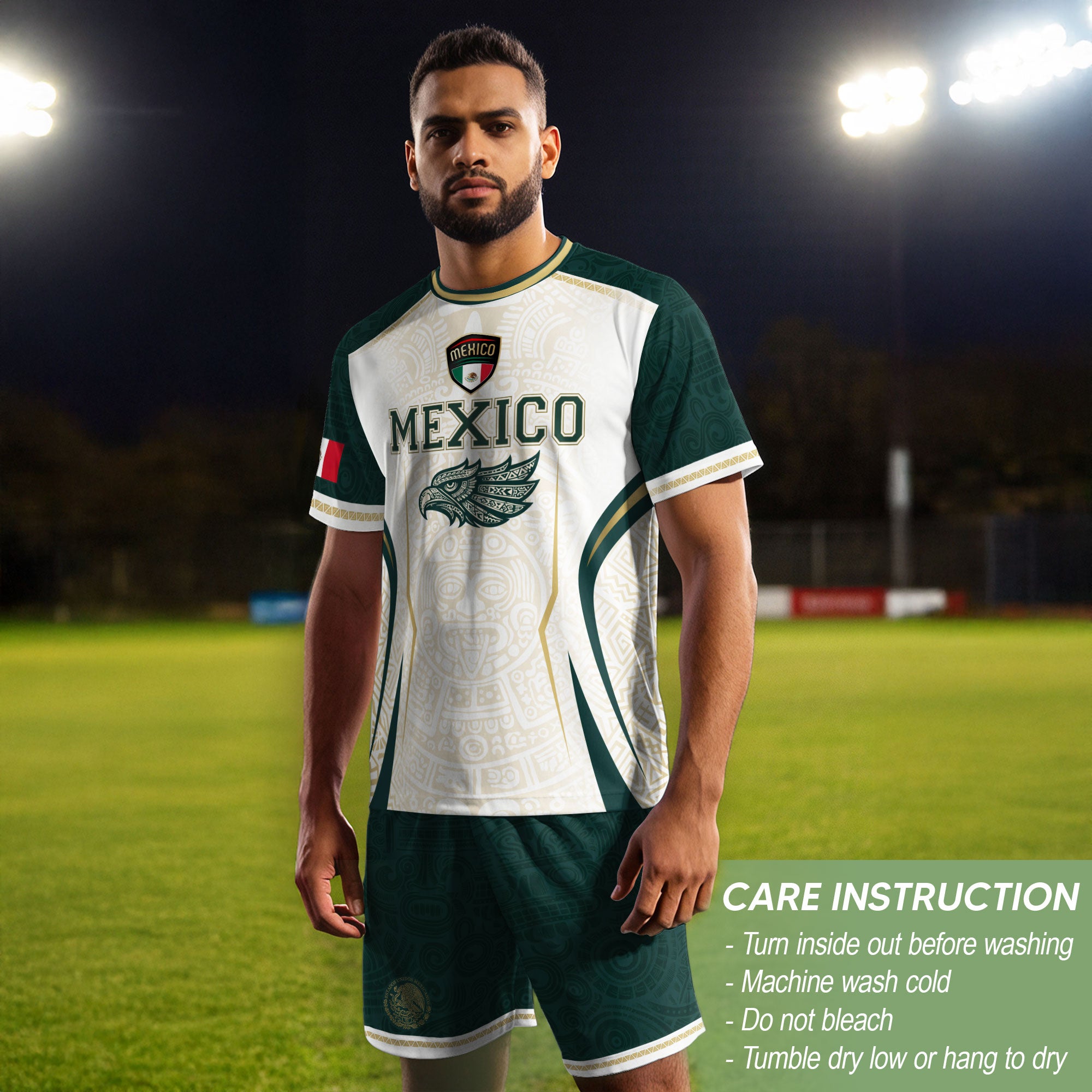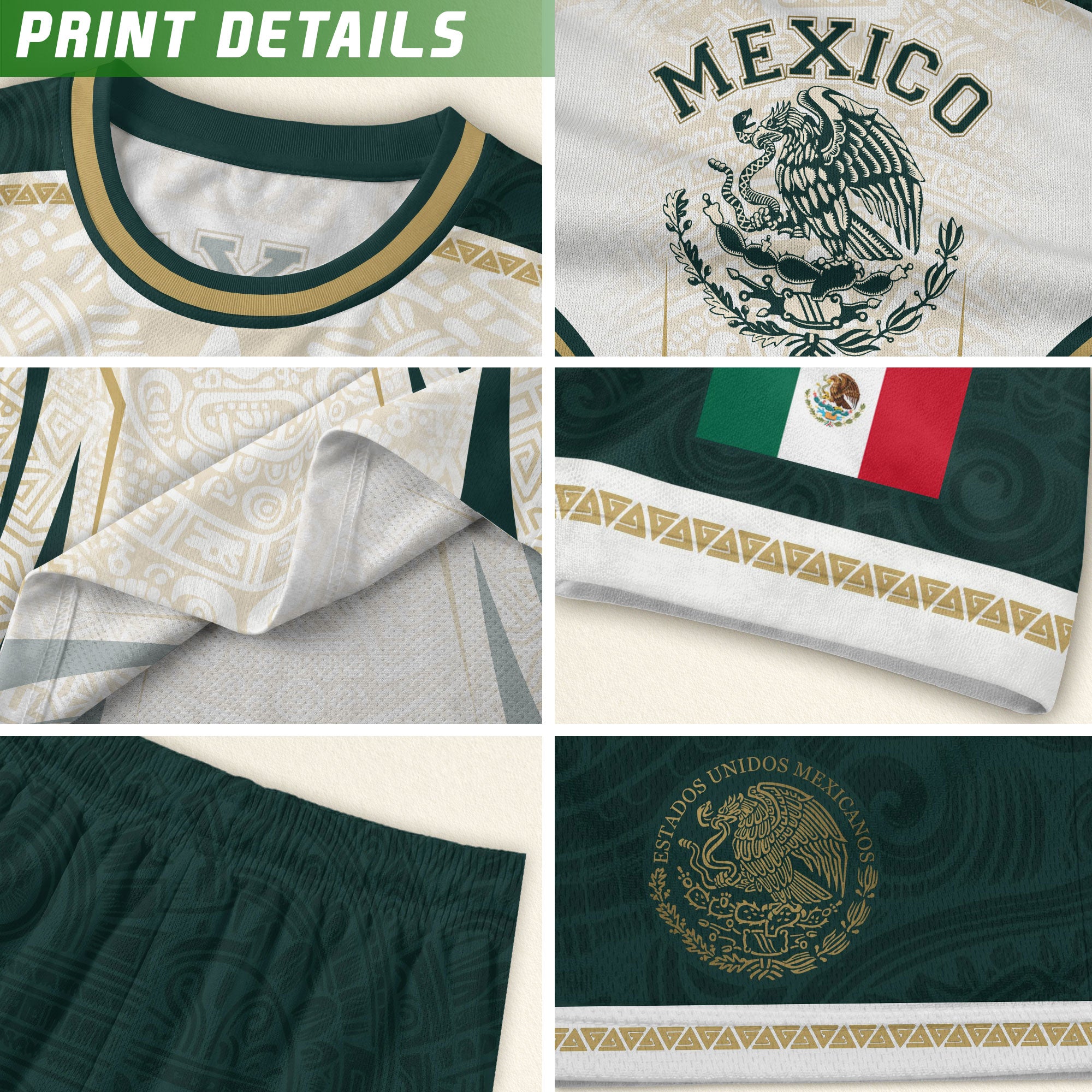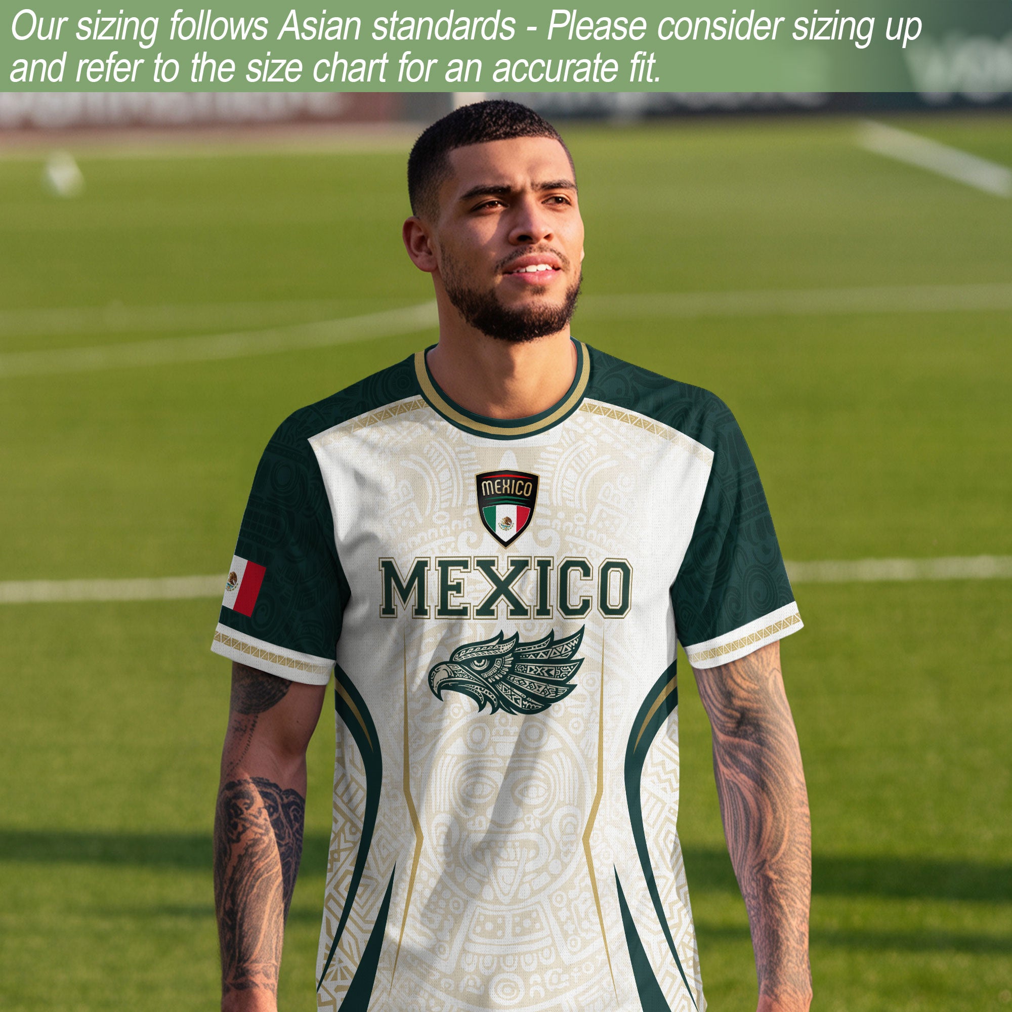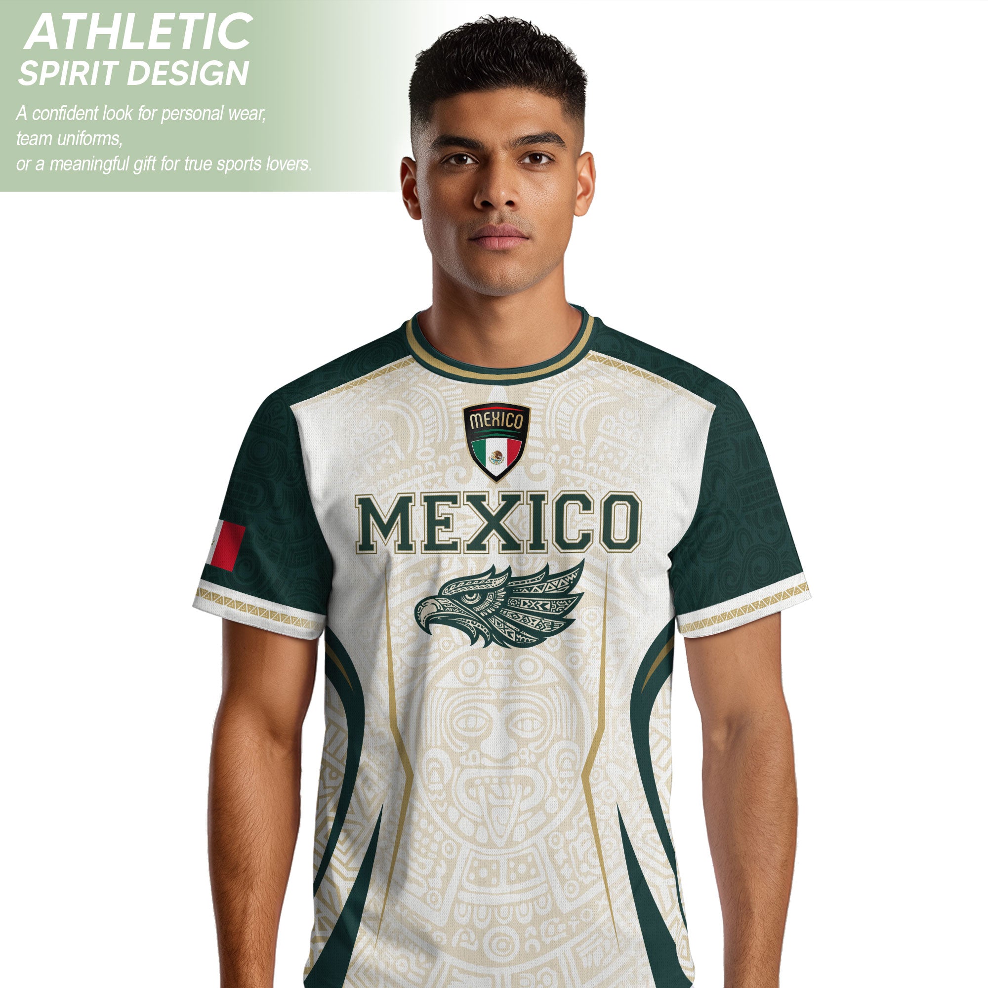 Honor Mexico’s culture and soccer spirit with the Mexico Green White Aztec Eagle Heritage Estados Unidos Mexicanos Soccer Jersey. The design features classic green-white stripes, an Aztec-inspired eagle graphic, and the iconic Estados Unidos Mexicanos emblem, reflecting strength, heritage, and national pride.