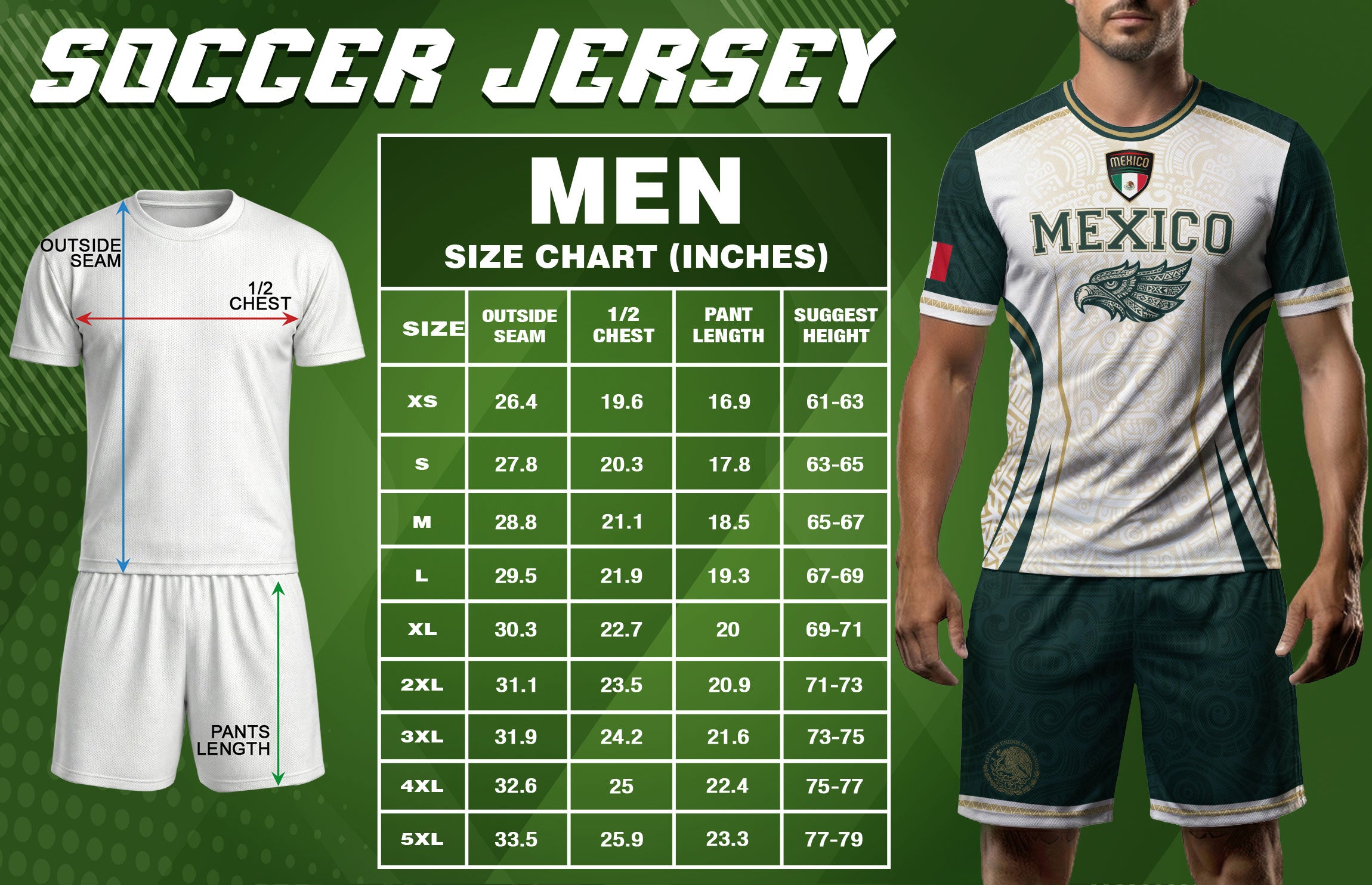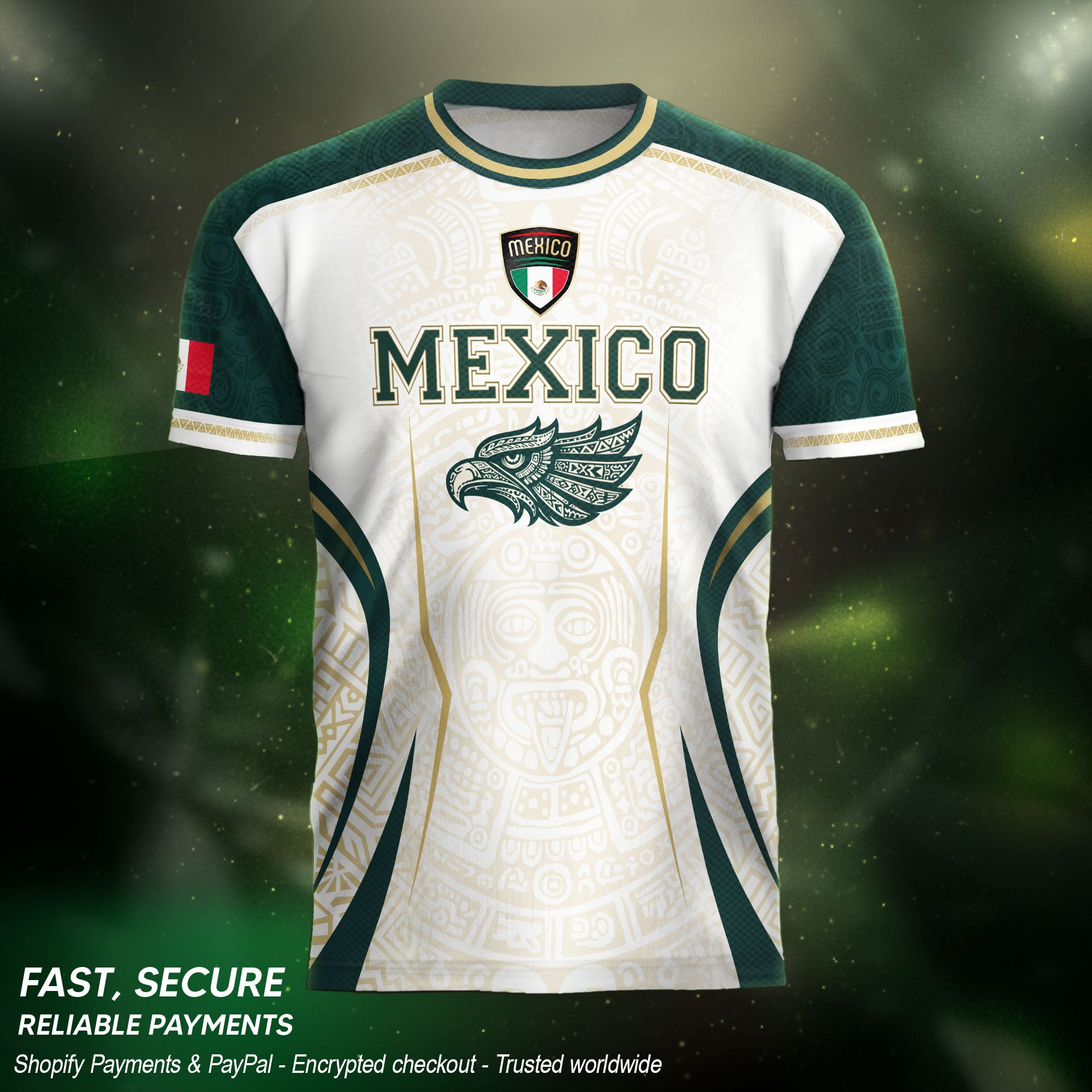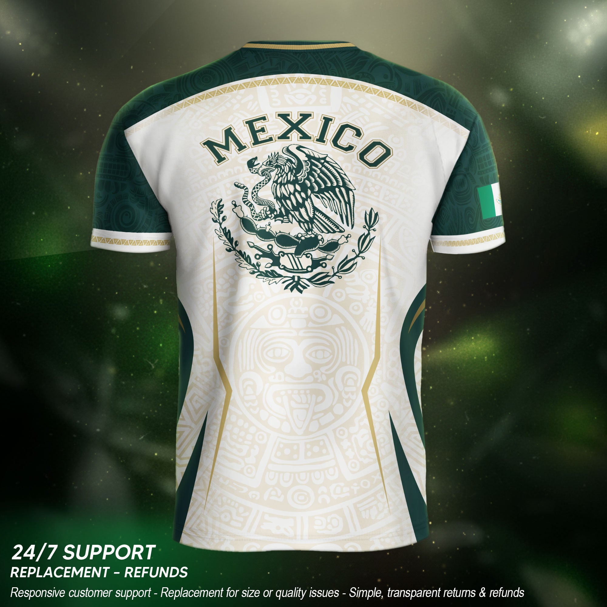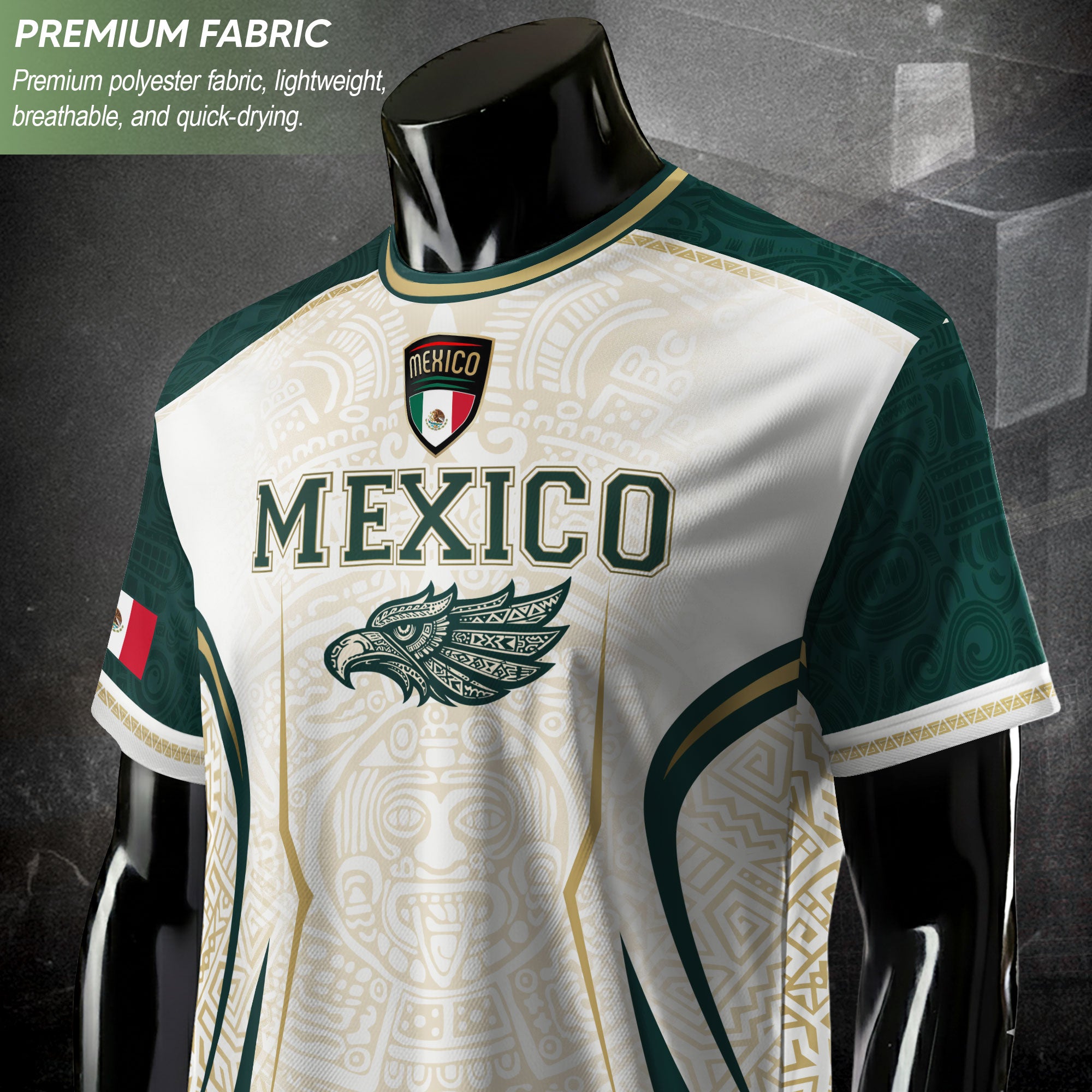 Honor Mexico’s culture and soccer spirit with the Mexico Green White Aztec Eagle Heritage Estados Unidos Mexicanos Soccer Jersey. The design features classic green-white stripes, an Aztec-inspired eagle graphic, and the iconic Estados Unidos Mexicanos emblem, reflecting strength, heritage, and national pride.