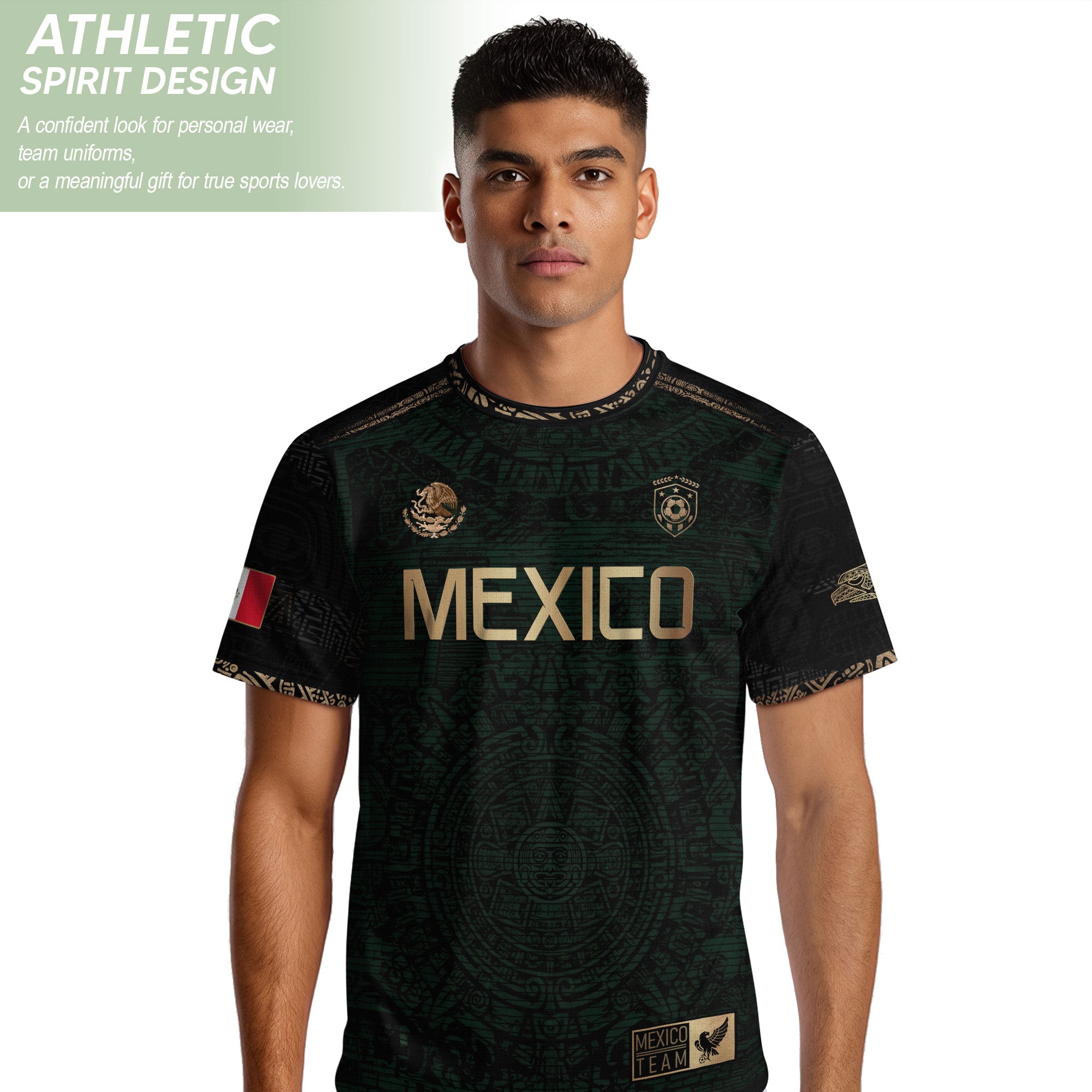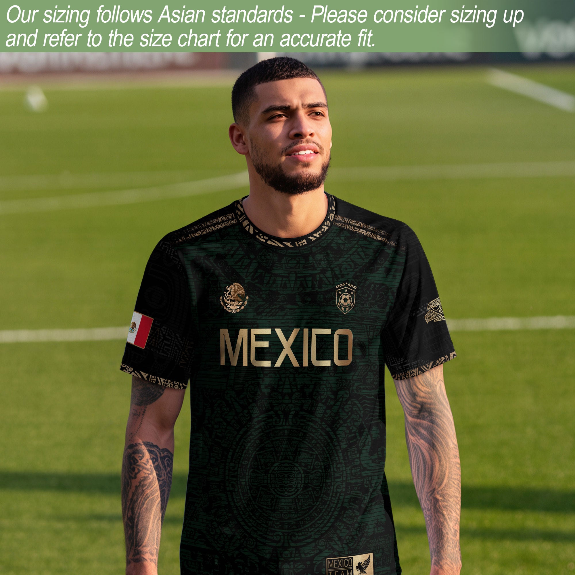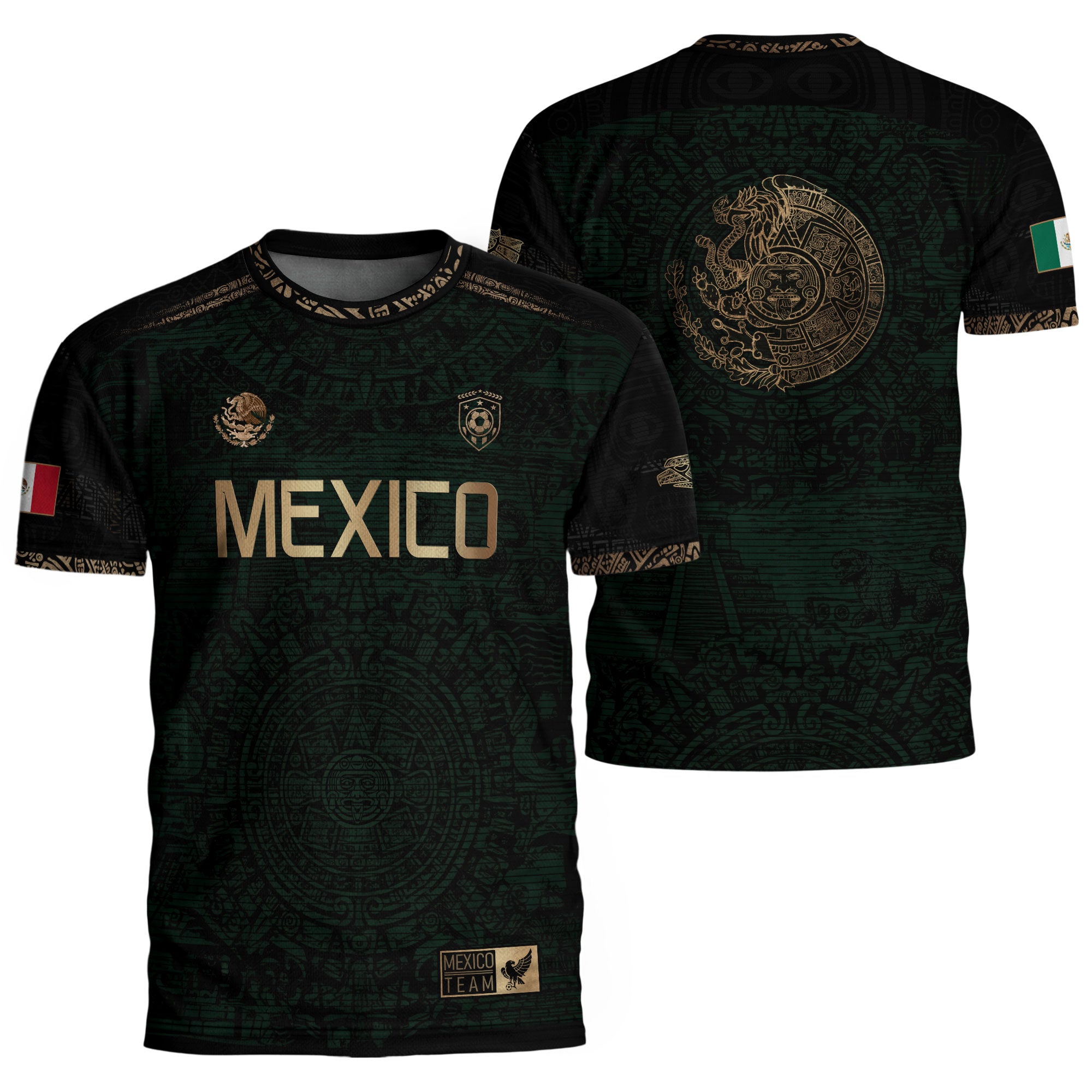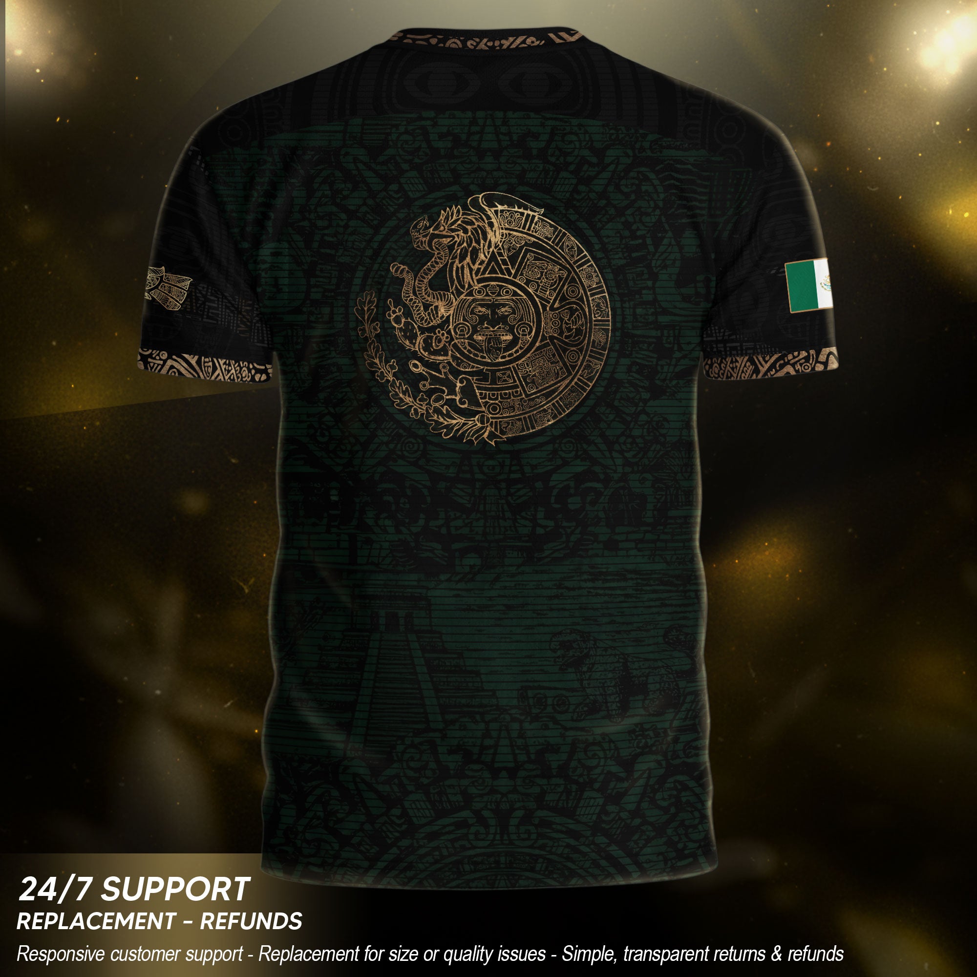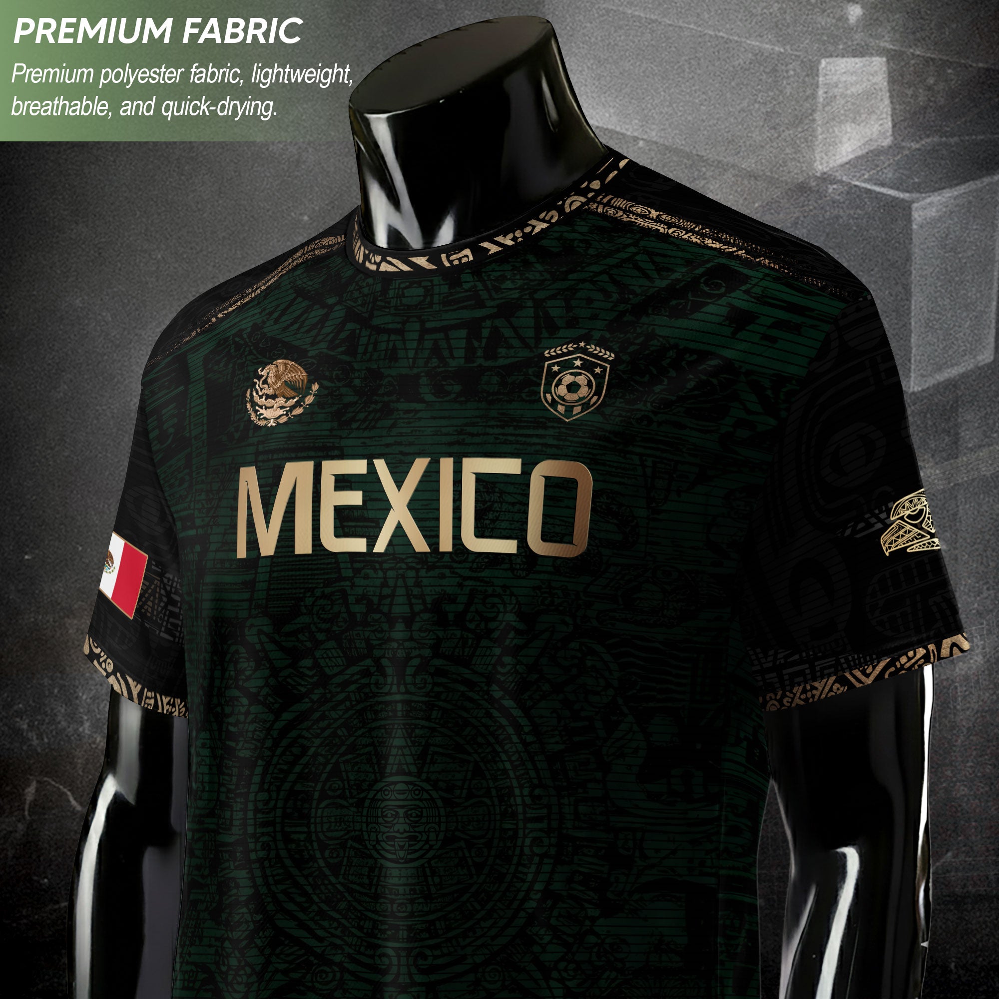 Inspired by ancient Aztec symbolism, this dark green and gold jersey reflects tradition and national identity. Perfect for matches or everyday wear, it celebrates Mexico’s rich history through a timeless athletic design.