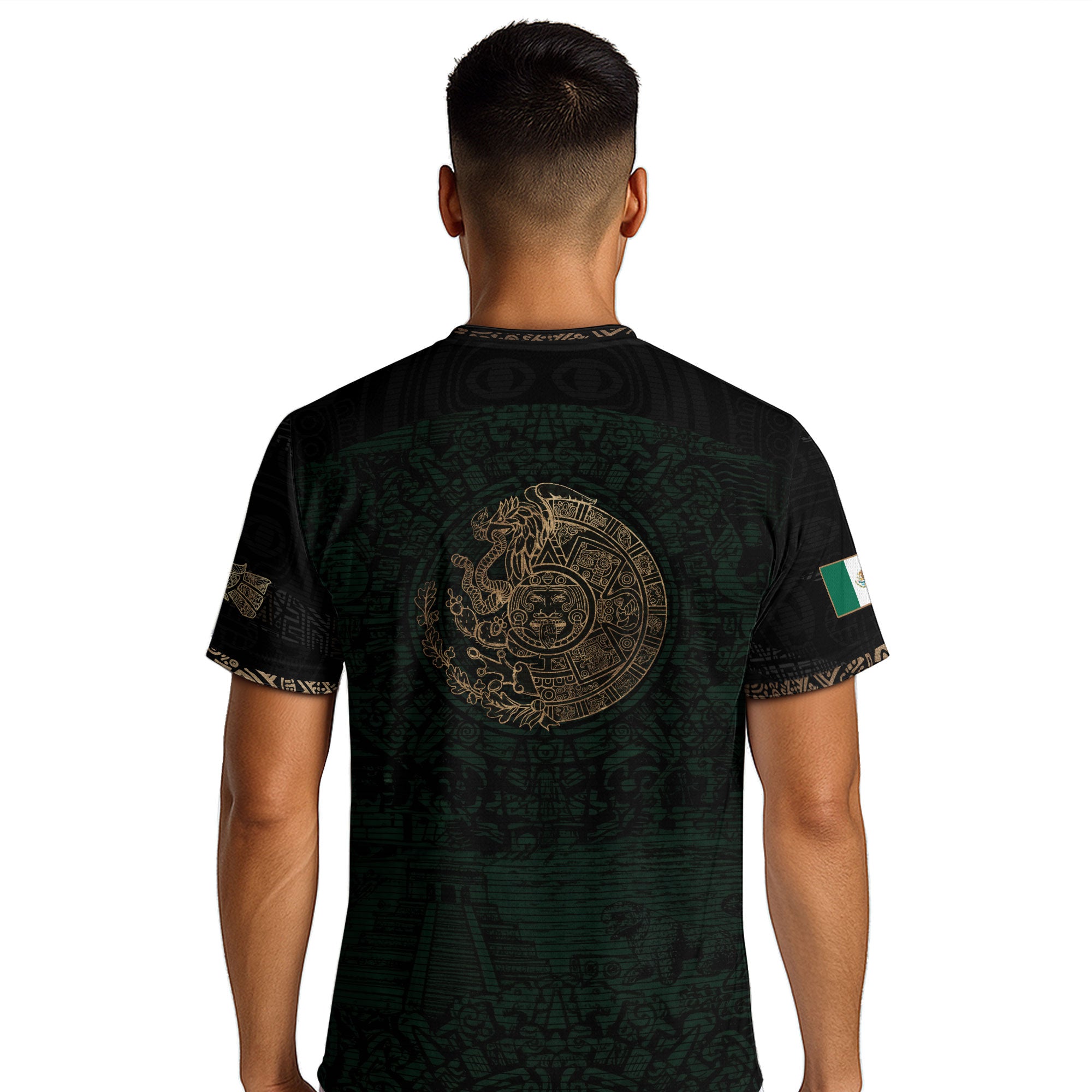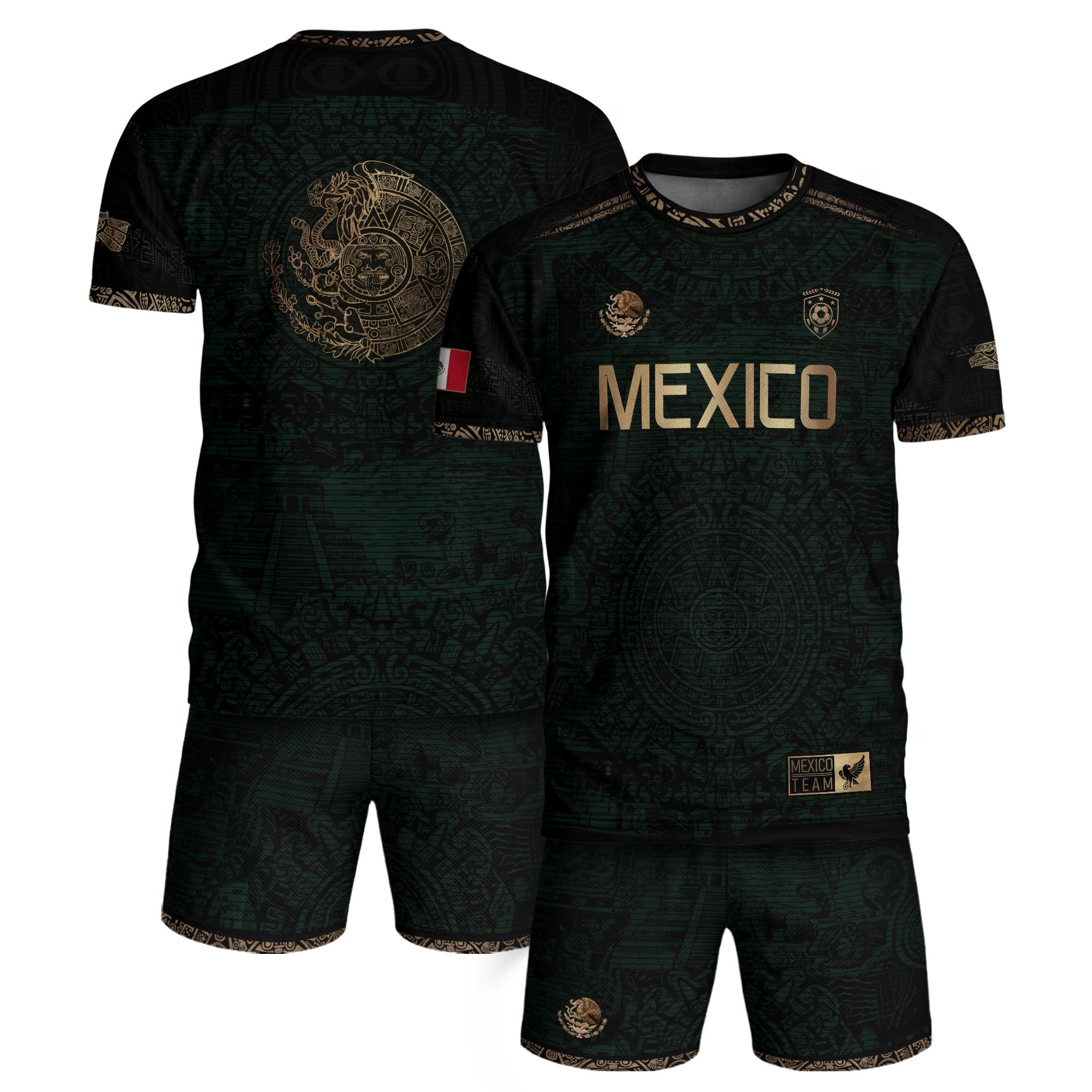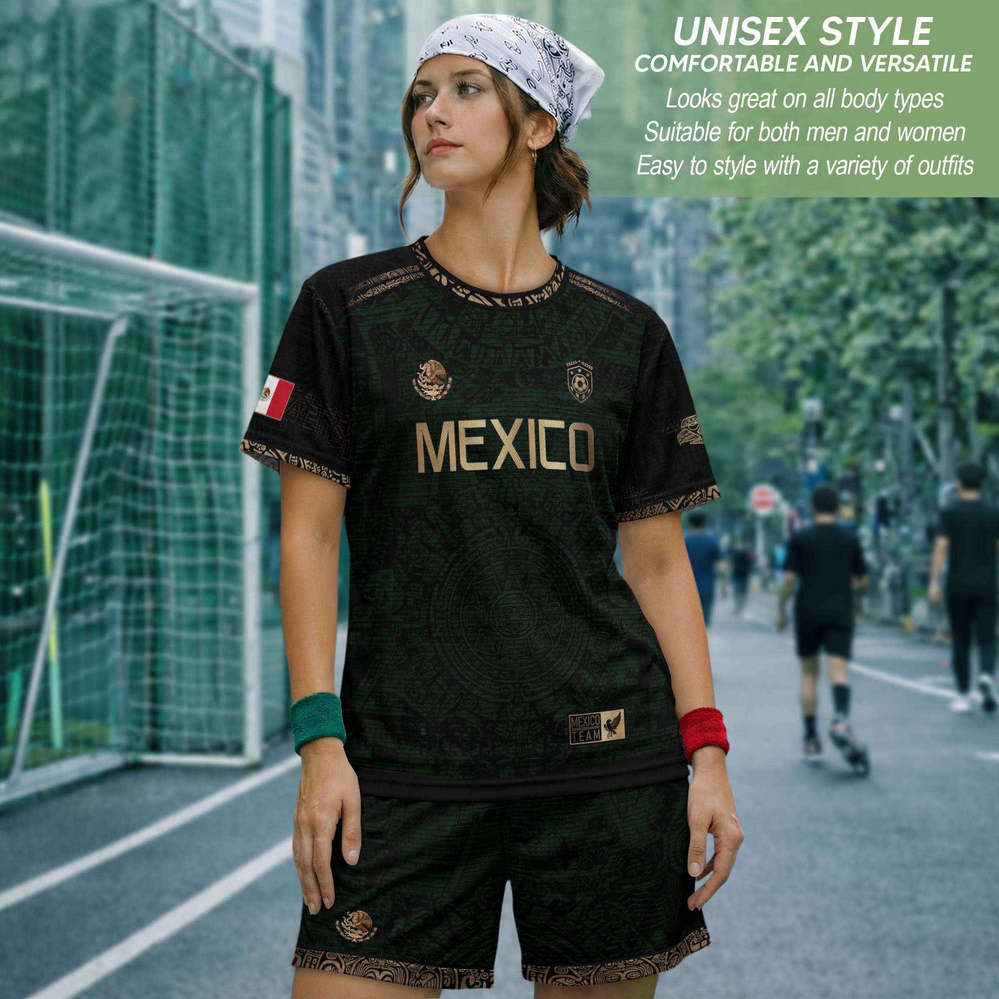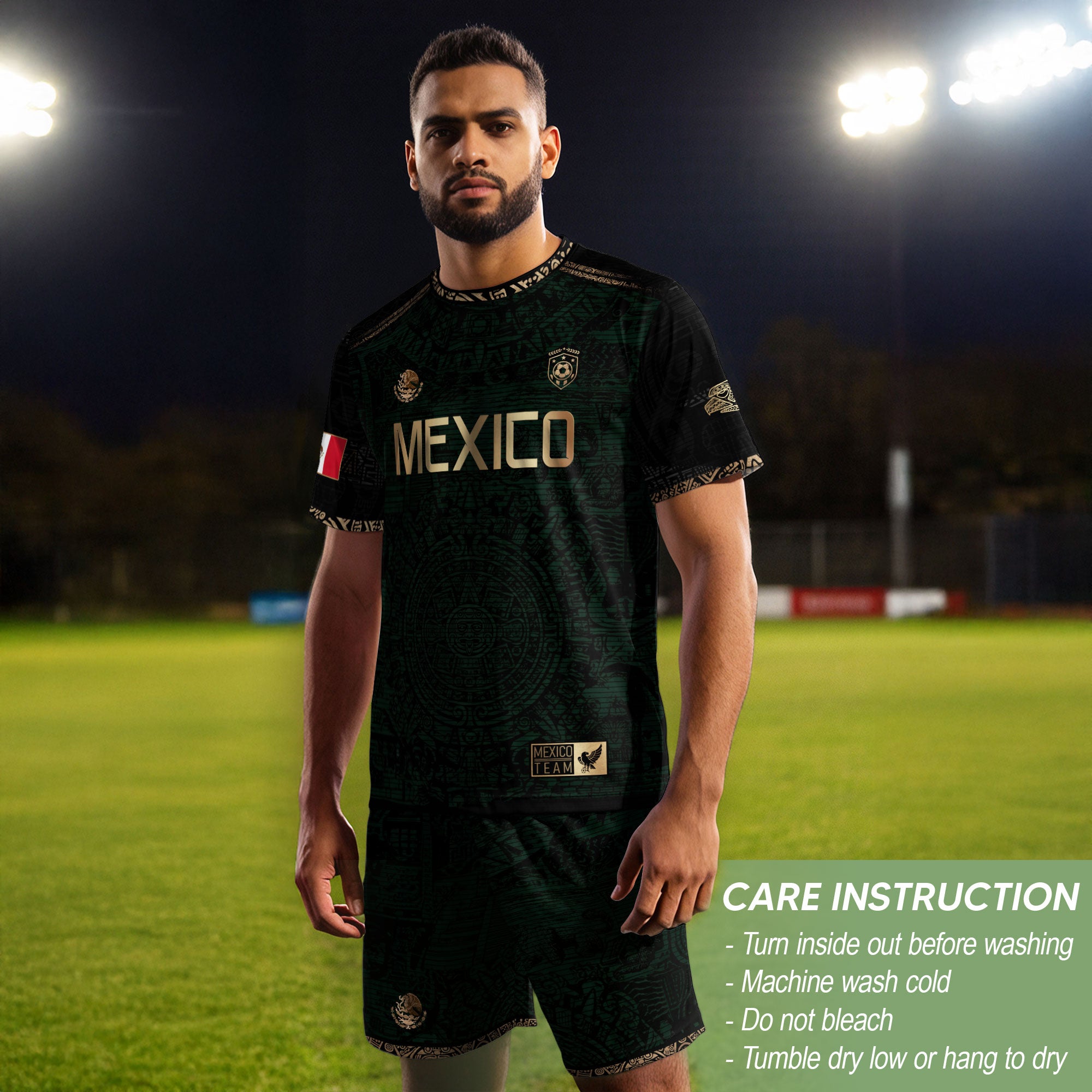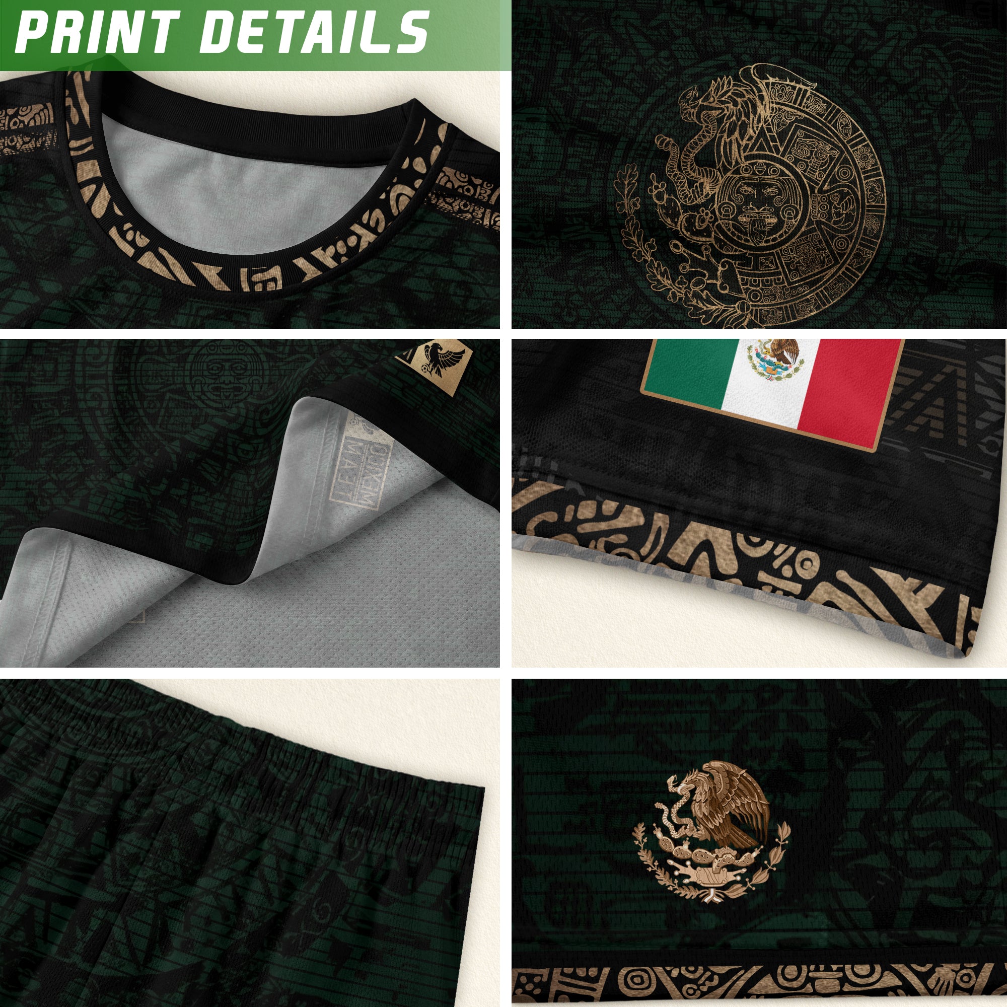 Inspired by ancient Aztec symbolism, this dark green and gold jersey reflects tradition and national identity. Perfect for matches or everyday wear, it celebrates Mexico’s rich history through a timeless athletic design.