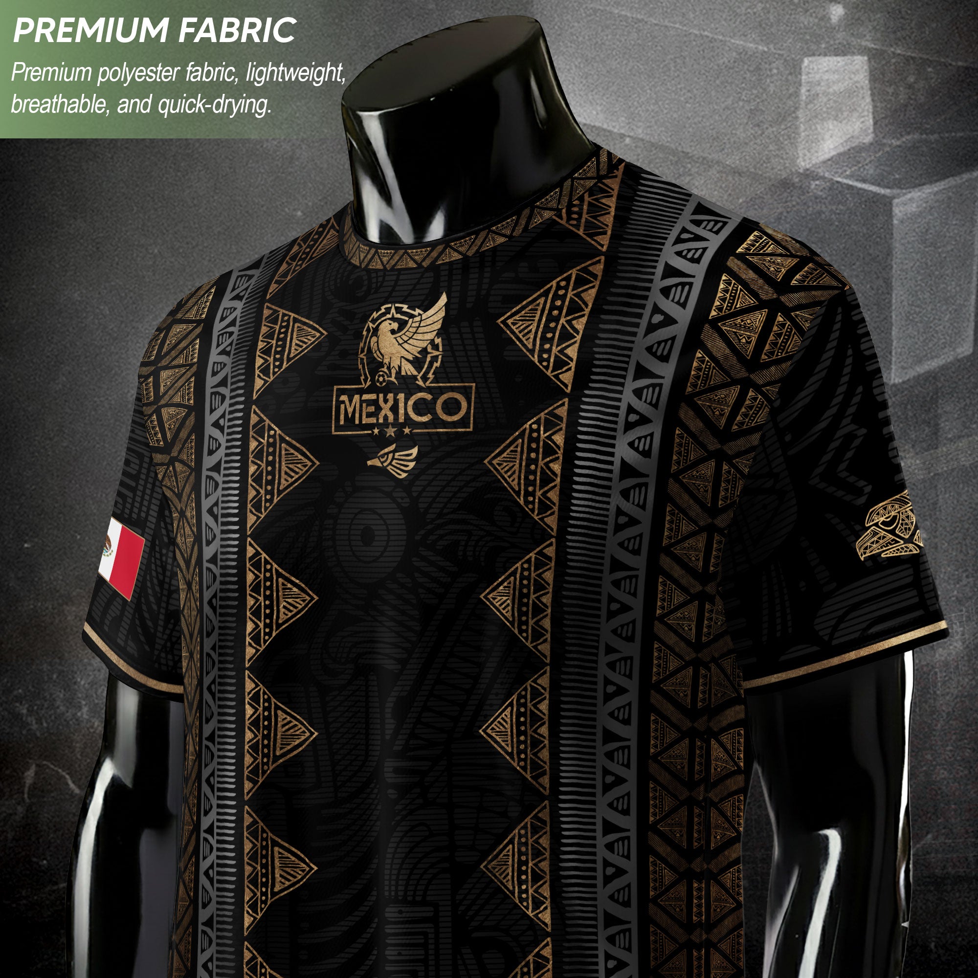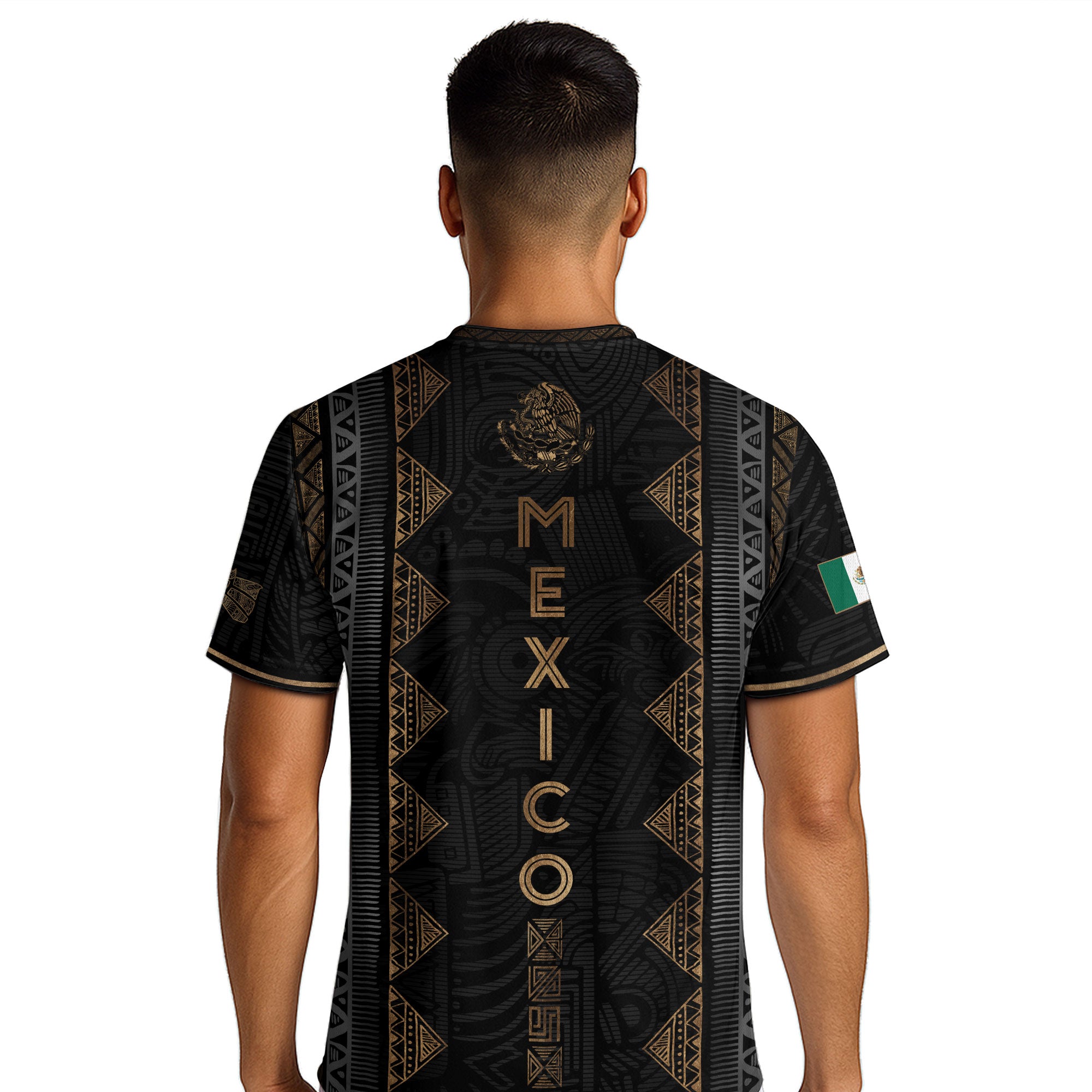Featuring tribal Aztec patterns in classic black and gold, this jersey honors Mexico’s ancestral roots. Ideal for sport or casual wear, it stands as a bold statement of heritage and national pride.
