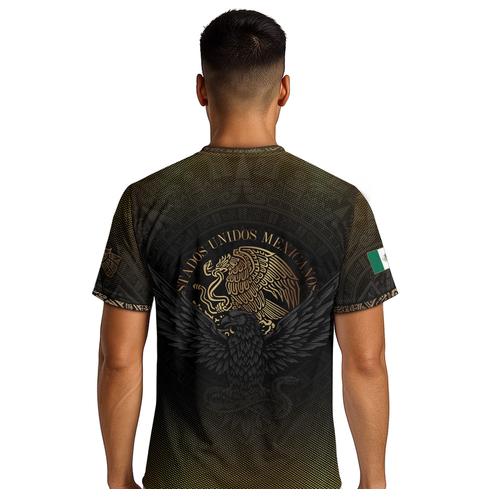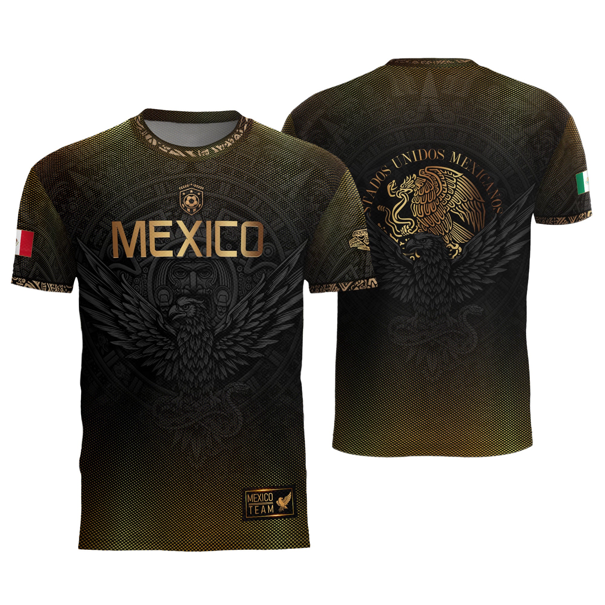 This jersey blends an eagle gradient design with the Aztec Calendar in classic black and gold tones. A powerful representation of ancestral roots and Orgullo Mexicano through dynamic heritage styling.