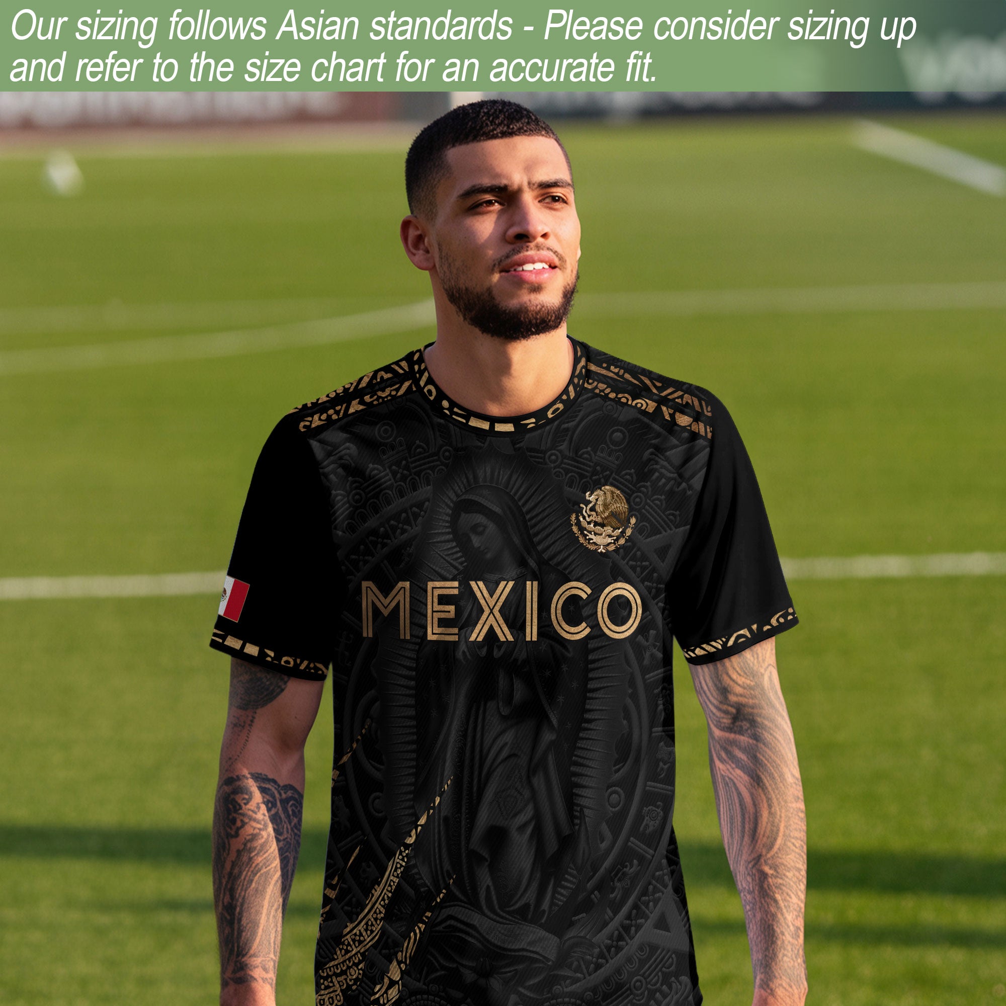 This jersey showcases the Virgin Mary of Guadalupe in a refined black and gold design rooted in Mexican faith and tradition. A meaningful piece that honors devotion, heritage, and national pride through timeless symbolism.
