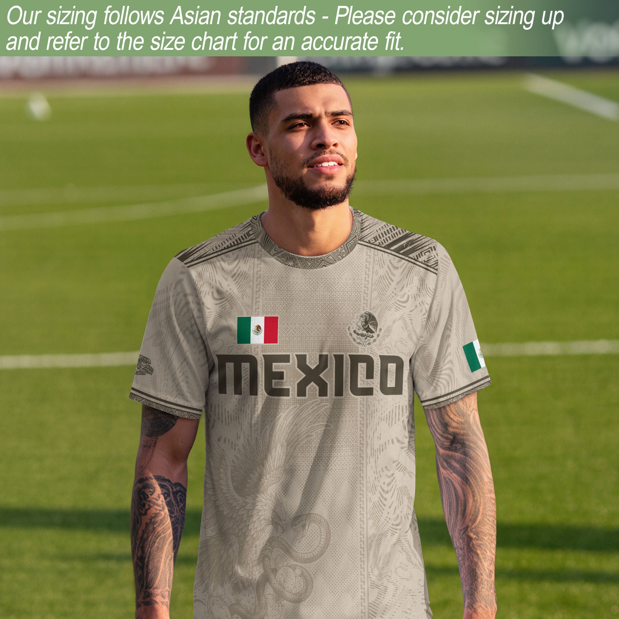 Mexico soccer jersey in beige with detailed Aztec and eagle graphics. Soft, breathable fabric inspired by Mexican heritage.