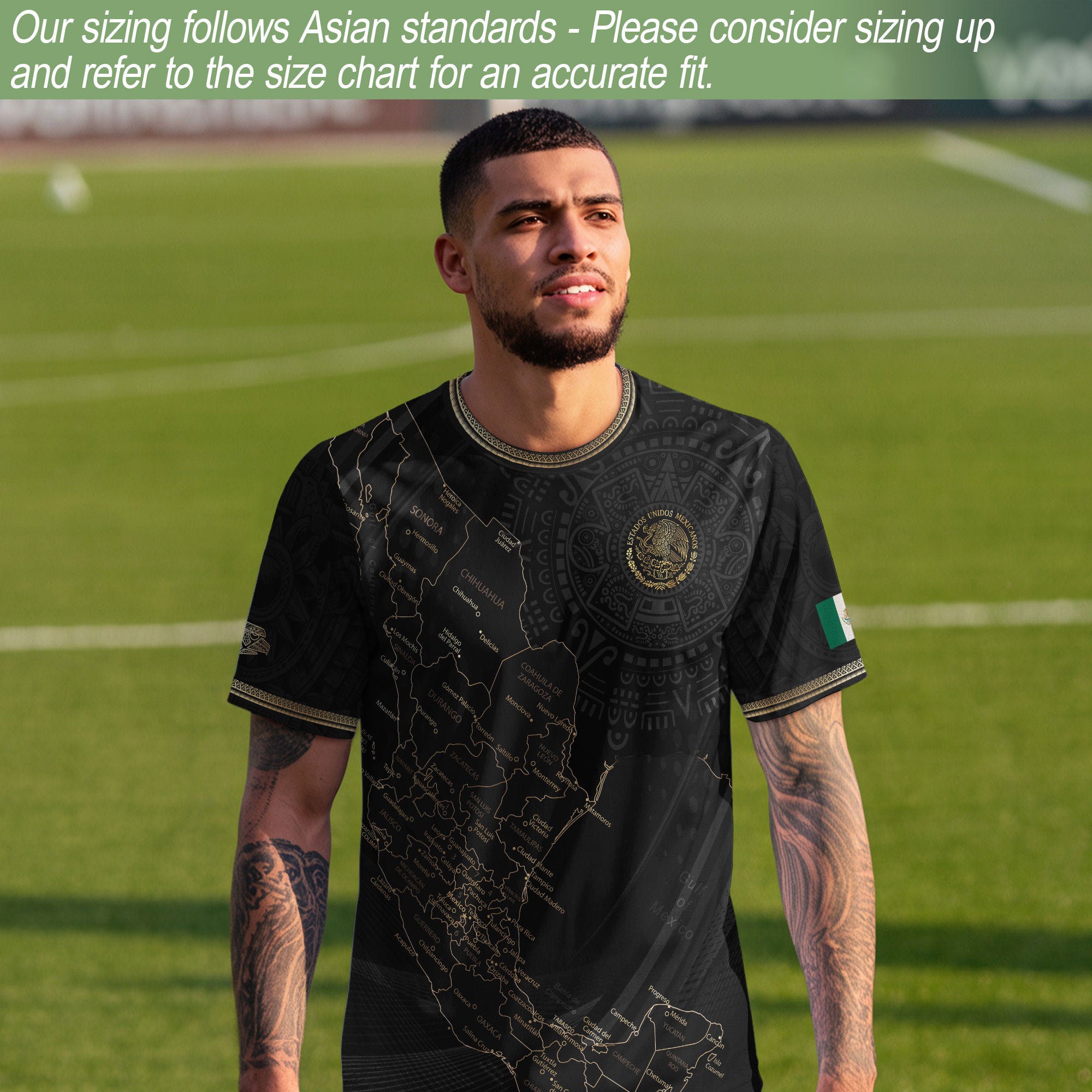 Stand out with this black Mexico soccer jersey featuring a detailed heritage map, Aztec sunstone, and eagle accents. A bold design for true fans.