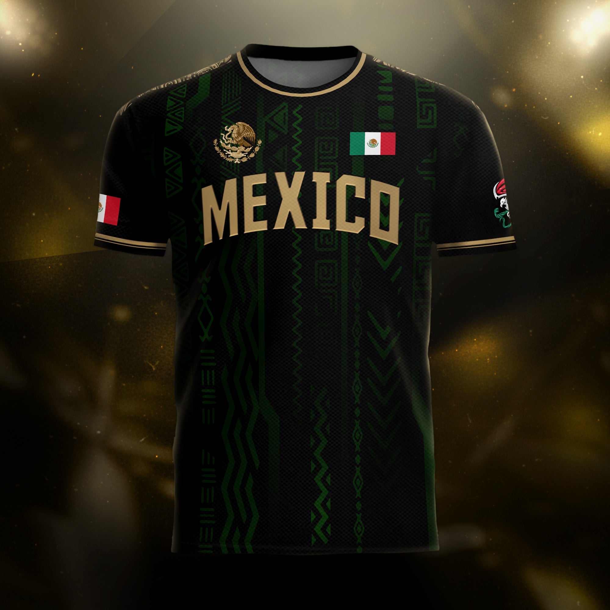 Stylish black and gold Mexico jersey showcasing bold MEXICO print, iconic crest, flag patch, and unique Aztec design elements rooted in tradition.