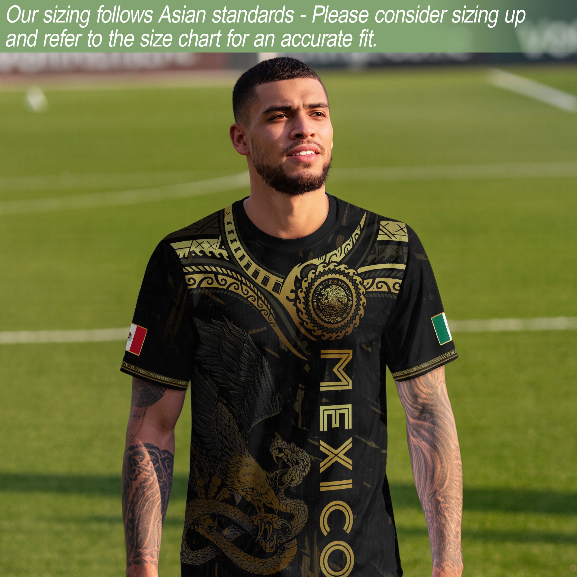 Mexico Soccer Jersey in black gold featuring eagle and serpent with Aztec calendar design. Premium heritage look for fans of Mexican pride.