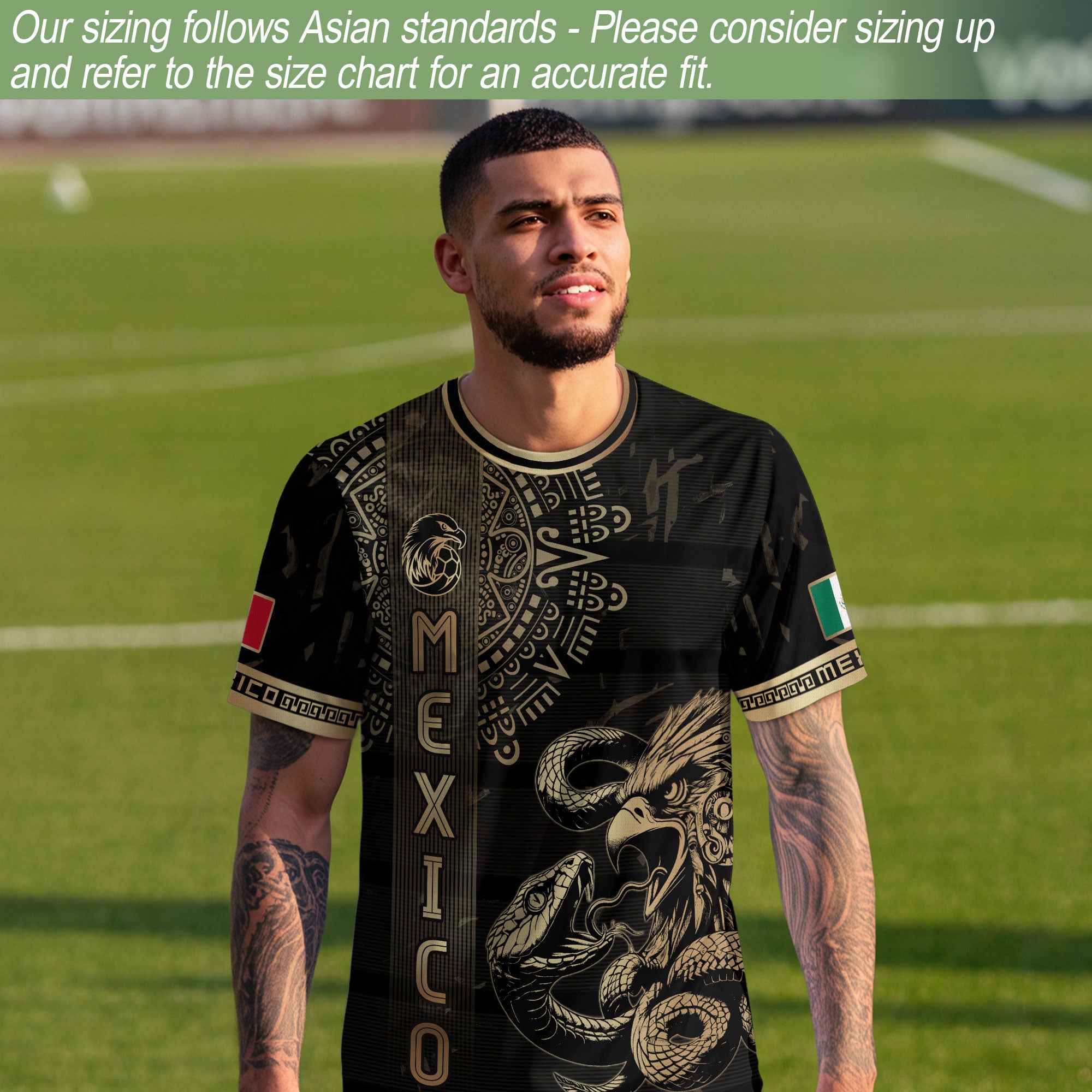 Mexico Soccer Jersey in black gold with eagle and serpent Aztec pattern. Bold heritage design showing Mexican pride and warrior spirit.