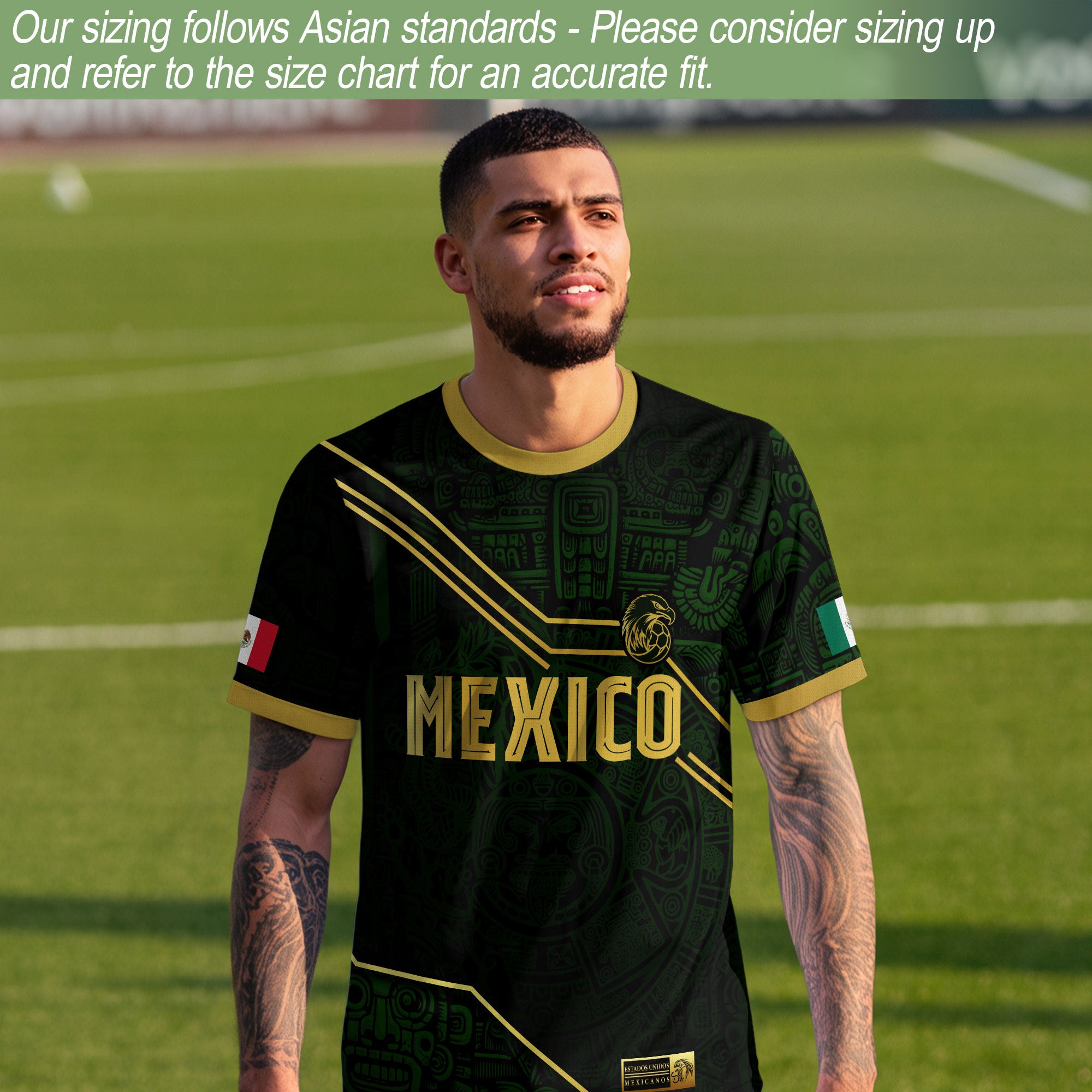 Mexico Soccer Jersey in black green gold Aztec heritage design. Stylish athletic fit with detailed patterns and Mexican national emblem.