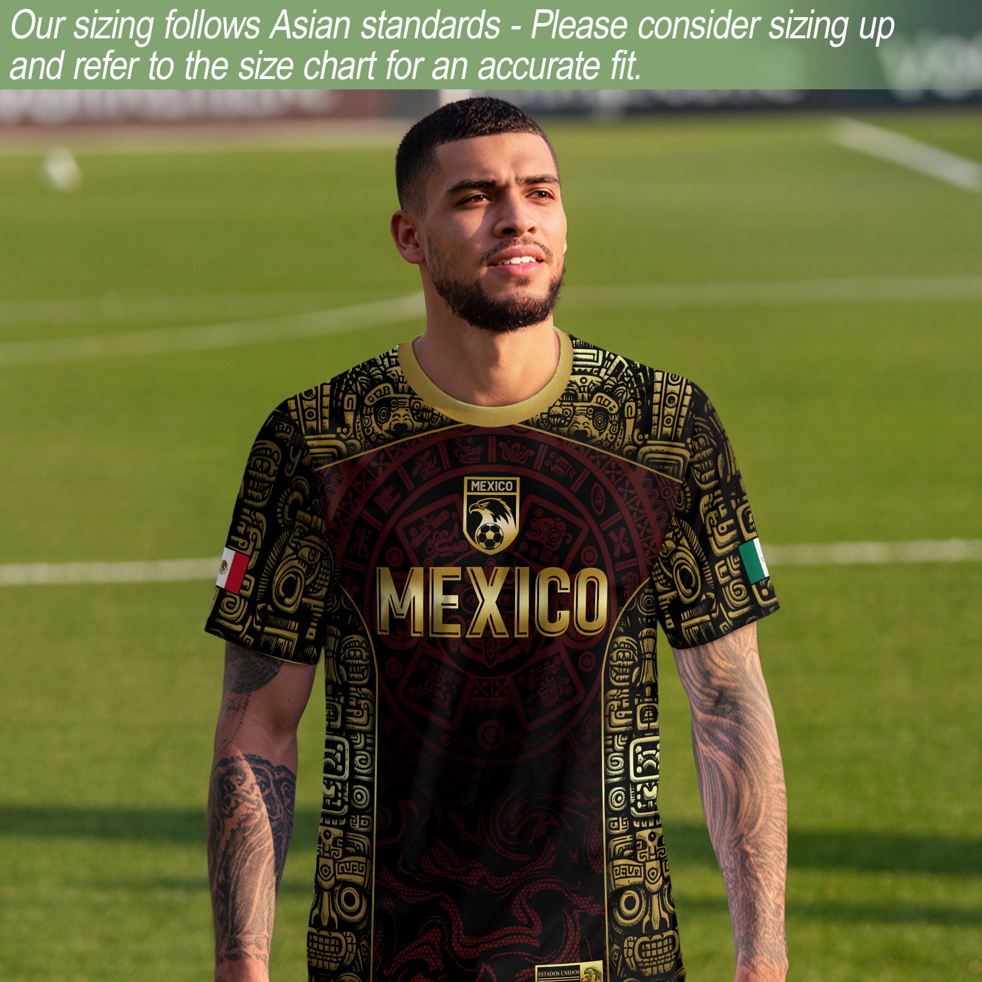 Mexico Soccer Jersey in black red gold with Aztec calendar design. Premium look with detailed cultural patterns and modern athletic fit.
