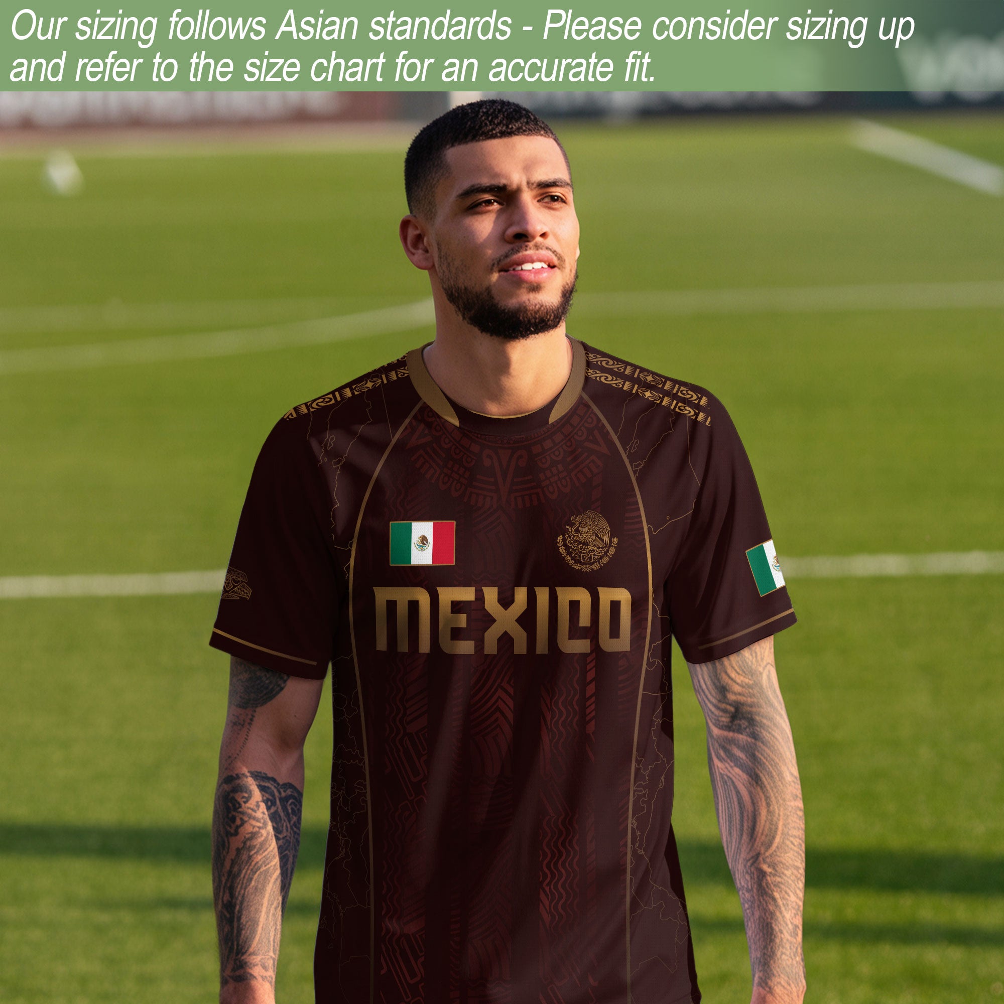 Mexico soccer jersey in burgundy with gold Aztec eagle and heritage symbols. Soft, breathable fabric for comfort and pride.