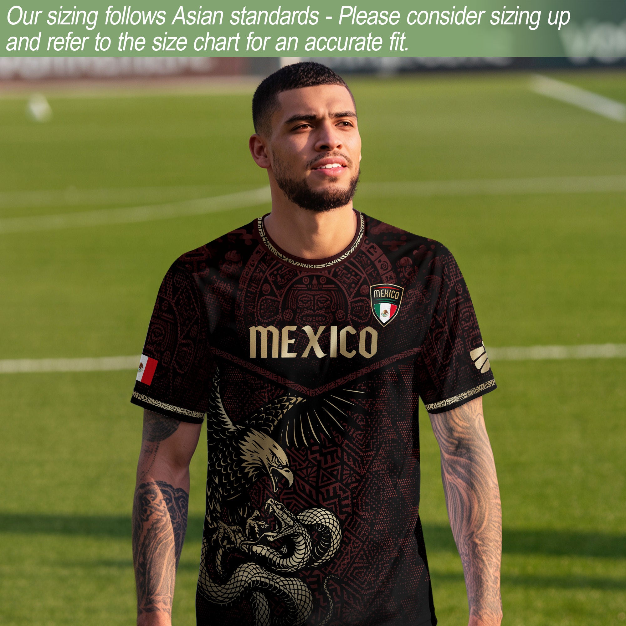 Adult Mexico soccer jersey in maroon and gold with Aztec eagle and serpent design. Celebrate Mexican culture and football spirit in bold style.